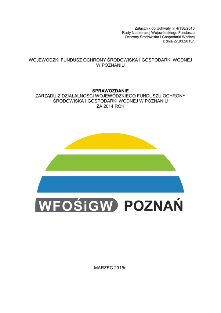 Załącznik do Uchwały nr 4/158/2015 Rady Nadzorczej Wojewódzkiego Funduszu Ochrony Środowiska i Gospodarki Wodnej z dnia 27.03.2015r. WOJEWÓDZKI FUNDUSZ OCHRONY ŚRODOWISKA I GOSPODARKI WODNEJ W POZNANIU SPRAWOZDANIE ZARZĄDU Z DZIAŁALNOŚCI WOJEWÓDZKIEGO FUNDUSZU OCHRONY ŚRODOWISKA I GOSPODARKI WODNEJ W POZNANIU ZA 2014 ROK MARZEC 2015r. Spis treści Wstęp .................................................................................................................................... 3 I. Informacje ogólne ............................................................................................................... 4 1. Rada Nadzorcza ............................................................................................................ 4 2. Zarząd i Biuro WFOŚiGW .............................................................................................. 5 3. Kontrole zewnętrzne....................................................................................................... 6 4. Audyt wewnętrzny .......................................................................................................... 6 5. Współpraca z Narodowym Funduszem Ochrony Środowiska i Gospodarki Wodnej oraz wojewódzkimi funduszami .................................................................................................. 7 II. Działalność statutowa. Pomoc finansowa ze środków WFOŚiGW ..................................... 8 1. Wnioski o udzielenie pomocy finansowej........................................................................ 8 2. Pożyczki ......................................................................................................................... 9 3. Dotacje ..........................................................................................................................11 4. Przekazanie środków państwowym jednostkom budżetowym .......................................12 5. Dopłaty do oprocentowania kredytów bankowych .........................................................13 6. Spłaty kapitału kredytów bankowych .............................................................................13 7. Kontrole przedsięwzięć dofinansowanych ze środków WFOŚiGW ................................14 8. Efekty rzeczowe i ekologiczne przedsięwzięć finansowanych ze środków WFOŚiGW ..14 III. Realizacja programów operacyjnych wdrażanych przez WFOŚiGW ...............................17 1. Program Operacyjny „Infrastruktura i Środowisko” na lata 2007-2013 ...........................17 2. Wielkopolski Regionalny Program Operacyjny na lata 2007-2013 .................................20 IV. Gospodarka finansowa WFOŚiGW .................................................................................23 1. Stan finansowy WFOŚiGW ...........................................................................................23 2. Przychody i wpływy pieniężne WFOŚiGW .....................................................................23 3. Koszty i rozchody pieniężne WFOŚiGW ........................................................................27 4. Struktura składników majątkowych WFOŚiGW i źródła ich pokrycia .............................29 V. Działalność informacyjno-promocyjna WFOŚiGW ............................................................31 2 Wstęp Wojewódzki Fundusz Ochrony Środowiska i Gospodarki Wodnej w Poznaniu (zwany dalej WFOŚiGW) od 22 lat wspiera finansowo przedsięwzięcia w ochronie środowiska i gospodarce wodnej w województwie wielkopolskim, zgodnie ze swoim celem strategicznym którym jest poprawa stanu środowiska i zrównoważone gospodarowanie jego zasobami poprzez stabilne, skuteczne i efektywne wspieranie przedsięwzięć i inicjatyw służących środowisku w województwie wielkopolskim. Wymiernym efektem działalności WFOŚiGW w 2014 roku był przyrost kapitałów własnych w wysokości ponad 34 mln zł. Spowodowane to było realizacją niższych od zakładanych w planie kosztów i zwiększonych od zakładanych w planie przychodów. W 2014 roku kontynuowano proces racjonalizacji kosztów działania biura i organów WFOŚiGW. Efekt odzwierciedlają między innymi niższe od zakładanych: − koszty działalności organów i biura (86% zakładanych wartości), − koszty finansowe (około 82% zakładanych wartości), − pozostałe koszty operacyjne (zaledwie 1% zakładanych wartości). Bieżąca działalność WFOŚiGW w 2014 roku koncentrowała się na efektywnej realizacji zadań i celów statutowych polegających w głównej mierze na udzielaniu pożyczek, dotacji, dopłat do oprocentowania kredytów bankowych, spłat kapitału kredytów bankowych, a także przyznawaniu nagród za działalność na rzecz ochrony środowiska i gospodarki wodnej. Ponadto kontynuowano wdrażanie osi priorytetowych I – Gospodarka wodnościekowa i II – Gospodarka odpadami i ochrona powierzchni ziemi Programu Operacyjnego Infrastruktura i Środowisko na lata 2007-2013 oraz Priorytetu III Środowisko przyrodnicze Wielkopolskiego Regionalnego Programu Operacyjnego na lata 2007-2013, dla których WFOŚiGW pełni funkcję instytucji wdrażającej/pośredniczącej. Roczne sprawozdanie finansowe WFOŚiGW, zgodnie z § 9 Rozporządzenia Rady Ministrów z dnia 16 listopada 2010r. w sprawie gospodarki finansowej Narodowego Funduszu Ochrony Środowiska i Gospodarki Wodnej i wojewódzkich funduszy ochrony środowiska i gospodarki wodnej (Dz. U. Nr 226 z dnia 30 listopada 2010r.), zostało poddane badaniu przez biegłego rewidenta wybranego przez Radę Nadzorczą WFOŚiGW Uchwałą Nr 23/145/2014 z dnia 30 października 2014r. – (PKF Consult Sp. z o.o., ul. Orzycka 6 lok. 1B, 02-695 Warszawa). W opinii biegłego rewidenta przeprowadzającego badanie w imieniu PKF Consult Sp. z o.o. „uzyskane przez Biegłego Rewidenta dowody badania stanowią wystarczającą i odpowiednią podstawę do wyrażenia przez Bieg