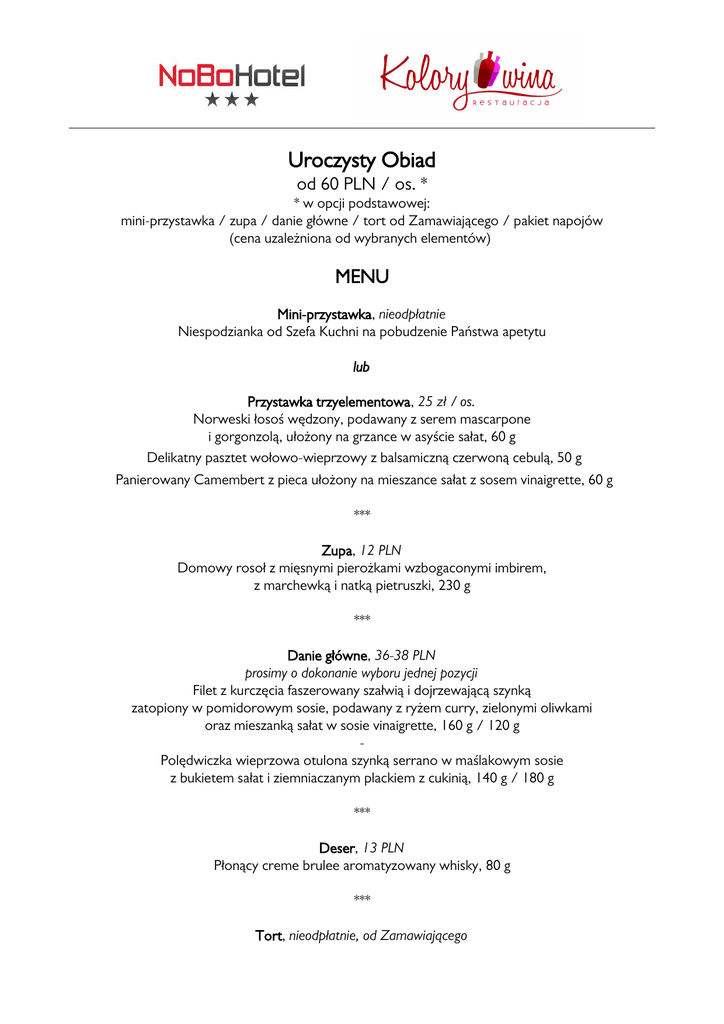 Uroczysty Obiad od 60 PLN / os. * * w opcji podstawowej: mini-przystawka / zupa / danie główne / tort od Zamawiającego / pakiet napojów (cena uzależniona od wybranych elementów) MENU Mini-przystawka, nieodpłatnie Niespodzianka od Szefa Kuchni na pobudzenie Państwa apetytu lub Przystawka trzyelementowa, 25 zł / os. Norweski łosoś wędzony, podawany z serem mascarpone i gorgonzolą, ułożony na grzance w asyście sałat, 60 g Delikatny pasztet wołowo-wieprzowy z balsamiczną czerwoną cebulą, 50 g Panierowany Camembert z pieca ułożony na mieszance sałat z sosem vinaigrette, 60 g *** Zupa, 12 PLN Domowy rosoł z mięsnymi pierożkami wzbogaconymi imbirem, z marchewką i natką pietruszki, 230 g *** Danie główne, 36-38 PLN prosimy o dokonanie wyboru jednej pozycji Filet z kurczęcia faszerowany szałwią i dojrzewającą szynką zatopiony w pomidorowym sosie, podawany z ryżem curry, zielonymi oliwkami oraz mieszanką sałat w sosie vinaigrette, 160 g / 120 g Polędwiczka wieprzowa otulona szynką serrano w maślakowym sosie z bukietem sałat i ziemniaczanym plackiem z cukinią, 140 g / 180 g *** Deser, 13 PLN Płonący creme brulee aromatyzowany whisky, 80 g *** Tort, nieodpłatnie, od Zamawiającego MENU DZIECIĘCE Starter, nieodpłatnie Niespodzianka od Szefa Kuchni Zupa, 9 PLN / os. Zupa pomidorowa z makaronem, 200 g Danie główne, 20 PLN / os. Panierowane polędwiczki z kurczaka podane z frytkami i surówką, 100 g / 150 g Deser, 9 PLN / os. Lodowa niespodzianka, 120 g Pakiet napojów bezalkoholowych, 12 PLN / os. *** Pakiet napojów bezalkoholowych, nielimitowane spożycie, 12 PLN / os. Woda mineralna Eden Soki owocowe (jabłkowy, pomarańczowy) Napoje gazowane grupy Pepsi Kawa rozpuszczalna Julius Meinl, selekcja herbat Dilmah *** OPCJE DODATKOWE Oferta Specjalna Apéritif półwytrawne Wino musujące Mont Blanc, 125 ml 6 PLN / os. lub Molekularna Szarlotka [Żubrówka, sok jabłkowy, suchy lód], 200 ml 10 PLN / os. Kawa Julius Meinl z ekspresu ciśnieniowego nieograniczone spożycie 5 PLN / os. Pokaz gastronomii molekularnej sorbet-niespodzianka przygotowany na żywo z użyciem ciekłego azotu, około 100 g 19 PLN / os. Stół deserowo-owocowy Selekcja Szefa Kuchni, (m.in. szarlotka, czekoladowy naleśnik z sosem kajmakowym, ciastka koktajlowe, sezonowe owoce), łącznie około 90 g 15 PLN / os. Trzeci posiłek gorący podany o wyznaczonej porze Delikatny żurek na tradycyjnym zakwasie z jajkiem i kiełbasą, 230 g lub Zupa gulaszowa, 230 g 12 PLN / os. *** ALKOHOLE Oferta Specjalna Wino półwytrawne 49 zł / but. 0,75 l białe i czerwone Portium Selecció (DO Catalunya, Espana) Wino wytrawne 49 PLN / but. 0,75 l białe Chardonnay, czerwone Shiraz (Don Tomas, Argentina) Wino wytrawne 59 PLN / but. 0,75 l białe Sauvignon Blanc 2012, czerwone Cabernet Sauvignon 2012 (Augustinos, Chile) Wina polskie 99 PLN / but. 0,75 l białe półwytrawne Riesling 'Liryczny' 2012 (Stara Winna Góra, woj. lubuskie) czerwone wytrawne Czerwone Talary 2012 (Winnica Talary, woj. lubuskie) Wódka 59 PLN / but. 0,5 l Wyborowa lub Smirnoff Vladimir Dla Państwa Gości proponujemy noclegi w specjalnych cenach: 150 PLN / pokój jednoosobowy ze śniadaniem oraz 180 PLN / pokój dwuosobowy ze śniadaniem. Wszystkie ceny zawierają VAT. Serwis naszych Gości nie jest doliczany do rachunku. Do rachunków regulowanych kartą płatniczą doliczamy równowartość 2%. Dołożymy wszelkich starań, aby Wydarzenie tego Dnia spełniło Państwa oczekiwania i odbyło się na najwyższym poziomie. NoBo Hotel*** Łódź, Restauracja „Kolory Wina” 91-357 Łódź, ul. Liściasta 86 / al. Włókniarzy, www.nobohotel.pl, www.kolory-wina.pl, tel.: 604 613 746 Uroczyste Przyjęcie 105 PLN / os. [menu dziecięce 50 PLN / os.] MENU UROCZYSTY OBIAD/KOLACJA SERWOWANA Mini-przystawka Niespodzianka od Szefa Kuchni na pobudzenie Państwa apetytu Pierwszy posiłek gorący Domowy rosół z mięsnymi pierożkami wzbogaconymi imbirem, z marchewką i natką pietruszki, 230 g Drugi posiłek gorący Filet z kurczęcia faszerowany szałwią i dojrzewającą szynką zatopiony w pomidorowym sosie, podawany z ryżem curry, zielonymi oliwkami oraz mieszanką sałat w sosie vinaigrette, 160 g / 120 g Deser Szarlotka wg naszej receptury skropiona piernikowym syropem podana na ciepło z lodami o smaku 'zabaglione', 120 g *** Zakąski zimne Tuszka śledzia podana w oliwie z cebulką i kaparami, 50 g Mus drobiowy pieczony z warzywami, otulony w boczek wędzony, 50 g Półmisek selekcjonowanych wędlin i serów, 70 g Schab wieprzowy z pieczarkami i żurawiną, 50 g Selekcja pieczywa, masła i sosów *** Tort * podany o wyznaczonej przez Państwa godzinie * tort po stronie Zamawiającego *** MENU DZIECIĘCE Starter Niespodzianka od Szefa Kuchni Zupa Zupa pomidorowa z makaronem, 200 g Danie główne Panierowane polędwiczki z kurczaka podane z frytkami i surówką, 100 g / 150 g Deser Lodowa niespodzianka, 120 g *** Pakiet napojów bezalkoholowych zawarte w cenie menu, nieograniczone spożycie Woda mineralna Eden Soki owocowe (jabłkowy, pomarańczowy) Napoje gazowane grupy Pepsi Kawa rozpuszczalna Julius Meinl, selekcja herbat Dilmah *** OPCJE DODATKOWE Oferta Specjalna Apéritif półwytrawne Wino musujące Mont Blanc, 125 ml 6 PLN / os. lub Molekularna Szarlotka [Żubrówka, sok jabłkowy, suchy lód], 200 ml 10 PLN / os. Kawa Julius Meinl z ekspresu ciśnieniowego nieograniczone spożycie 5 PLN / os. Pokaz gastronomii molekularnej sorbet-niespodzianka przygotowany na żywo z użyciem ciekłego azotu, około 100 g 19 PLN / os. Stół deserowo-owocowy Selekcja Szefa Kuchni, (m.in. szarlotka, czekoladowy naleśnik z sosem kajmakowym, ciastka koktajlowe, sezonowe owoce), łącznie około 90 g 15 PLN / os. Trzeci posiłek gorący podany o wyznaczonej porze Delikatny żurek na tradycyjnym zakwasie z jajkiem i kiełbasą, 230 g lub Zupa gulaszowa, 230 g 12 PLN / os. *** ALKOHOLE Oferta Specjalna Wino półwytrawne 49 zł / but. 0,75