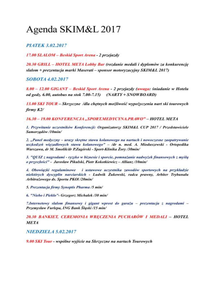 Agenda SKIM&L 2017 PIATEK 3.02.2017 17.00 SLALOM – Beskid Sport Arena - 2 przejazdy 20.30 GRILL – HOTEL META Lobby Bar (rozdanie medali i dyplomów za konkurencję slalom + prezentacja marki Maserati – sponsor motoryzacyjny SKIM&L 2017) SOBOTA 4.02.2017 8.00 – 12.00 GIGANT – Beskid Sport Arena - 2 przejazdy (uwaga: śniadanie w Hotelu od godz. 6.00, autobus na stok 7.00-7.15) (NARTY + SNOWBOARD) 13.00 SKI TOUR – Skrzyczne /dla chętnych możliwość wypożyczenia nart ski tourowych firmy K2/ 16.30 – 19.00 KONFERENCJA „SPORT.MEDYCYNA.PRAWO” – HOTEL META 1. Przywitanie uczestników Konferencji: Organizatorzy SKIM&L CUP 2017 / Przedstawiciele Samorządów /10min/ 2. „Panel medyczny – urazy skrętne stawu kolanowego na nartach i nowoczesne zaopatrywanie uszkodzeń więzadłowych stawu kolanowego” – /dr n. med. A. Mioduszewski - Ortopedika Warszawa, dr M. Smolik/dr P.Zagórski - Sport-Klinika Żory /30min/ 3. "QUIZ z nagrodami - ryzyko w biznesie i sporcie, pomnażanie nadwyżek finansowych z myślą o przyszłości" - Jarosław Pikulski, Piotr Kokotkiewicz – Allianz /10min/ 4. Obowiązki regulaminowe i ustawowe uczestnika zawodów sportowych na przykładzie niektórych dyscyplin narciarskich - Ludwik Żukowski, radca prawny, Arbiter Trybunału Arbitrażowego ds. Sportu PKOl /20min/ 5. Prezentacja firmy Synoptis Pharma /5 min/ 6. "Niebo i Piekło”- Grzegorz Michałek /30 min/ 7.Internetowy slalom finansowy i gigant wprost do garażu – prezentacja z nagrodami – Przemysław Furlepa, ING Bank Śląski /15 min/ 20.30 BANKIET, CEREMONIA WRĘCZENIA PUCHARÓW I MEDALI – HOTEL META NIEDZIELA 5.02.2017 9.00 SKI Tour - wspólne wyjście na Skrzyczne na nartach Tourowych