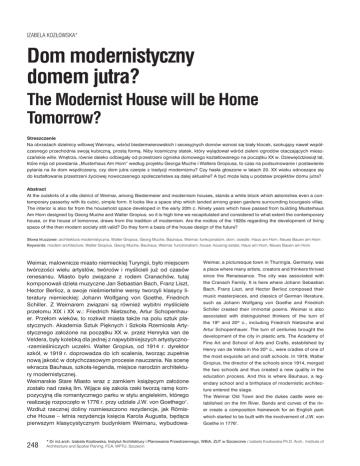 IZABELA KOZŁOWSKA* Dom modernistyczny domem jutra? The Modernist House will be Home Tomorrow? Streszczenie Na obrzeżach dzielnicy willowej Weimaru, wśród biedermeierowskich i secesyjnych domów wznosi się biały klocek, szokujący nawet współczesnego przechodnia swoją kubiczną, prostą formą. Niby kosmiczny statek, który wylądował wśród zieleni ogrodów otaczających mieszczańskie wille. Wnętrza, równie daleko odbiegały od przestrzeni ogniska domowego kształtowanego na początku XX w. Dziewięćdziesiąt lat, które mija od powstania „Musterhaus Am Horn” według projektu Georga Muche i Waltera Gropiusa, to czas na podsumowanie i postawienie pytania na ile dom współczesny, czy dom jutra czerpie z tradycji modernizmu? Czy hasła głoszone w latach 20. XX wieku odnoszące się do kształtowania przestrzeni życiowej nowoczesnego społeczeństwa są dalej aktualne? A być może leżą u podstaw projektów domu jutra? Abstract At the outskirts of a villa district of Weimar, among Biedermeier and modernism houses, stands a white block which astonishes even a contemporary passerby with its cubic, simple form. It looks like a space ship which landed among green gardens surrounding bourgeois villas. The interior is also far from the household space developed in the early 20th c. Ninety years which have passed from building Musterhaus Am Horn designed by Georg Muche and Walter Gropius, so it is high time we recapitulated and considered to what extent the contemporary house, or the house of tomorrow, draws from the tradition of modernism. Are the mottos of the 1920s regarding the development of living space of the then modern society still valid? Do they form a basis of the house design of the future? Słowa kluczowe: architektura modernistyczna, Walter Gropius, Georg Muche, Bauhaus, Weimar, funkcjonalizm, dom, osiedle, Haus am Horn, Neues Bauen am Horn Keywords: modern architecture, Walter Gropius, Georg Muche, Bauhaus, Weimar, functionalism, house, housing estate, Haus am Horn, Neues Bauen am Horn Weimar, malownicze miasto niemieckiej Turyngii, było miejscem twórczości wielu artystów, twórców i myślicieli już od czasów renesansu. Miasto było związane z rodem Cranachów, tutaj komponowali dzieła muzyczne Jan Sebastian Bach, Franz Liszt, Hector Berlioz, a swoje nieśmiertelne wersy tworzyli klasycy literatury niemieckiej: Johann Wolfgang von Goethe, Friedrich Schiller. Z Weimarem związani są również wybitni myśliciele przełomu XIX i XX w.: Friedrich Nietzsche, Artur Schopenhauer. Przełom wieków, to rozkwit miasta także na polu sztuk plastycznych. Akademia Sztuk Pięknych i Szkoła Rzemiosła Artystycznego założone na początku XX w. przez Henryka van de Veldera, były kolebką dla jednej z najwybitniejszych artystyczno-rzemieślniczych uczelni. Walter Gropius, od 1914 r. dyrektor szkół, w 1919 r. doprowadza do ich scalenia, tworząc zupełnie nową jakość w dotychczasowym procesie nauczania. Na scenę wkracza Bauhaus, szkoła-legenda, miejsce narodzin architektury modernistycznej. Weimarskie Stare Miasto wraz z zamkiem książęcym założone zostało nad rzeką Ilm. Wijące się zakola rzeki tworzą ramę kompozycyjną dla romantycznego parku w stylu angielskim, którego realizację rozpoczęto w 1776 r. przy udziale J.W. von Goethego1. Wzdłuż rzecznej doliny rozmieszczono rezydencje, jak Römische House – letnia rezydencja księcia Karola Augusta, będąca pierwszym klasycystycznym budynkiem Weimaru, wybudowa- 248 Weimar, a picturesque town in Thuringia, Germany, was a place where many artists, creators and thinkers thrived since the Renaissance. The city was associated with the Cranach Family. It is here where Johann Sebastian Bach, Franz Liszt, and Hector Berlioz composed their music masterpieces, and classics of German literature, such as Johann Wolfgang von Goethe and Friedrich Schiller created their immortal poems. Weimar is also associated with distinguished thinkers of the turn of the 19th and 20th c., including Friedrich Nietzsche and Artur Schopenhauer. The turn of centuries brought the development of the city in plastic arts. The Academy of Fine Art and School of Arts and Crafts, established by Henry van de Velde in the 20th c., were cradles of one of the most exquisite art and craft schools. In 1919, Walter Gropius, the director of the schools since 1914, merged the two schools and thus created a new quality in the education process. And this is where Bauhaus, a legendary school and a birthplace of modernistic architecture entered the stage. The Weimar Old Town and the dukes castle were established on the Ilm River. Bands and curves of the river create a composition framework for an English park which started to be built with the involvement of J.W. von Goethe in 17761. * Dr inż.arch. Izabela Kozłowska, Instytut Architektury i Planowania Przestrzennego, WBiA, ZUT w Szczecinie / izabela Kozłowska Ph.D. Arch., Institute of Architecture and Spatial Planing, FCA, WPTU, Szczecin nym w latach 1792–1797 przez Johanna Augusta Arensa, czy Letni dom Goethego z otaczającym go ogrodem warzywnym. Park dodatkowo wzbogacają różne formy sztuki ogrodowej: fontanny, rzeźby, pomniki, groty, mostki itd. Na przeciwnym brzegu malowniczego parku, równolegle do głównej osi kompozycyjnej zielonego założenia, poprowadzona została ulica Am Horn. Spacerując spokojną uliczką willową, z jednej strony można kontemplować sielskie, romantyczne widoki Park an der Ilm, z drugiej podziwiać domy i wille zatopione w zieleni, prezentujące różnorodność stylową panującą na przełomie XIX i XX w., jak: Jugendstil (ok. 1890–1910), Heimatstil (od ok. 1905 r.), neoklascycyzm (od ok. 1910 r.), kończąc na powojennym ekspresjonizmie. Niespodziewanie na zamknięciu ulicy Am Horn wyrasta biała, kubiczna sylwetka budynku Musterhaus Am Horn – manifestu architektury funkcjonalistycznej. Pierwszy „dom dla każdego” wzniesiony według zasad m