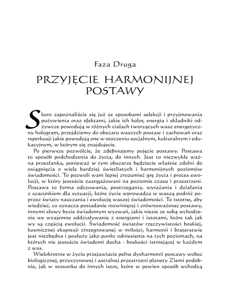 Faza Druga PRZYJĘCIE HARMONIJNEJ POSTAWY S koro zapoznaliście się już ze sposobami selekcji i przyjmowania pożywienia oraz efektami, jakie ich kolor, energia i składniki odżywcze powodują w różnych ciałach tworzących wasz energetyczny hologram, przejdziemy do obszaru waszych postaw i zachowań oraz reperkusji jakie powodują one w otoczeniu socjalnym, kulturalnym i edukacyjnym, w którym się znajdujecie. Po pierwsze pozwólcie, że zdefiniujemy pojęcie postawy. Postawa to sposób podchodzenia do życia, do innych. Jest to niezwykle ważna przesłanka, ponieważ w tym obszarze będziecie właśnie zdolni do osiągnięcia o wiele bardziej świetlistych i harmonijnych poziomów świadomości. To pozwoli wam lepiej zrozumieć grę życia i proces ewolucji, w który jesteście zaangażowani na poziomie czasu i przestrzeni. Postawa to forma odczuwania, postrzegania, wyrażania i działania z szacunkiem dla sytuacji, które życie wprowadza w waszą podróż poprzez światy nauczania i ewolucję waszej świadomości. To istotne, aby wiedzieć, co oznacza posiadanie rozwiniętej i zrównoważonej postawy, innymi słowy bycie świadomym wyzwań, jakie niesie ze sobą wchodzenie we wzajemne oddziaływanie z energiami i istotami, które tak jak wy są częścią ewolucji. Świadomość światów rzeczywistości boskiej, kosmicznej ekspresji zintegrowanej w miłości, harmonii i braterstwie jest niezbędna i posłuży jako punkt odniesienia na tych poziomach, na których nie jesteście świadomi ducha - boskości istniejącej w każdym z was. Wielokrotnie w życiu przejawiacie pełne dysharmonii postawy wobec biologicznej, przyczynowej i astralnej przestrzeni planety Ziemi podobnie, jak w stosunku do innych istot, które w pewien sposób wchodzą 22 ORION, Przewodnik na drodze ku Światłu z wami we wzajemne oddziaływania, co stanowi część waszej nauki. Nie zawsze w odpowiedni sposób odbieracie i przyjmujecie następujące w waszym życiu sytuacje. Czasami reagujecie na impuls ustanawiany przez proces ewolucji negatywną lub nawet nieodpowiedzialną postawą, aby uniknąć odpowiedzialności, którą powinniście na siebie przyjąć. Musicie być świadomi, że sami wcześniej stworzyliście te właśnie okoliczności, aby zapewnić sobie naukę i wewnętrzny wzrost, przynoszący satysfakcję oraz integrację moralnych, etycznych i duchowych wartości, których jeszcze nie przyłączyliście. Dlatego tak istotne jest, abyście wcielili te zasady w swoje życie. Przyniosą wam większe zrozumienie, rozwiniecie nowe wartości i przystosowanie do świata oraz innych istot dzielących z wami życiową przestrzeń. Uzyskacie również świadomość, że dostrojenie się do uniwersalnego prądu miłości, piękna i boskiej harmonii jest wielkim doświadczeniem, czymś co jest jak oddech Nieskończonego Stwórcy rozprzestrzeniający się w całym wszechświecie. W wielu przypadkach byłoby znacznie konstruktywniej nie ulegać złym nawykom oraz być bardziej racjonalnym i spokojnym przy podejmowaniu decyzji ze względu na reperkusje, jakie wasze działania mogą spowodować natychmiast lub w dalszej przyszłości. Najbardziej wskazane jest bycie rozważnym w waszych działaniach, ponieważ to właśnie jest wzorzec tych, którzy zrozumieli już tę lekcję. Wszystko podlega uniwersalnej maszynie; gdy w jakimś punkcie ma miejsce chaos i zamieszanie, powoduje to wielkie kosmiczne powikłania, w których odnajdujemy pogrążonych samych siebie. Świadomość tego poprowadzi was do logicznego zastanowienia się lub spontanicznego myślenia o tym, jaką postawę należy przyjąć, aby wyrazić szacunek dla okoliczności i wydarzeń, w których możecie się znaleźć. Jeśli każdego ranka, zanim stawicie czoła waszym codziennym obowiązkom, zanim przystąpicie do waszych codziennych zajęć, usiądziecie i poświęcicie odrobinę czasu na refleksję i analizę, dostrzeżecie, że jesteście o wiele bardziej zdolni do tego, aby wiedzieć w jaki sposób powinniście skupić uwagę na spodziewanym porządku dnia. Kiedy wasze życie charakteryzuje skupienie uwagi w poszukiwaniu nauki, odmienne od postawy uchylania się lub przeciwstawiania, wasza codzienna perspektywa zdecydowanie zmienia się przynosząc wam satysfakcję, harmonię i wewnętrzne zrozumienie. To z kolei przyniesie spokój i mentalną równowagę. Widzicie więc, że postawa stanowi kluczowy czynnik jeśli chodzi o stawianie czoła doświadczeniom ustanawianym przez wasz Faza druga -Przyjęcie harmonijnej postawy 23 proces ewolucji. Wpływa także na inne poziomy istnienia, jak również na świadomość indywidualną, kolektywną i planetarną. Wszechświat porusza się głównie w oparciu o parametry wibracji i energii pochodzące z jego centrum, które nie ma granic i znajduje się w stanie nieskończonej ekspansji. Oznacza to, że każdy z nas, zawierając złożone elementy wielkiego kosmicznego systemu, może zmienić, jeśli sobie tego życzy, sposób w jaki wchodzi w relacje z okolicznościami. Ta świadomość staje się niezbędna, gdy osiągacie zrozumienie, że jesteście częścią boskości i z tego powodu zostaliście wyposażeni w moc, ograniczaną przez czas i przestrzeń, do tworzenia okoliczności i wydarzeń najbardziej odpowiadającym waszym ewolucyjnym potrzebom. Nie istnieje nic we wszechświecie, co nie podlega zmianom lub nie jest podatne na modyfikację. Skutki i przyczyny znajdują się pod waszą jurysdykcją i kontrolą, jeśli jesteście zdolni do przyjęcia odpowiedzialności za zmianę, wzniesienie i komunię z boskimi planami harmonii, światła i wiecznej duchowej obfitości. Postawa w życiu jest jak nuta w muzycznym utworze, łącząca się z innymi dźwiękami w całość, decydująca o tym, jak będzie brzmiała cała kompozycja. Innymi słowy rządzi ona całą muzyczną strukturą. Poprzez postawę uzyskacie dostęp do modyfikowania elementów - nut, aby brzmiały tak, jak wy tego chcecie