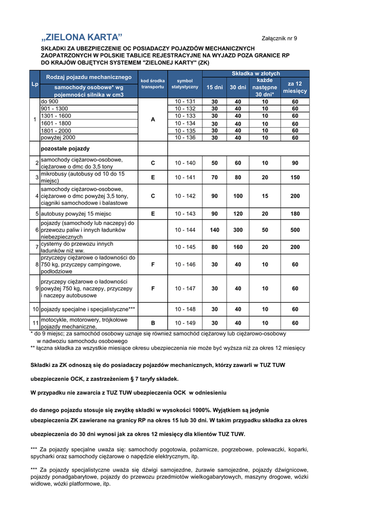 „ZIELONA KARTA” Załącznik nr 9 SKŁADKI ZA UBEZPIECZENIE OC POSIADACZY POJAZDÓW MECHANICZNYCH ZAOPATRZONYCH W POLSKIE TABLICE REJESTRACYJNE NA WYJAZD POZA GRANICE RP DO KRAJÓW OBJĘTYCH SYSTEMEM "ZIELONEJ KARTY" (ZK) Rodzaj pojazdu mechanicznego Lp samochody osobowe* wg pojemności silnika w cm3 do 900 901 - 1300 1301 - 1600 1 1601 - 1800 1801 - 2000 powyżej 2000 Składka w złotych każde za 12 30 dni następne miesięcy 30 dni* 40 10 60 40 10 60 40 10 60 40 10 60 40 10 60 40 10 60 kod środka transportu symbol statystyczny 15 dni A 10 - 131 10 - 132 10 - 133 10 - 134 10 - 135 10 - 136 30 30 30 30 30 30 C 10 - 140 50 60 10 90 E 10 - 141 70 80 20 150 C 10 - 142 90 100 15 200 E 10 - 143 90 120 20 180 10 - 144 140 300 50 500 10 - 145 80 160 20 200 F 10 - 146 30 40 10 60 F 10 - 147 30 40 10 60 10 - 148 30 40 10 60 pozostałe pojazdy samochody ciężarowo-osobowe, ciężarowe o dmc do 3,5 tony mikrobusy (autobusy od 10 do 15 3 miejsc) samochody ciężarowo-osobowe, 4 ciężarowe o dmc powyżej 3,5 tony, ciągniki samochodowe i balastowe 2 5 autobusy powyżej 15 miejsc pojazdy (samochody lub naczepy) do 6 przewozu paliw i innych ładunków niebezpiecznych cysterny do przewozu innych 7 ładunków niż ww. przyczepy ciężarowe o ładowności do 8 750 kg, przyczepy campingowe, podłodziowe przyczepy ciężarowe o ładowności 9 powyżej 750 kg, naczepy, przyczepy i naczepy autobusowe 10 pojazdy specjalne i specjalistyczne*** motocykle, motorowery, trójkołowe B 10 - 149 30 40 10 60 pojazdy mechaniczne, * do 9 miejsc; za samochód osobowy uznaje się również samochód ciężarowy lub ciężarowo-osobowy w nadwoziu samochodu osobowego ** łączna składka za wszystkie miesiące okresu ubezpieczenia nie może być wyższa niż za okres 12 miesięcy 11 Składki za ZK odnoszą się do posiadaczy pojazdów mechanicznych, którzy zawarli w TUZ TUW ubezpieczenie OCK, z zastrzeżeniem § 7 taryfy składek. W przypadku nie zawarcia z TUZ TUW ubezpieczenia OCK w odniesieniu do danego pojazdu stosuje się zwyżkę składki w wysokości 1000%. Wyjątkiem są jedynie ubezpieczenia ZK zawierane na granicy RP na okres 15 lub 30 dni. W takim przypadku składka za okres ubezpieczenia do 30 dni wynosi jak za okres 12 miesięcy dla klientów TUZ TUW. *** Za pojazdy specjalne uważa się: samochody pogotowia, pożarnicze, pogrzebowe, polewaczki, koparki, spycharki oraz samochody ciężarowe o napędzie elektrycznym, itp. *** Za pojazdy specjalistyczne uważa się dźwigi samojezdne, żurawie samojezdne, pojazdy dźwignicowe, pojazdy ponadgabarytowe, pojazdy do przewozu przedmiotów wielkogabarytowych, maszyny drogowe, wózki widłowe, wózki platformowe, itp.