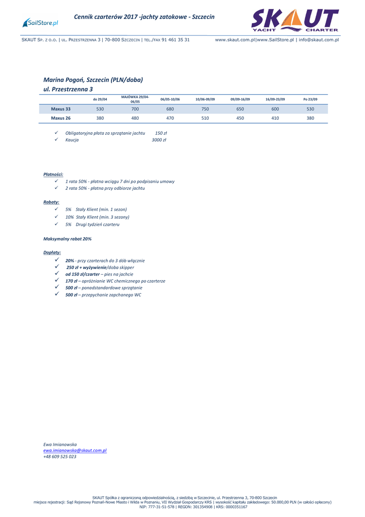 Cennik czarterów 2017 -jachty zatokowe - Szczecin SKAUT SP. Z O.O. | UL. PRZESTRZENNA 3 | 70-800 SZCZECIN | TEL./FAX 91 461 35 31 www.skaut.com.pl|www.SailStore.pl | [email protected] Marina Pogoń, Szczecin (PLN/doba) ul. Przestrzenna 3 do 29/04 MAJÓWKA 29/0406/05 06/05-10/06 10/06-09/09 09/09-16/09 16/09-23/09 Po 23/09 Maxus 33 530 700 680 750 650 600 530 Maxus 26 380 480 470 510 450 410 380 Obligatoryjna płata za sprzątanie jachtu Kaucja 150 zł 3000 zł Płatności: 1 rata 50% - płatna wciągu 7 dni po podpisaniu umowy 2 rata 50% - płatna przy odbiorze jachtu Rabaty: 5% Stały Klient (min. 1 sezon) 10% Stały Klient (min. 3 sezony) 5% Drugi tydzień czarteru Maksymalny rabat 20% Dopłaty: 20% - przy czarterach do 3 dób włącznie 250 zł + wyżywienie/doba skipper od 150 zł/czarter – pies na jachcie 170 zł – opróżnianie WC chemicznego po czarterze 500 zł – ponadstandardowe sprzątanie 500 zł – przepychanie zapchanego WC Ewa Imianowska [email protected] +48 609 525 023 SKAUT Spółka z ograniczoną odpowiedzialnością, z siedzibą w Szczecinie, ul. Przestrzenna 3, 70-800 Szczecin miejsce rejestracji: Sąd Rejonowy Poznań-Nowe Miasto i Wilda w Poznaniu, VII Wydział Gospodarczy KRS | wysokość kapitału zakładowego: 50.000,00 PLN (w całości opłacony) NIP: 777-31-51-578 | REGON: 301354908 | KRS: 0000351167
