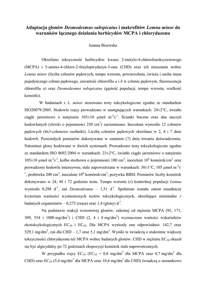Adaptacja glonów Desmodesmus subspicatus i makrofitów Lemna minor do warunków łącznego działania herbicydów MCPA i chlorydazonu Joanna Bisewska Określano toksyczność herbicydów kwasu 2-metylo-4-chlorofenoksyoctowego (MCPA) i 5-amino-4-chloro-2-fenylopirydazyn-3-onu (CHD) oraz ich mieszanin wobec Lemna minor (liczba członów pędowych, tempo wzrostu, powierzchnia, świeża i sucha masa pojedynczego członu pędowego, zawartość chlorofilu a i b w członie pędowym, fluorescencja chlorofilu a) oraz Desmodesmus subspicatus (gęstość populacji, tempo wzrostu, wielkość komórki). W badaniach z L. minor stosowano testy toksykologiczne zgodne ze standardem ISO20079:2005. Hodowle rzęsy prowadzono w następujących warunkach: 24±2°C, światło ciągłe jarzeniowe o natężeniu 105±10 µmol m-2s-1. Ścianki boczne oraz dna naczyń hodowlanych (zlewki o pojemności 250 cm3) zaciemniono. Inoculum wynosiło 12 członów pędowych (4x3-członowe osobniki). Liczbę członów pędowych określano w 2, 4 i 7 dniu hodowli. Pozostałych pomiarów dokonywano w ostatnim (7) dniu trwania doświadczenia. Natomiast glony hodowano w dwóch systemach. Prowadzono testy toksykologiczne zgodne ze standardem ISO 8692:2004 w warunkach: 23±2°C, światło ciągłe jarzeniowe o natężeniu 105±10 µmol m-2s-1, kolba stożkowa o pojemności 100 cm3, inoculum 104 komórek/cm3 oraz prowadzono hodowle intensywne, stale napowietrzane w warunkach: 30±1°C, 105 µmol m-2s1 , probówka 200 cm3, inoculum 106 komórek/cm3, pożywka BBM. Pomiarów liczby komórek dokonywano w 24, 48 i 72 godzinie testu. Tempo wzrostu (r) kontrolnej populacji Lemna wyniosło 0,288 d-1, zaś Desmodesmus – 1,51 d-1. Spełnione zostało zatem zasadnicze kryterium ważności wymienionych testów toksykologicznych, określające minimalne r badanych organizmów – 0,275 (rzęsa) oraz 1,4 (glony) d-1. Na podstawie reakcji wzrostowej glonów, zależnej od stężenia MCPA (95, 171, 309, 554 i 1000 mg/dm3) i CHD (2, 4 i 8 mg/dm3) wyznaczono wartości wskaźników ekotoksykologicznych EC10 i EC50. Dla MCPA wyniosły one odpowiednio: 142,7 oraz 529,1 mg/dm3, zaś dla CHD – 1,7 oraz 5,1 mg/dm3. Wyniki te świadczą o stukrotnie większej toksyczności chlorydazonu niż MCPA wobec badanych glonów. CHD w stężeniu EC50 okazał się być algicydalny po 72 godzinach ekspozycji komórek stale napowietrzanych. W przypadku rzęsy EC10 (EC10 = 0,8 mg/dm3 dla MCPA oraz 0,7 mg/dm3 dla CHD) oraz EC50 (5,4 mg/dm3 dla MCPA oraz 10,4 mg/dm3 dla CHD) świadczą o stosunkowo niewielkich różnicach w toksyczności MCPA i CHD wobec tego makrofitu. Jednocześnie wskazują rzęsę, jako organizm dużo bardziej podatny na szkodliwe działanie MCPA, niż glony. Lemna minor oraz Desmodesmus subspicatus eksponowano na działanie mieszanin MCPA i CHD EC50MCPA+EC10CHD, w następujących kombinacjach: EC10MCPA+EC50CHD, EC10MCPA+EC10CHD, EC50MCPA+EC50CHD. Każda z zastosowanych mieszanin powodowała hamowanie wzrostu obu organizmów nie tylko w porównaniu do kontroli, ale również w stosunku do pojedynczo działających herbicydów. Stopień toksyczności kombinacji zależał przede wszystkim od badanego gatunku, czasu ekspozycji oraz mierzonego parametru. Inhibicję wytwarzania członów pędowych rzęsy przez herbicydy oraz ich mieszaniny notowano po 4 dniach ekspozycji. Natomiast spadek gęstości populacji glonów miał miejsce po 48 godzinie od aplikacji EC10MCPA, EC50MCPA, EC10CHD oraz EC10MCPA+EC10CHD. Pozostałe warianty znacząco redukowały tempo wzrostu zielenicy już między 0 a 24 godziną hodowli. Liczba członów pędowych Lemna była mniejsza o ok. 35 %, zaś tempo wzrostu o ok. 20 % pod wpływem działania EC10MCPA+EC10CHD oraz o ok. 60 % (liczba) i 40-50 % (tempo) w pozostałych mieszaninach. Z kolei liczba komórek Desmodesmus w wariantach EC10MCPA+EC10CHD, EC50MCPA+EC10CHD, EC10MCPA+EC50CHD, EC50MCPA+EC50CHD była mniejsza o odpowiednio ok. 50, 70, 95 i 95 %, zaś tempo ulegało redukcji o ok. 15, 35, 70 i 72 % w stosunku do kontroli. Pod wpływem działania MCPA i CHD oraz ich mieszanin notowano mniejszą powierzchnię członów pędowych rzęsy w porównaniu do kontroli. Mniejszy w stosunku hodowli nietraktowanej przyrost świeżej i suchej masy pojedynczego członu pędowego notowano po ekspozycji Lemna na EC50CHD, EC10MCPA+EC50CHD oraz EC50MCPA+EC50CHD, przy czym człony pędowe w wymienionych mieszaninach charakteryzowały się jednak większym przyrostem masy w stosunku do pojedynczo działającego CHD. EC50CHD przyczyniało się do ok. 80 % stymulacji zawartości chlorofilu a bez wpływu na chlorofil b. Natomiast każda badana mieszanina powodowała znaczący wzrost stosunku chlorofilu a do chlorofilu b. Pod wpływem działania MCPA (niezależnie od stężenia) notowano ok. 40 % wzrostu wartości współczynnika wygaszania niefotochemicznego (qNP). W przeciwieństwie do MCPA, CHD obniżał maksymalną wydajność kwantową PSII prób adaptowanych do ciemności (Fv/Fm), maksymalną wydajność kwantową anten PSII (Fv’/Fm’) oraz rzeczywistą wydajność kwantową prób adaptowanych do ciemności (ΦPSII). CHD powodował także obniżenie wartości współczynnika wygaszania fotochemicznego (qP) i niefotochemicznego (qNP) oraz znaczny wzrost wartości fluorescencji zerowej (F0). Efekty działania CHD silniej zaznaczały się po zastosowaniu wyższego stężenia. Pod wpływem działania mieszanin obu stężeń MCPA z EC10CHD zanotowano jedynie spadek wartości współczynnika qNP (ok. 15 %) oraz wzrost F0 (ponad 57 %) w porównaniu do kontroli. Z kolei pod wpływem działania kombinacji EC10MCPA+EC50CHD i EC50MCPA+EC50CHD wartość F0 wzrosła ponad dwukrotnie, zaś wartości wszystkich pozostałych parametrów były znacząco niższe w porównaniu do kontroli i pojedynczo działającego MCPA oraz wyższe (nieistotnie statystycznie) w stosunku do EC50CHD. Charakterystyczne dla pojedynczo działających EC50MCPA i EC50CHD wobec