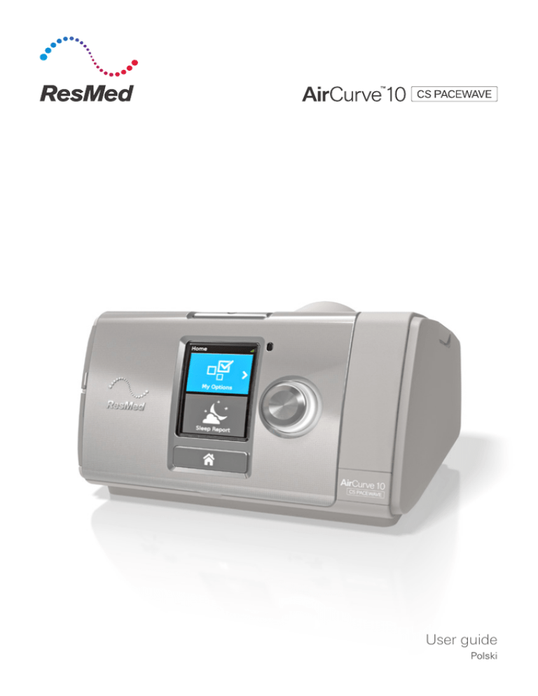 User guide Polski POLSKI Witamy Urządzenie AirCurve™ 10 CS PaceWave™ to urządzenie wytwarzające dodatnie ciśnienie w drogach oddechowych, należące do kategorii respiratorów z adaptacyjnym wsparciem wentylacji. OSTRZEŻENIE • Przed użyciem urządzenia należy przeczytać instrukcję. • Niniejsze urządzenie należy używać zgodnie z przeznaczeniem opisanym w niniejszym podręczniku użytkownika. • Należy przede wszystkim postępować zgodnie z zaleceniami lekarza przepisującego leczenie, a następnie zgodnie z informacjami zawartymi w niniejszym podręczniku użytkownika. AirCurve 10 CS PaceWave – wskazania do użycia Urządzenie AirCurve 10 CS PaceWave jest wskazane do stabilizacji wentylacji u dorosłych pacjentów wykazujących centralny bezdech senny (CSA), postać mieszaną bezdechu sennego i okresowe oddychanie z obturacyjnym bezdechem sennym lub bez obturacyjnego bezdechu sennego. Urządzenie jest przeznaczone do użytku domowego i szpitalnego. Nawilżacz jest przeznaczony do użytku u jednego pacjenta w warunkach domowych oraz do wielokrotnego używania w warunkach szpitalnych/instytucjonalnych. Przeciwwskazania Terapia adaptacyjną serwowentylacją (ASV) jest przeciwwskazana u pacjentów z przewlekłą, objawową niewydolnością krążenia (New York Heart Association 2-4) ze zmniejszoną frakcją wyrzutową lewej komory (LVEF ≤ 45%) i umiarkowanym lub ciężkim dominującym centralnym bezdechem sennym. Dodatnie ciśnienie w drogach oddechowych może być przeciwwskazaniem dla niektórych pacjentów cierpiących na następujące schorzenia: • ciężka pęcherzowa choroba płuc • odma opłucnowa lub odma śródpiersiowa • patologicznie niskie ciśnienie krwi, zwłaszcza jeśli wiąże się ze zmniejszoną objętością krwi krążącej • odwodnienie • wyciek płynu mózgowo-rdzeniowego, niedawny zabieg chirurgiczny czaszki lub uraz. Działania niepożądane Pacjenci powinni zgłaszać lekarzowi zalecającemu leczenie nietypowe bóle w klatce piersiowej, silne bóle głowy lub nasilenie duszności. Ostra infekcja górnych dróg oddechowych może wymagać tymczasowego przerwania leczenia. Podczas leczenia z zastosowaniem urządzenia mogą wystąpić następujące działania niepożądane: • suchość w nosie, ustach lub gardle • krwawienie z nosa • wzdęcie • dyskomfort w uchu lub zatokach Polski 1 • podrażnienie oczu • wysypka na skórze. W skrócie Urządzenie AirCurve 10 obejmuje następujące elementy: • Urządzenie • Rura przewodząca powietrze • Zasilacz • Torba podróżna • Karta SD (już wsunięta). Należy skontaktować się z dostawcą aparatury w sprawie dostępnych akcesoriów do użycia z urządzeniem, obejmujących: • Rurę przewodzącą powietrze (podgrzewaną i nie podgrzewaną): ClimateLineAir™, SlimLine™, Standard • Nawilżacz HumidAir™ • Filtr: Filtr hipoalergiczny, filtr standardowy • Konwerter prądu stałego/przemiennego Air10™ • Czytnik karty SD • Adapter oksymetru Air10 • Adapter USB Air10 Informacje podstawowe 1 Wylot powietrza 5 Ekran 2 Osłona filtru powietrza 6 Pokrywa adaptera 3 Gniazdo zasilacza 7 Pokrywa karty SD 4 Numer seryjny i numer urządzenia 2 Informacje o panelu kontrolnym Przycisk Start/Stop Nacisnąć, aby rozpocząć/zatrzymać terapię. Nacisnąć i przytrzymać przez trzy sekundy, aby przejść do trybu oszczędzania energii. Pokrętło Obrócić, aby poruszać się po menu i nacisnąć, aby wybrać opcję. Obrócić, aby dostosować wybraną opcję i nacisnąć, aby zapisać wprowadzoną zmianę. Przycisk powrotu do ekranu głównego Nacisnąć, aby powrócić do ekranu Home (Głównego). Zależnie od okoliczności, ekran może wyświetlać różne ikony, na przykład: Czas narastania Brak łączności bezprzewodowej Siła sygnału bezprzewodowego (zielony) Tryb samolotowy Transfer bezprzewodowy nie włączony (szary) Polski 3 Konfiguracja 1. Umieścić urządzenie na stabilnej, poziomej powierzchni. 2. Podłączyć złącze zasilania z tyłu urządzenia. Podłączyć jeden koniec kabla zasilania do zasilacza, a drugi do gniazda zasilania. 3. Podłączyć dokładnie rurę przewodzącą powietrze do wylotu powietrza znajdującego się z tyłu urządzenia. 4. Podłączyć maskę z osprzętem do wolnego końca rury przewodzącej powietrze. Szczegółowe informacje znajdują się w instrukcji użytkowania maski. Zalecane maski są dostępne na stronie www.resmed.com. 4 Rozpoczęcie terapii 1. Dopasować maskę. 2. Wcisnąć Start/Stop lub oddychać normalnie, jeżeli uruchomiona jest funkcja SmartStart. Leczenie jest uruchomione, jeżeli wyświetlony jest ekran „Raport Snu”. Pasek ciśnienia pokazuje ciśnienie wdechowe i wydechowe na zielono. Zielony pasek będzie się zwiększał i zmniejszał w miarę wdechów i wydechów. Po krótkim okresie czasu ekran automatycznie stanie się czarny. Można nacisnąć przycisk powrotu do ekranu głównego lub pokrętło, aby ponownie włączyć ekran. Jeśli podczas leczenia nastąpi przerwa w dopływie zasilania, urządzenie automatycznie wznawia leczenie po przywróceniu zasilania. Urządzenie AirCurve 10 jest wyposażone w czujnik światła, który dopasowuje jasność ekranu w oparciu o poziom oświetlenia w pomieszczeniu. Zatrzymywanie terapii 1. Zdjąć maskę. 2. Nacisnąć Start/Stop lub – jeżeli włączona jest opcja SmartStart – praca urządzenia zostanie zatrzymana automatycznie po kilku sekundach. Ekranie Raport Snu zawiera podsumowanie sesji leczenia. Licznik godz. użycia–wskazuje liczbę godzin leczenia, które użytkownik otrzymał podczas ostatniej sesji. Uszcz. maski – wskazuje, jak szczelna jest maska: Dobra szczelność maski. Wymaga dopasowania, patrz Dopasowanie maski. Jeżeli dostawca aparatury ustawił te opcje, będą widoczne następujące elementy: Zdarzenia na godz.–wskazuje liczbę epizodów bezdechu i spłycenia oddechu na godzinę. Więcej inf.–należy obrócić pokrętło, ab