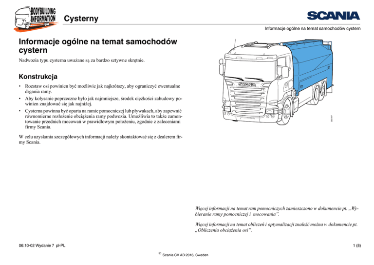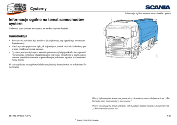 PGRT Cysterny Informacje ogólne na temat samochodów cystern Informacje ogólne na temat samochodów cystern Nadwozia typu cysterna uważane są za bardzo sztywne skrętnie. Konstrukcja 355 097 • Rozstaw osi powinien być możliwie jak najkrótszy, aby ograniczyć ewentualne drgania ramy. • Aby kołysanie poprzeczne było jak najmniejsze, środek ciężkości zabudowy powinien znajdować się jak najniżej. • Cysterna powinna być oparta na ramie pomocniczej lub pływakach, aby zapewnić równomierne rozłożenie obciążenia ramy podwozia. Umożliwia to także zamontowanie przednich mocowań w prawidłowym położeniu, zgodnie z zaleceniami firmy Scania. W celu uzyskania szczegółowych informacji należy skontaktować się z dealerem firmy Scania. Więcej informacji na temat ram pomocniczych zamieszczono w dokumencie pt. „Wybieranie ramy pomocniczej i mocowania”. Więcej informacji na temat obliczeń i optymalizacji znaleźć można w dokumencie pt. „Obliczenia obciążenia osi”. 06:10-02 Wydanie 7 pl-PL 1 (8) © Scania CV AB 2016, Sweden PGRT Cysterny Informacje ogólne na temat samochodów cystern Przegrody w cysternach Ruch cieczy wpływa na właściwości jezdne pojazdu ze względu na to, że środek ciężkości ładunku umieszczonego w zbiorniku może szybko przemieścić się np. na boki podczas pokonywania zakrętów lub wzdłużnie w czasie hamowania. W celu zmniejszenia ryzyka wywrócenia, w cysternach należy zamontować przegrody poprzeczne i wzdłużne. 315 447 Uwaga: Wzdłużne deflektory oleju powinny być zamontowane we wszystkich cysternach o pojemności większej niż 20 m³. Małe cysterny również muszą być wyposażone we wzdłużne deflektory oleju, jeśli mają dużą przednią komorę. Niestabilność pojazdu Unikaj zabudowywania cystern złożonych z jednej dużej przedniej komory i kilku małych umieszczonych za nią. Zależnie od sposobu napełnienia tych komór, może to powodować niestabilność pojazdu podczas jazdy. Jeśli nie da się uniknąć takiego układu, należy napełniać komory zaczynając od przedniej, a opróżniać zaczynając od tylnej. 06:10-02 Wydanie 7 pl-PL 2 (8) © Scania CV AB 2016, Sweden Cysterny PGRT Informacje ogólne na temat samochodów cystern Towary niebezpieczne 150 mm WAŻNE! W niektórych krajach obowiązuje wymóg przeprowadzenia obliczeń i testów stateczności dla pojazdów przeznaczonych do przewozu materiałów niebezpiecznych. 06:10-02 Wydanie 7 pl-PL 353 897 W pojazdach sklasyfikowanych jako pojazdy ADR należy zawsze zachować odstęp 150 mm między tylną ścianą kabiny, włącznie z ekranem cieplnym, jeśli jest zamontowany, a nadwoziem typu cysterna. Jeżeli pojazd jest wyposażony w wysoki wlot powietrza, wspornik złącza przyczepy lub jakiekolwiek inne wyposażenie, odstęp ten należy zachować również między tymi elementami a nadwoziem typu cysterna. 3 (8) © Scania CV AB 2016, Sweden PGRT Cysterny Zalecenia Zalecenia Celem tych zaleceń jest optymalizacja mocowania na podstawie następujących czynników: • Wrażliwość na drgania ramy • Podział obciążenia • Komfort jazdy Informacje ogólne W przypadku zabudowy sztywnej skrętnie mocowania muszą być podatne, aby zapobiec przenoszeniu zbyt dużych momentów siły z ramy podwozia na zabudowę. Można to osiągnąć na kilka sposobów: Szczegółowe informacje o konkretnym podwoziu można znaleźć na rysunku wymiarowym podwozia (ICD) oraz w specyfikacjach podwozia (ICS) pojazdu. • Za pomocą wsporników umożliwiających ruch w płaszczyźnie pionowej • Wykorzystując ramę pomocniczą ze wspornikami umożliwiającymi ruch w górę • Wykorzystując ramę pomocniczą podzieloną na części Rozwiązanie alternatywne bez wykorzystania ramy pomocniczej lub ramy pomocniczej podzielonej na części pozwala zmniejszyć masę, jednak zwiększa wrażliwość na drgania ramy. 06:10-02 Wydanie 7 pl-PL 4 (8) © Scania CV AB 2016, Sweden PGRT Cysterny Zalecenia Mocowanie Nadwozie typu cysterna zazwyczaj spoczywa na punktach podparcia w ramie podwozia, które jednocześnie służą na punkty mocowania wsporników nadwozia. Nie ograniczaj nadmiernie ruchu skrętnego ramy podwozia, aby nie narażać nadwozia i jego wsporników na działanie zbyt dużych sił skrętnych. Więcej informacji na temat mocowania i wsporników elementów nadwozia zamieszczono w dokumencie pt. „Mocowanie zabudowy”. Więcej informacji na temat czujników obciążenia i mocowania zabudowy można znaleźć w dokumencie pt. „Wyposażenie do pomiaru obciążenia”. Gdy rama podwozia ugina się, następuje ruch wzdłużny między zabudową a ramą podwozia. Upewnij się, że wsporniki zapobiegają ruchom poprzecznym zabudowy, ale umożliwiają ruch wzdłużny, aby nie zapobiegać uginaniu ramy. Jednocześnie mocowania muszą zapewniać wymaganą sztywność zarówno ramy podwozia, jak i ramy pomocniczej. 06:10-02 Wydanie 7 pl-PL 5 (8) © Scania CV AB 2016, Sweden PGRT Cysterny Zalecenia Pojazdy bez ramy pomocniczej lub z ramą pomocniczą podzieloną na części • Przednią część zabudowy należy zamontować za pomocą wsporników umożliwiających nieznaczny ruch do góry i możliwy nieznaczny ruch do dołu względem ramy podwozia. Wielkość ruchu zależy od warunków eksploatacji i sztywności zabudowy. Podczas jazdy na nierównych nawierzchniach wymagane są wsporniki umożliwiające większy ruch względem ramy podwozia. • Punkty mocowania i wsporniki należy zaprojektować tak, aby siły z zabudowy nie narażały podłużnic ramy na działanie zbyt dużych sił skrętnych. Zabudowa powinna spoczywać na podłużnicach ramy tak, by kierunek sił nośnych znajdował się na tej samej płaszczyźnie, co czoła podłużnic ramy. 2 3 • Wsporniki elementów nadwozia muszą być umieszczone tak, aby odległość od środka wynosiła nie więcej niż 1500 mm. • Wsporniki elementów nadwozia należy połączyć ze wspornikami resorów lub belkami po