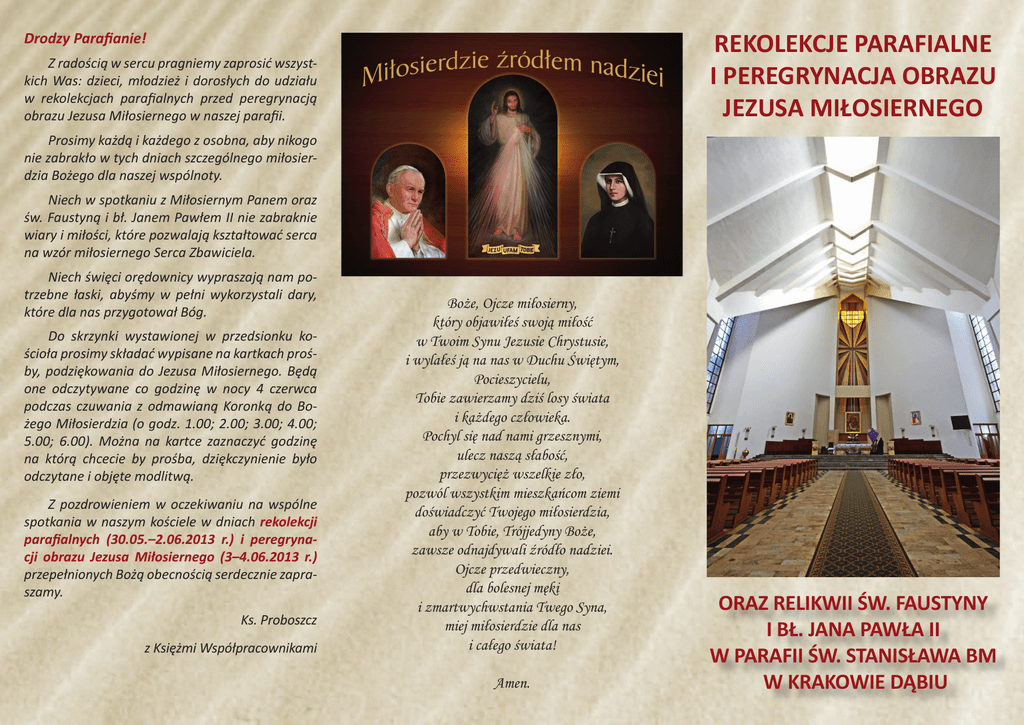 REKOLEKCJE PARAFIALNE I PEREGRYNACJA OBRAZU JEZUSA MIŁOSIERNEGO Drodzy Parafianie! Z radością w sercu pragniemy zaprosić wszystkich Was: dzieci, młodzież i dorosłych do udziału w rekolekcjach parafialnych przed peregrynacją obrazu Jezusa Miłosiernego w naszej parafii. Prosimy każdą i każdego z osobna, aby nikogo nie zabrakło w tych dniach szczególnego miłosierdzia Bożego dla naszej wspólnoty. Niech w spotkaniu z Miłosiernym Panem oraz św. Faustyną i bł. Janem Pawłem II nie zabraknie wiary i miłości, które pozwalają kształtować serca na wzór miłosiernego Serca Zbawiciela. Niech święci orędownicy wypraszają nam potrzebne łaski, abyśmy w pełni wykorzystali dary, które dla nas przygotował Bóg. Do skrzynki wystawionej w przedsionku kościoła prosimy składać wypisane na kartkach prośby, podziękowania do Jezusa Miłosiernego. Będą one odczytywane co godzinę w nocy 4 czerwca podczas czuwania z odmawianą Koronką do Bożego Miłosierdzia (o godz. 1.00; 2.00; 3.00; 4.00; 5.00; 6.00). Można na kartce zaznaczyć godzinę na którą chcecie by prośba, dziękczynienie było odczytane i objęte modlitwą. Z pozdrowieniem w oczekiwaniu na wspólne spotkania w naszym kościele w dniach rekolekcji parafialnych (30.05.–2.06.2013 r.) i peregrynacji obrazu Jezusa Miłosiernego (3–4.06.2013 r.) przepełnionych Bożą obecnością serdecznie zapraszamy. Ks. Proboszcz z Księżmi Współpracownikami Boże, Ojcze miłosierny, który objawiłeś swoją miłość w Twoim Synu Jezusie Chrystusie, i wylałeś ją na nas w Duchu Świętym, Pocieszycielu, Tobie zawierzamy dziś losy świata i każdego człowieka. Pochyl się nad nami grzesznymi, ulecz naszą słabość, przezwycięż wszelkie zło, pozwól wszystkim mieszkańcom ziemi doświadczyć Twojego miłosierdzia, aby w Tobie, Trójjedyny Boże, zawsze odnajdywali źródło nadziei. Ojcze przedwieczny, dla bolesnej męki i zmartwychwstania Twego Syna, miej miłosierdzie dla nas i całego świata! Amen. ORAZ RELIKWII ŚW. FAUSTYNY I BŁ. JANA PAWŁA II W PARAFII ŚW. STANISŁAWA BM W KRAKOWIE DĄBIU Rekolekcje przed Nawiedzeniem Obrazu Jezusa Miłosiernego i relikwii św. s. Faustyny i bł. Jana Pawła II. 7.00 8.30 10.00 13.00 19.00 20.30 30 maja – Czwartek Uroczystość Bożego Ciała - Msza św. z nauką ogólną - Msza św. z nauką ogólną - Msza św. z nauką ogólną procesja Bożego Ciała - Msza św. z nauką ogólną - Msza św. z nauką dla młodzieży - Wieczorne nabożeństwo przygotowania z Apelem Jasnogórskim 31 maja – Piątek 7.00 - Msza św. z nauką ogólną 18.00 - Msza św. z nauką ogólną 20.30 - Wieczorne nabożeństwo przygotowania z Apelem Jasnogórskim 1 czerwca – Sobota 7.00 - nauka ogólna 18.00 - nauka ogólna 20.30 - Wieczorne nabożeństwo przygotowania z Apelem Jasnogórskim 2 czerwca – Niedziela 7.00 - Msza św. z nauką ogólną 8.30 - Msza św. z nauką ogólną 10.00 - Msza św. z nauką ogólną 11.30 - Msza św. z nauką dla dzieci 13.00 - Msza św. z nauką ogólną 19.00- Msza św. z nauką dla młodzieży 20.30 - Wieczorne nabożeństwo przygotowania z Apelem Jasnogórskim Nawiedzenie Obrazu Jezusa Miłosiernego i relikwii św. s. Faustyny i bł. Jana Pawła II 5.00-6.00 - Mieszkańcy ul. Aleja Pokoju numery parzyste 3 czerwca - Poniedziałek 17.00 - Nabożeństwo oczekiwania 6.00-7.00 - Mieszkańcy ul. Aleja Pokoju numery nieparzyste 17.45 - Powitanie Obrazu Pana Jezusa Miłosiernego i relikwii św. Faustyny i bł. Jana Pawła II. 7.00 18.00 - Msza św. koncelebrowana pod przewodnictwem ks. Biskupa wraz z księżmi z Dekanatu Po Mszy św. indywidualna modlitwa parafian i możliwość uczczenia relikwii św. Faustyny i bł. Jana Pawła II przez ucałowanie. 20.00 - Czuwanie pod przewodnictwem Róż Różańcowych (I-V) 21.00 - Msza św. o powołania kapłańskie sprawowana przez Rodaków i kapłanów którzy pracowali w naszej parafii 4.00-5.00 - Mieszkańcy ul. Półkole i Na Szaniec - Msza św. 8.00 - Czuwanie Zespół Charytatywny; Rada Parafialna 9.00 - Msza św.- młodzież Gimnazjum 10.30 - Msza św. - uczniowie Szkoły Podstawowej 12.00 - Msza św. dla chorych, samotnych i starszych z sakramentem namaszczenia 14.30 - Wypominki roczne i modlitwa za Zmarłych 15.00 - Godzina Miłosierdzia 22.00 - Czuwanie pod przewodnictwem Róż Różańcowych (VI-X) 15.30 - Mieszkańcy ul. Świtezianki, Beszcz, Niepołomskiej; Ofiar Dąbia; Dąbskiej 23.00 - Czuwanie pod przewodnictwem Legionu Maryi 16.30 - Msza św. i zawierzenie parafii Miłosierdziu Bożemu 4 czerwca - Wtorek 0.00-1.00 - Mieszkańcy ul. Zwycięstwa 1.00-2.00 - Mieszkańcy ul. Widok 2-14 2.00-3.00 - Mieszkańcy ul. Widok 16-39a + domy prywatne 3.00-4.00 - Mieszkańcy ul. Bajecznej 17.30 - Przekazanie obrazu parafii św. Kazimierza **************************************** Rekolekcje poprowadzi: ks. Czesław Bloch – sercanin ****************************************