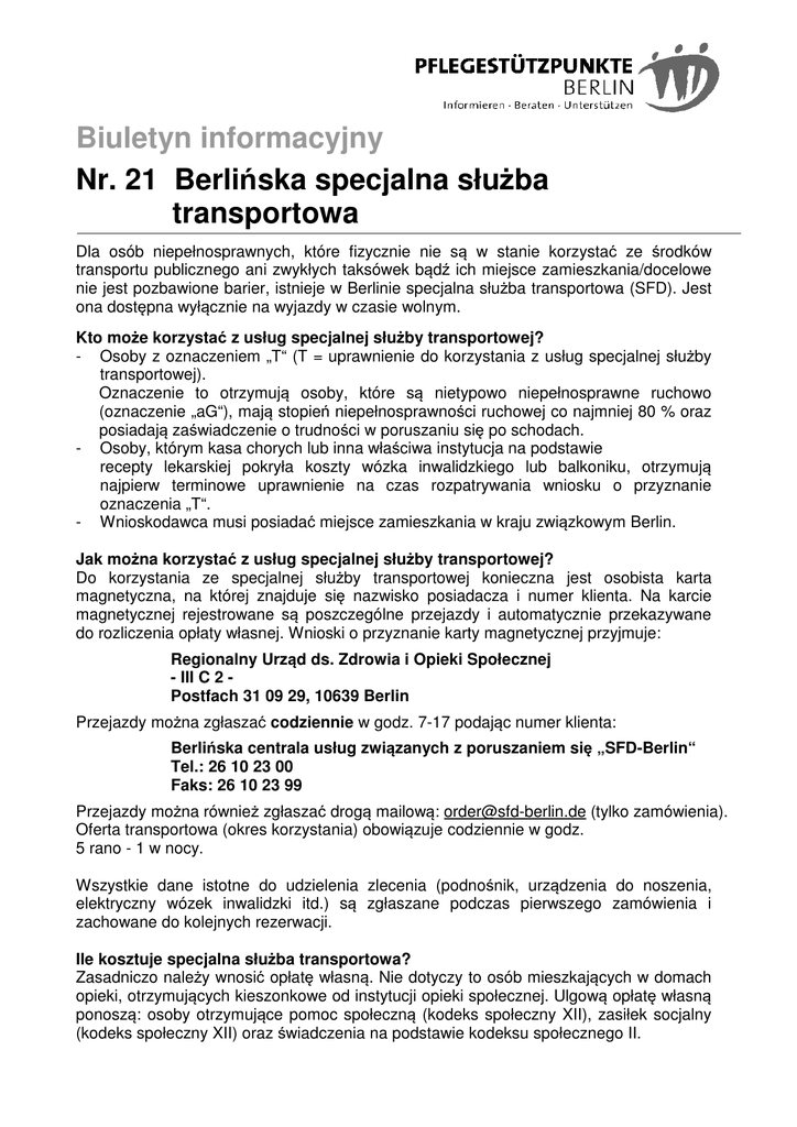 Biuletyn informacyjny Nr. 21 Berlińska specjalna służba transportowa Dla osób niepełnosprawnych, które fizycznie nie są w stanie korzystać ze środków transportu publicznego ani zwykłych taksówek bądź ich miejsce zamieszkania/docelowe nie jest pozbawione barier, istnieje w Berlinie specjalna służba transportowa (SFD). Jest ona dostępna wyłącznie na wyjazdy w czasie wolnym. Kto może korzystać z usług specjalnej służby transportowej? - Osoby z oznaczeniem „T“ (T = uprawnienie do korzystania z usług specjalnej służby transportowej). Oznaczenie to otrzymują osoby, które są nietypowo niepełnosprawne ruchowo (oznaczenie „aG“), mają stopień niepełnosprawności ruchowej co najmniej 80 % oraz posiadają zaświadczenie o trudności w poruszaniu się po schodach. - Osoby, którym kasa chorych lub inna właściwa instytucja na podstawie recepty lekarskiej pokryła koszty wózka inwalidzkiego lub balkoniku, otrzymują najpierw terminowe uprawnienie na czas rozpatrywania wniosku o przyznanie oznaczenia „T“. - Wnioskodawca musi posiadać miejsce zamieszkania w kraju związkowym Berlin. Jak można korzystać z usług specjalnej służby transportowej? Do korzystania ze specjalnej służby transportowej konieczna jest osobista karta magnetyczna, na której znajduje się nazwisko posiadacza i numer klienta. Na karcie magnetycznej rejestrowane są poszczególne przejazdy i automatycznie przekazywane do rozliczenia opłaty własnej. Wnioski o przyznanie karty magnetycznej przyjmuje: Regionalny Urząd ds. Zdrowia i Opieki Społecznej - III C 2 Postfach 31 09 29, 10639 Berlin Przejazdy można zgłaszać codziennie w godz. 7-17 podając numer klienta: Berlińska centrala usług związanych z poruszaniem się „SFD-Berlin“ Tel.: 26 10 23 00 Faks: 26 10 23 99 Przejazdy można również zgłaszać drogą mailową: [email protected] (tylko zamówienia). Oferta transportowa (okres korzystania) obowiązuje codziennie w godz. 5 rano - 1 w nocy. Wszystkie dane istotne do udzielenia zlecenia (podnośnik, urządzenia do noszenia, elektryczny wózek inwalidzki itd.) są zgłaszane podczas pierwszego zamówienia i zachowane do kolejnych rezerwacji. Ile kosztuje specjalna służba transportowa? Zasadniczo należy wnosić opłatę własną. Nie dotyczy to osób mieszkających w domach opieki, otrzymujących kieszonkowe od instytucji opieki społecznej. Ulgową opłatę własną ponoszą: osoby otrzymujące pomoc społeczną (kodeks społeczny XII), zasiłek socjalny (kodeks społeczny XII) oraz świadczenia na podstawie kodeksu społecznego II. Biuletyn informacyjny nr 21 / strona 2 Opłata własna za jeden przejazd wynosi: 1. – 8. przejazd w miesiącu 9. – 16. przejazd w miesiącu od 17. przejazdu w miesiącu 2,05 € ulgowa 1,53 € 5,00 € 3,50 € 10,00 € 7,00 € Jeśli jest więcej niż jedna osoba towarzysząca, opłata za przejazd wynosi 2 euro. Za transport poza granice kraju związkowego (do 5 km) pobierana jest dodatkowa opłata zryczałtowana w wysokości 3 euro. W przypadku anulowania zarezerwowanych już przejazdów w dniu przejazdu pobierane jest odszkodowanie w wysokości 2,05 euro. Co to jest limit na przejazdy taksówkami? Osoby uprawnione do korzystania z transportu specjalnego, ale będące w stanie podróżować zwykłymi taksówkami, mogą korzystać z limitu na przejazdy taksówkami. Rachunki za przejazd taksówką należy opłacać w taksówce (przedpłata). Należy pobrać paragon i zwrócić uwagę, aby kwota była na nim wyraźnie wpisana cyframi i słownie. Wyraźnie czytelna musi być również data przejazdu oraz nazwa korporacji taksówkowej. Paragony z taksówek należy przesyłać zbiorczo co miesiąc w celu zwrotu kosztów do wydziału rozliczeń (SoFa – III C 2) w urzędzie opieki. Za pierwszym razem oprócz numeru klienta należy podać aktualny numer konta bankowego i ewentualnie zaświadczenie o uprawnieniu do ulgowej opłaty własnej lub o zwolnieniu z opłaty własnej. Później wystarczy sam numer klienta. Maksymalnie można w miesiącu dostarczać rachunki w wysokości 110 euro. Opłata własna wynosi ryczałtem miesięcznie 40 euro lub ulgowa 20 euro. Użytkownicy zwolnieni z opłaty własnej otrzymują maksymalnie zwrot kosztów w wysokości 110 euro. Na wypadek pytań i informacji urząd opieki uruchomił telefon dla klientów w sprawie specjalnej służby transportowej: Tel.: (030) 90 229 – 64 33 Godziny pracy: poniedziałek, wtorek godz. 9-15 czwartek godz. 9-18 piątek godz. 9-13 E-mail: [email protected] Kto może korzystać z funduszu socjalnego? Kto z powodu szczególnej sytuacji ekonomicznej lub osobistej nie jest w stanie wnosić opłaty własnej, może złożyć wniosek o dopłaty u referentów urzędu regionalnego ds. osób niepełnosprawnych. Osoba kontaktowa: Steffen Petzerling Tel.: 90 28 16 57, faks: 90 28 21 66, e-mail: [email protected]; Geschäftsstelle des Landesbeirats für Menschen mit Behinderung, Oranienstraße 106, 10969 Berlin. Służymy Państwu radą i udzielamy informacji w poradni opieki www.pflegestuetzpunkteberlin.de Poradnie opieki w Berlinie są finansowane przez berlińskie kasy opiekuńcze i kraj związkowy Berlin Stan: 06/15 polnisch