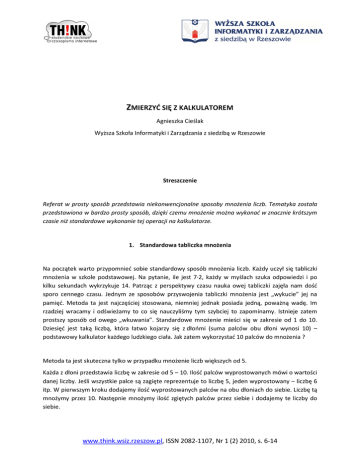 ZMIERZYĆ SIĘ Z KALKULATOREM Agnieszka Cieślak Wyższa Szkoła Informatyki i Zarządzania z siedzibą w Rzeszowie Streszczenie Referat w prosty sposób przedstawia niekonwencjonalne sposoby mnożenia liczb. Tematyka została przedstawiona w bardzo prosty sposób, dzięki czemu mnożenie można wykonać w znacznie krótszym czasie niż standardowe wykonanie tej operacji na kalkulatorze. 1. Standardowa tabliczka mnożenia Na początek warto przypomnieć sobie standardowy sposób mnożenia liczb. Każdy uczył się tabliczki mnożenia w szkole podstawowej. Na pytanie, ile jest 7∙2, każdy w myślach szuka odpowiedzi i po kilku sekundach wykrzykuje 14. Patrząc z perspektywy czasu nauka owej tabliczki zajęła nam dość sporo cennego czasu. Jednym ze sposobów przyswojenia tabliczki mnożenia jest „wykucie” jej na pamięć. Metoda ta jest najczęściej stosowana, niemniej jednak posiada jedną, poważną wadę. Im rzadziej wracamy i odświeżamy to co się nauczyliśmy tym szybciej to zapominamy. Istnieje zatem prostszy sposób od owego „wkuwania”. Standardowe mnożenie mieści się w zakresie od 1 do 10. Dziesięć jest taką liczbą, która łatwo kojarzy się z dłońmi (suma palców obu dłoni wynosi 10) – podstawowy kalkulator każdego ludzkiego ciała. Jak zatem wykorzystać 10 palców do mnożenia ? Metoda ta jest skuteczna tylko w przypadku mnożenie liczb większych od 5. Każda z dłoni przedstawia liczbę w zakresie od 5 – 10. Ilość palców wyprostowanych mówi o wartości danej liczby. Jeśli wszystkie palce są zagięte reprezentuje to liczbę 5, jeden wyprostowany – liczbę 6 itp. W pierwszym kroku dodajemy ilość wyprostowanych palców na obu dłoniach do siebie. Liczbę tą mnożymy przez 10. Następnie mnożymy ilość zgiętych palców przez siebie i dodajemy te liczby do siebie. www.think.wsiz.rzeszow.pl, ISSN 2082-1107, Nr 1 (2) 2010, s. 6-14 Zmierzyć się z kalkulatorem Rysunek 1. Mnożenie za pomocą dłoni. 5∙7=(0+2) ∙10+5∙3=20+15=35 6∙7=(1+2) ∙10+4∙3=30+12=42 8∙9=(3+4)∙10+2∙1=70+2=72 Źródło: http://eduseek.interklasa.pl/artykuly/artykul/ida/2411 Tę samą metodę można przedstawić w inny sposób: Naszym palcom na obu rękach, rozpoczynając od najmniejszego palca idąc w stronę kciuka, przyporządkowujemy liczby od 6 do 10 w następujący sposób: najmniejszy palec – 6, palce serdeczne -7, palce środkowe – 8, palce wskazujące - 9, kciuki - 10. Rysunek 2. Numeracja palców Źródło: Opracowanie własne. Obliczamy 7∙7. W pierwszym kroku łączymy palce odpowiadające liczbie siedem, czyli palce serdeczne. Trzymając dłonie wewnętrzną stroną do siebie sumujemy palce złączone oraz te które mają mniejszą wartość od nich (w naszym przypadku będą to palce małe). Będą one oznaczały ilość dziesiątek. Razem otrzymujemy 4 palce oznaczające dziesiątki, czyli liczbę 40. Następnie mnożymy 7 Zmierzyć się z kalkulatorem ilość pozostałych palców, czyli tych, które są powyżej złączonych palców serdecznych. Trzy na jednej ręce i trzy na drugiej, czyli 3∙3 = 9. Wyniki sumujemy 40+9=49. Numeracja palców u dłoni w przeciwnym kierunku powoduje odwrócenie działań – dodajemy palce złączone i te powyżej nich oraz mnożymy ilość znajdującą się poniżej złączonych palców. Mnożenie przez 9 w inny sposób. Rysunek 3. Układ dłoni Źródło: Opracowanie własne. W pierwszym kroku należy rozłożyć dłonie tak, aby kciuki znajdowały się po zewnętrznych stronach. Następnie numerujemy je tak jak na Rysunku 3. W kolejnym kroku postępujemy zgodnie z zasadą przedstawioną na przykładzie zilustrowanym Rysunkiem 4. Rysunek 4. Mnożenie 9∙2 Źródło: Opracowanie własne. Przypuśćmy, że mnożymy 9∙2. Należy najpierw „zamalować” palec o numerze 2. Następnie obliczymy ile palców od „zamalowanego” znajduje się po lewej stronie. Liczba ta stanowi liczbę dziesiątek iloczynu. Ilość palców znajdująca się po prawej stronie odpowiada za liczbę jedności. Metoda ta jest prawdziwa gdy jednym z czynników iloczynu jest 9. Drugim czynnikiem jest liczba odpowiadająca za „zamalowanego” palca. 8 Zmierzyć się z kalkulatorem Trudność tego typu mnożenia polega jedynie na tym, aby zapamiętać który palec odpowiada za jaką liczbę. 2. Mnożenie liczb dwucyfrowych Można spróbować mnożenia pisemnego – szybkość obliczeń jest niekiedy długa i przeznaczona dla cierpliwych. Na kalkulatorze zajęłoby to kilka sekund. Czas zależy głównie od szybkości wciskania klawiszy. Nie zawsze mamy jednak dostęp do kalkulatora. Co zrobić zatem gdy go nie mamy? Czy ostatecznie skazani jesteśmy na żmudne liczenie pisemne? Otóż okazuje się, że mnożenia tego typu można dokonać bez korzystania z mnożenia pisemnego. Zakres 10 – 20. Pomnóżmy teraz np. 13∙12. Rysunek 5. Mnożenie 13∙12 Źródło: Opracowanie własne. Zadany iloczyn można rozpisać w ten sposób, że drugą liczbę zapiszemy w postaci sumy 10 i pozostałej wartości, tzn. 13∙12=13∙(10+2). Następnie dodajemy do pierwszej liczby drugi składnik naszej sumy (interesuje nas tylko liczba 2), otrzymujemy zatem 13+2=15. Liczba 10 w zapisie ma jedno zero zatem musimy dopisać do liczby z prawej strony jeszcze jedną liczbę będącą iloczynem cyfr jedności, w przedstawionym przykładzie jest to 3∙2=6. Otrzymujemy zatem 13∙12 = 156. 9 Zmierzyć się z kalkulatorem Kolejny przykład to 16∙19. Rysunek 6. Mnożenie 16∙19 Źródło: Opracowanie własne. Działania wykonujemy w ten sam sposób co poprzednio. Do 16 dodajemy 9, otrzymując 25 – jest to pierwsza część wyniku. Następnie mnożymy 6 x 9 i otrzymujemy 54, a ponieważ 19 można rozpisać jako 10 + 9, wiemy że powinniśmy dopisać tylko jedną cyfrę (10 ma jedno zero). Pojawia się kłopot co zrobić z liczbą 5? Otóż zapisujemy liczbę w ten sposób, że jedności idą na miejsce cyfry, którą powinniśmy dopisać, a 5 do