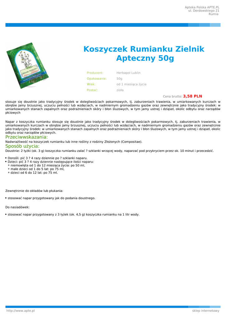Apteka Polska APTE.PL ul. Derdowskiego 21 Rumia Koszyczek Rumianku Zielnik Apteczny 50g Producent: Herbapol Lublin Opakowanie: 50g Wiek: od 1 miesiąca życia Postać: zioła Cena brutto: 3,58 PLN stosuje się doustnie jako tradycyjny środek w dolegliwościach pokarmowych, tj. zaburzeniach trawienia, w umiarkowanych kurczach w obrębie jamy brzusznej, uczuciu pełności lub wzdęciach, w nadmiernym gromadzeniu gazów oraz zewnętrznie jako tradycyjny środek: w umiarkowanych stanach zapalnych oraz podrażnieniach skóry i błon śluzowych, w tym jamy ustnej i dziąseł, okolic odbytu oraz narządów płciowych Napar z koszyczka rumianku stosuje się doustnie jako tradycyjny środek w dolegliwościach pokarmowych, tj. zaburzeniach trawienia, w umiarkowanych kurczach w obrębie jamy brzusznej, uczuciu pełności lub wzdęciach, w nadmiernym gromadzeniu gazów oraz zewnętrznie jako tradycyjny środek: w umiarkowanych stanach zapalnych oraz podrażnieniach skóry i błon śluzowych, w tym jamy ustnej i dziąseł, okolic odbytu oraz narządów płciowych. Przeciwwskazania: Nadwrażliwość na koszyczek rumianku lub inne rośliny z rodziny Złożonych (Compositae). Sposób użycia: Doustnie: 2 łyżki (ok. 3 g) koszyczka rumianku zalać ? szklanki wrzącej wody, naparzać pod przykryciem przez ok. 10 minut i przecedzić. Dorośli: pić 3 ? 4 razy dziennie po ? szklanki naparu. Dzieci: pić 3 ? 4 razy dziennie następujące ilości naparu: niemowlęta od 1 do 12 miesiąca życia: po 50 ml, małe dzieci od 1 do 5 lat: po 75 ml, dzieci od 6 do 12 lat: po 75 ml. Zewnętrznie do okładów lub płukania: stosować napar przygotowany jak do podania doustnego. Do nasiadówek: stosować napar przygotowany z 3 łyżek (ok. 4,5 g) koszyczka rumianku na 1 litr wody. http://www.apte.pl sklep internetowy