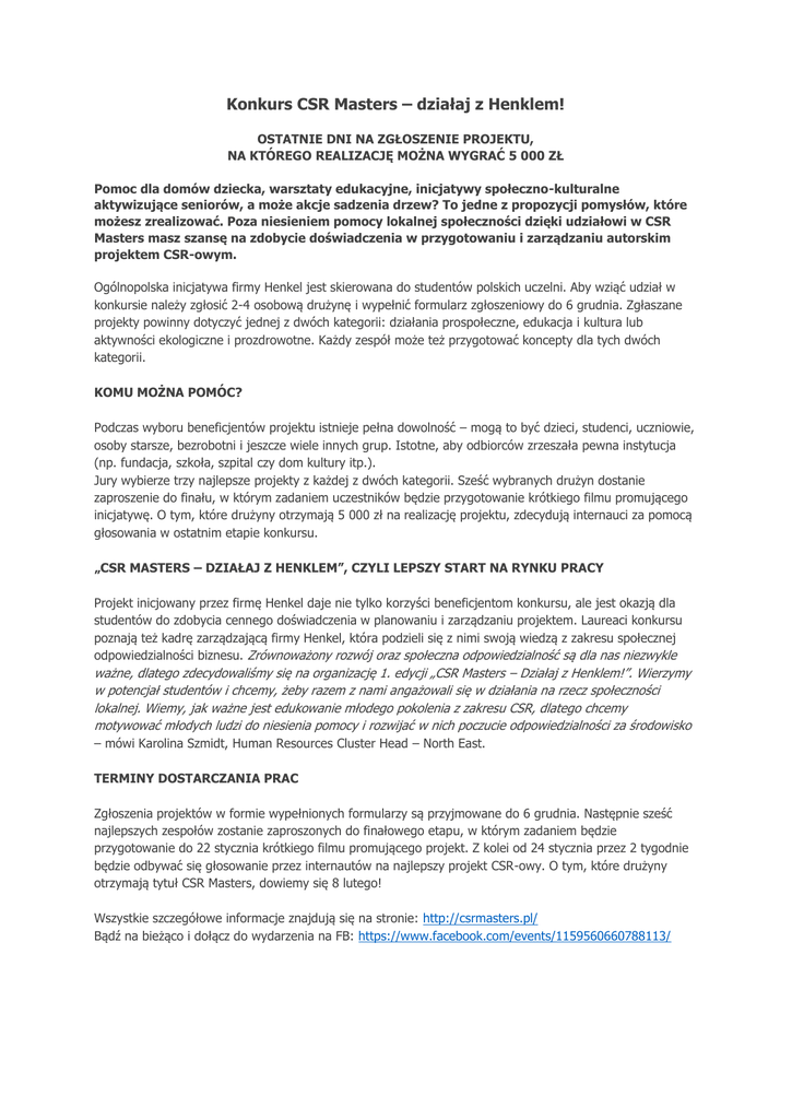 Konkurs CSR Masters – działaj z Henklem! OSTATNIE DNI NA ZGŁOSZENIE PROJEKTU, NA KTÓREGO REALIZACJĘ MOŻNA WYGRAĆ 5 000 ZŁ Pomoc dla domów dziecka, warsztaty edukacyjne, inicjatywy społeczno-kulturalne aktywizujące seniorów, a może akcje sadzenia drzew? To jedne z propozycji pomysłów, które możesz zrealizować. Poza niesieniem pomocy lokalnej społeczności dzięki udziałowi w CSR Masters masz szansę na zdobycie doświadczenia w przygotowaniu i zarządzaniu autorskim projektem CSR-owym. Ogólnopolska inicjatywa firmy Henkel jest skierowana do studentów polskich uczelni. Aby wziąć udział w konkursie należy zgłosić 2-4 osobową drużynę i wypełnić formularz zgłoszeniowy do 6 grudnia. Zgłaszane projekty powinny dotyczyć jednej z dwóch kategorii: działania prospołeczne, edukacja i kultura lub aktywności ekologiczne i prozdrowotne. Każdy zespół może też przygotować koncepty dla tych dwóch kategorii. KOMU MOŻNA POMÓC? Podczas wyboru beneficjentów projektu istnieje pełna dowolność – mogą to być dzieci, studenci, uczniowie, osoby starsze, bezrobotni i jeszcze wiele innych grup. Istotne, aby odbiorców zrzeszała pewna instytucja (np. fundacja, szkoła, szpital czy dom kultury itp.). Jury wybierze trzy najlepsze projekty z każdej z dwóch kategorii. Sześć wybranych drużyn dostanie zaproszenie do finału, w którym zadaniem uczestników będzie przygotowanie krótkiego filmu promującego inicjatywę. O tym, które drużyny otrzymają 5 000 zł na realizację projektu, zdecydują internauci za pomocą głosowania w ostatnim etapie konkursu. „CSR MASTERS – DZIAŁAJ Z HENKLEM”, CZYLI LEPSZY START NA RYNKU PRACY Projekt inicjowany przez firmę Henkel daje nie tylko korzyści beneficjentom konkursu, ale jest okazją dla studentów do zdobycia cennego doświadczenia w planowaniu i zarządzaniu projektem. Laureaci konkursu poznają też kadrę zarządzającą firmy Henkel, która podzieli się z nimi swoją wiedzą z zakresu społecznej odpowiedzialności biznesu. Zrównoważony rozwój oraz społeczna odpowiedzialność są dla nas niezwykle ważne, dlatego zdecydowaliśmy się na organizację 1. edycji „CSR Masters – Działaj z Henklem!”. Wierzymy w potencjał studentów i chcemy, żeby razem z nami angażowali się w działania na rzecz społeczności lokalnej. Wiemy, jak ważne jest edukowanie młodego pokolenia z zakresu CSR, dlatego chcemy motywować młodych ludzi do niesienia pomocy i rozwijać w nich poczucie odpowiedzialności za środowisko – mówi Karolina Szmidt, Human Resources Cluster Head – North East. TERMINY DOSTARCZANIA PRAC Zgłoszenia projektów w formie wypełnionych formularzy są przyjmowane do 6 grudnia. Następnie sześć najlepszych zespołów zostanie zaproszonych do finałowego etapu, w którym zadaniem będzie przygotowanie do 22 stycznia krótkiego filmu promującego projekt. Z kolei od 24 stycznia przez 2 tygodnie będzie odbywać się głosowanie przez internautów na najlepszy projekt CSR-owy. O tym, które drużyny otrzymają tytuł CSR Masters, dowiemy się 8 lutego! Wszystkie szczegółowe informacje znajdują się na stronie: http://csrmasters.pl/ Bądź na bieżąco i dołącz do wydarzenia na FB: https://www.facebook.com/events/1159560660788113/