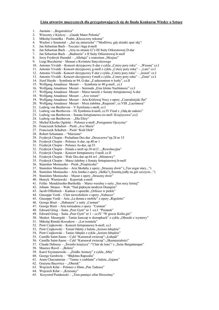 Lista utworów muzycznych dla przygotowujących się do finału Konkursu Wiedzy o Sztuce 1. 2. 3. 4. 5. 6. 7. 8. 9. 10. 11. 12. 13. 14. 15. 16. 17. 18. 19. 20. 21. 22. 23. 24. 25. 26. 27. 28. 29. 30. 31. 32. 33. 34. 35. 36. 37. 38. 39. 40. 41. 42. 43. 44. 45. 46. 47. 48. 49. 50. 51. 52. 53. 54. 55. 56. 57. 58. 59. 60. 61. 62. 63. 64. 65. Anonim – „Bogurodzica” Wincenty z Kielczy – „Gaude Mater Polonia” Mikołaj Gomółka – Psalm „Kleszczmy rekoma” Wacław z Szamotuł – „JuŜ się zmierzcha” /”Modlitwa, gdy dziatki spać idą”/ Jan Sebastian Bach – Toccata i fuga d-moll Jan Sebastian Bach – „Aria na strunie G”z III Suity Orkiestrowej D-dur Jan Sebastian Bach – „Badinerie” z II Suity Orkiestrowej h-moll Jerzy Fryderyk Haendel – „Alleluja” z oratorium „Mesjasz” Luigi Boccherini – Menuet z Kwintetu Smyczkowego Antonio Vivaldi – Koncert skrzypcowy E-dur z cyklu „Cztery pory roku” – „Wiosna” cz.I Antonio Vivaldi - Koncert skrzypcowy g-moll z cyklu „Cztery pory roku” – „Lato” cz.I Antonio Vivaldi - Koncert skrzypcowy F-dur z cyklu „Cztery pory roku” – „Jesień” cz.I Antonio Vivaldi - Koncert skrzypcowy f-moll z cyklu „Cztery pory roku” – „Zima” cz.I Józef Haydn – Symfonia nr 94, G-dur „Z uderzeniem w kotły”, cz.II Wolfgang Amadeusz Mozart – – Symfonia nr 40 g-moll , cz.I Wolfgang Amadeusz Mozart – Serenada „Eine kleine Nachtmusic” cz.I Wolfgang Amadeusz Mozart – Marsz turecki z Sonaty fortepianowej A-dur Wolfgang Amadeusz Mozart – „Ave verum“ Wolfgang Amadeusz Mozart – Aria Królowej Nocy z opery „Czarodziejski flet” Wolfgang Amadeusz Mozart – Msza Ŝałobna „Requiem“, cz.VIII „Lacrimosa“ Ludwig van Beethoven – V Symfonia c-moll, cz.I Ludwig van Beethoven – IX Symfonia d-moll, cz.IV Finał z „Odą do radości” Ludwig van Beethoven – Sonata fortepianowa cis-moll :KsięŜycowa”,cz,I Ludwig van Beethoven – „Dla Elizy“ Michał Kleofas Ogiński – Polonez a-moll „PoŜegnanie Ojczyzny“ Franciszek Schubert – Pieśń „Ave Maria” Franciszek Schubert – Pieśń “Król Olch“ Robert Schumann – “Marzenie“ Fryderyk Chopin - Preludium Des-dur „Deszczowe”op.28 nr 15 Fryderyk Chopin – Polonez A-dur, op.40 nr 1 Fryderyk Chopin – Polonez As-dur, op.53 Fryderyk Chopin – Etiuda c-moll op.10 nr12 , „Rewolucyjna” Fryderyk Chopin – Koncert fortepianowy f-moll, cz.II Fryderyk Chopin – Walc Des-dur op.64 nr1 „Minutowy” Fryderyk Chopin – Marsz Ŝałobny z Sonaty fortepianowej b-moll Stanisław Moniuszko – Pieśń „Prząśniczka” Stanisław Moniuszko – Aria Skołuby z opery „Straszny dwór” („Ten zegar stary...”) Stanisław Moniuszko – Aria Jontka z opery „Halka”(„Szumią jodły na gór szczycie...”) Stanisław Moniuszko – Mazur z opery „Straszny dwór” Henryk Wieniawski – Kujawiak a-moll Feliks Mendelssohn-Bartholdy – Marsz weselny z suity „Sen nocy letniej” Johann Strauss – Walc “Nad pięknym modrym Dunajem” Jacob Offenbach – Kankan z operetki „Orfeusz w piekle” Giuseppe Verdi – Chór niewolników z opery „Nabucco” Giuseppe Verdi – Aria „La donna e mobile” z opery „Rigoletto” George Bizet – „Habanera” z suity „Carmen” George Bizet – Aria torreadora z opery “Carmen” Edward Grieg – Suita „Peer Gynt” nr 1 -cz.I “Poranek” Edward Grieg – Suita „Peer Gynt” nr 1 – cz.IV “W grocie Króla gór” Modest Musorgski – Taniec kurcząt w skorupkach” z cyklu „Obrazki z wystawy” Mikołaj Rimski-Korsakow – „Lot trzmiela” Piotr Czajkowski – Koncert fortepianowy b-moll, cz,I Piotr Czajkowski – Temat Odetty z baletu „Jezioro łabędzie” Piotr Czajkowski – Taniec łabędzi z cyklu „Jezioro łabędzie” Camille Saint-Saens – Cykl “Karnawał zwierząt”-„Łabędź” Camille Saint-Saens – Cykl “Karnawał zwierząt”-„Skamieniałości” Claude Debussy – „Światło księŜyca” /”Clair de lune”/ z „Suite Bergamasque” Maurice Ravel – „Bolero” Karol Szymanowski – „Źródło Aretuzy” z cyklu „Mity” George Gershwin – “Błękitna Rapsodia” Aram Chaczaturian – “Taniec z szablami” z baletu „Gajane” GraŜyna Bacewicz – „Oberek” Wojciech Kilar – Polonez z filmu „Pan Tadeusz” Wojciech Kilar – „Krzesany” Krzysztof Penderecki – „Tren pamięci ofiar Hiroszimy”