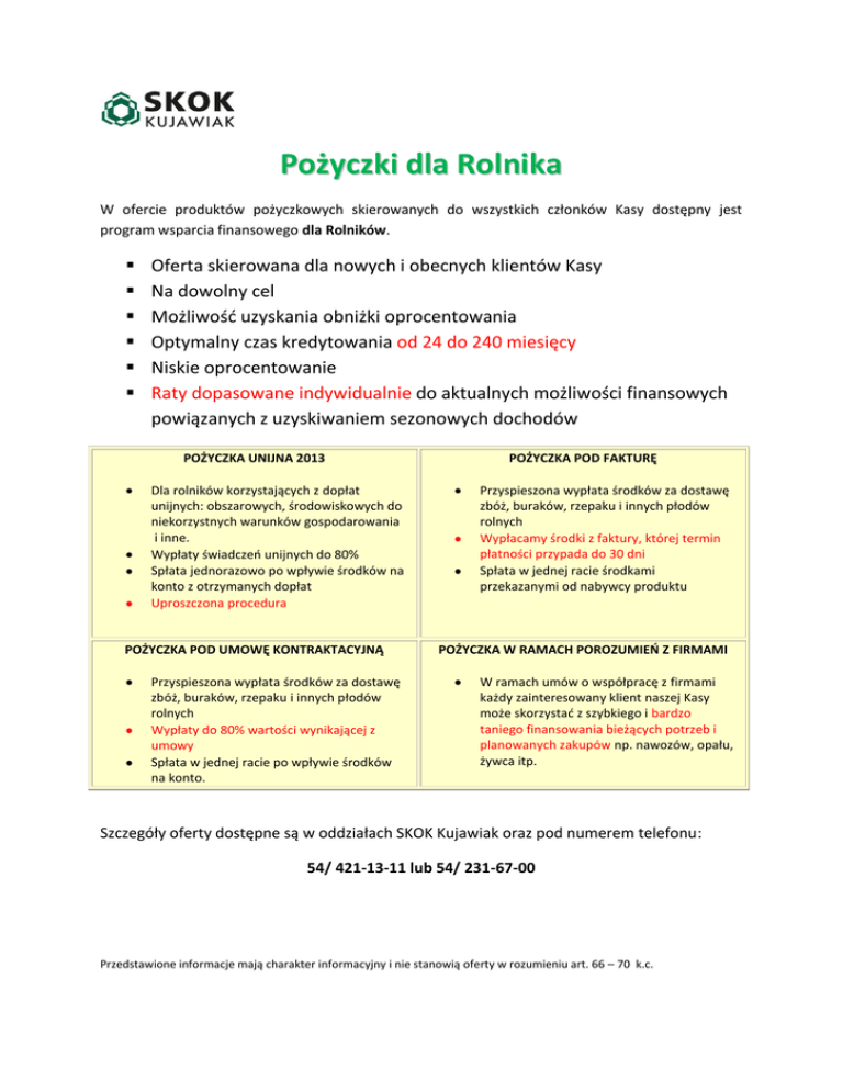 Pożyczki dla Rolnika W ofercie produktów pożyczkowych skierowanych do wszystkich członków Kasy dostępny jest program wsparcia finansowego dla Rolników. Oferta skierowana dla nowych i obecnych klientów Kasy Na dowolny cel Możliwość uzyskania obniżki oprocentowania Optymalny czas kredytowania od 24 do 240 miesięcy Niskie oprocentowanie Raty dopasowane indywidualnie do aktualnych możliwości finansowych powiązanych z uzyskiwaniem sezonowych dochodów POŻYCZKA UNIJNA 2013 Dla rolników korzystających z dopłat unijnych: obszarowych, środowiskowych do niekorzystnych warunków gospodarowania i inne. Wypłaty świadczeń unijnych do 80% Spłata jednorazowo po wpływie środków na konto z otrzymanych dopłat Uproszczona procedura POŻYCZKA POD UMOWĘ KONTRAKTACYJNĄ Przyspieszona wypłata środków za dostawę zbóż, buraków, rzepaku i innych płodów rolnych Wypłaty do 80% wartości wynikającej z umowy Spłata w jednej racie po wpływie środków na konto. POŻYCZKA POD FAKTURĘ Przyspieszona wypłata środków za dostawę zbóż, buraków, rzepaku i innych płodów rolnych Wypłacamy środki z faktury, której termin płatności przypada do 30 dni Spłata w jednej racie środkami przekazanymi od nabywcy produktu POŻYCZKA W RAMACH POROZUMIEŃ Z FIRMAMI W ramach umów o współpracę z firmami każdy zainteresowany klient naszej Kasy może skorzystać z szybkiego i bardzo taniego finansowania bieżących potrzeb i planowanych zakupów np. nawozów, opału, żywca itp. Szczegóły oferty dostępne są w oddziałach SKOK Kujawiak oraz pod numerem telefonu: 54/ 421-13-11 lub 54/ 231-67-00 Przedstawione informacje mają charakter informacyjny i nie stanowią oferty w rozumieniu art. 66 – 70 k.c.