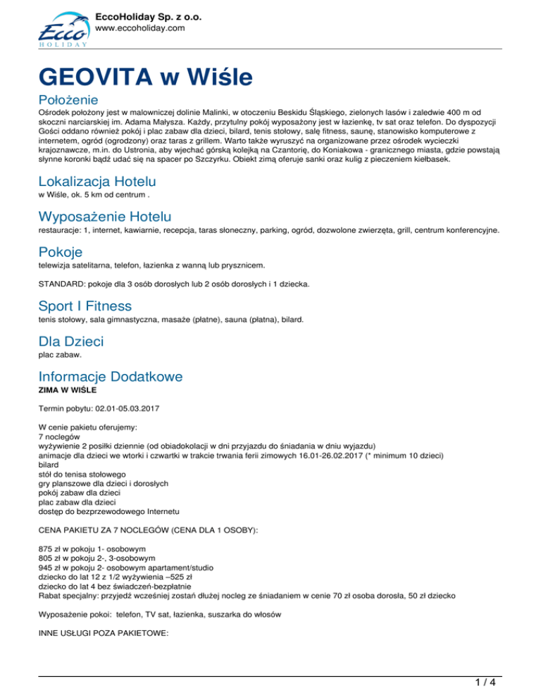 EccoHoliday Sp. z o.o. www.eccoholiday.com GEOVITA w Wiśle Położenie Ośrodek położony jest w malowniczej dolinie Malinki, w otoczeniu Beskidu Śląskiego, zielonych lasów i zaledwie 400 m od skoczni narciarskiej im. Adama Małysza. Każdy, przytulny pokój wyposażony jest w łazienkę, tv sat oraz telefon. Do dyspozycji Gości oddano również pokój i plac zabaw dla dzieci, bilard, tenis stołowy, salę fitness, saunę, stanowisko komputerowe z internetem, ogród (ogrodzony) oraz taras z grillem. Warto także wyruszyć na organizowane przez ośrodek wycieczki krajoznawcze, m.in. do Ustronia, aby wjechać górską kolejką na Czantorię, do Koniakowa - granicznego miasta, gdzie powstają słynne koronki bądź udać się na spacer po Szczyrku. Obiekt zimą oferuje sanki oraz kulig z pieczeniem kiełbasek. Lokalizacja Hotelu w Wiśle, ok. 5 km od centrum . Wyposażenie Hotelu restauracje: 1, internet, kawiarnie, recepcja, taras słoneczny, parking, ogród, dozwolone zwierzęta, grill, centrum konferencyjne. Pokoje telewizja satelitarna, telefon, łazienka z wanną lub prysznicem. STANDARD: pokoje dla 3 osób dorosłych lub 2 osób dorosłych i 1 dziecka. Sport I Fitness tenis stołowy, sala gimnastyczna, masaże (płatne), sauna (płatna), bilard. Dla Dzieci plac zabaw. Informacje Dodatkowe ZIMA W WIŚLE Termin pobytu: 02.01-05.03.2017 W cenie pakietu oferujemy: 7 noclegów wyżywienie 2 posiłki dziennie (od obiadokolacji w dni przyjazdu do śniadania w dniu wyjazdu) animacje dla dzieci we wtorki i czwartki w trakcie trwania ferii zimowych 16.01-26.02.2017 (* minimum 10 dzieci) bilard stół do tenisa stołowego gry planszowe dla dzieci i dorosłych pokój zabaw dla dzieci plac zabaw dla dzieci dostęp do bezprzewodowego Internetu CENA PAKIETU ZA 7 NOCLEGÓW (CENA DLA 1 OSOBY): 875 zł w pokoju 1- osobowym 805 zł w pokoju 2-, 3-osobowym 945 zł w pokoju 2- osobowym apartament/studio dziecko do lat 12 z 1/2 wyżywienia –525 zł dziecko do lat 4 bez świadczeń-bezpłatnie Rabat specjalny: przyjedź wcześniej zostań dłużej nocleg ze śniadaniem w cenie 70 zł osoba dorosła, 50 zł dziecko Wyposażenie pokoi: telefon, TV sat, łazienka, suszarka do włosów INNE USŁUGI POZA PAKIETOWE: 1/4 EccoHoliday Sp. z o.o. www.eccoholiday.com pozostałe usługi z zakresu odnowy biologicznej: hydroterapia, fizykoterapia, aerozoloterapia, termoterapia, kinezyterapia, masaże lecznicze bogata oferta bazy kosmetycznej, pakiety pielęgnacyjne połączone z konsultacjami kosmetycznymi Aqua Park Tropikana w hotelu Gołębiewski lub ośrodku sportowym START Wiślański SKIPASS – na wybranych wyciągach, więcej na www.wislanskiskipass.pl wycieczki autokarowe i piesze z przewodnikiem: Wypad do Czech–Sztramberk i Koprzywnica, Równica, Morawski Kras, Czantoria, Mała Pętla Beskidzka, Pętla Cieńkowska – góry dla wygodnych, Czeskie miasteczka + browar Radegast, Cieszyn zwany Małym Wiedniem, Wiedeń, Praga prowiant na wycieczkę – 20,00 zł osoba, 15,00 zł dziecko inne atrakcje na życzenie klienta dopłata do diety bezglutenowej – 15 zł/ dobę monitorowany parking Uwagi: opłata miejscowa dodatkowo płatna według lokalnego taryfikatora WEEKEND MAJOWY Termin pobytu: 30.04-03.05.2017 W CENIE PAKIETU OFERUJEMY: 3 noclegi wyżywienie 2 posiłki dziennie (od obiadokolacji w dniu przyjazdu do śniadania w dniu wyjazdu) w tym 1x obiadokolacja w chacie grillowej hydromasaż bilard tenis stołowy plac zabaw, pokój zabaw dla dzieci salka fitness CENA PAKIETU ZA 3 NOCLEGI (CENA DLA 1 OSOBY): 445 zł w pokoju 1-osobowym 415 zł w pokoju 2-, 3- osobowym standard / = 138,33 zł 535 zł w apartamencie dziecko w wieku 12-15 lat – 390 zł / 3 = 130 zł dziecko w wieku 5-12 lat – 249 zł / 3 = 83 zł dziecko do lat 4 bez świadczeń – bezpłatnie Wyposażenie pokoi: telefon, TV sat, łazienka, suszarka do włosów, WiFi INNE USŁUGI POZAPAKIETOWE: bogata oferta bazy kosmetycznej, pakiety pielęgnacyjne połączone z konsultacjami kosmetycznymi pozostałe usługi z zakresu odnowy biologicznej: hydroterapia, fizykoterapia, aerozoloterapia, termoterapia, kinezyterapia, masaże lecznicze wycieczki autokarowe i piesze z przewodnikiem (Wypad do Czech–Sztramberk i Koprzywnica, Równica, Morawski Kras, Czantoria, Mała Pętla Beskidzka, Pętla Cieńkowska – góry dla wygodnych, Czeskie miasteczka + browar Radegast, Cieszyn zwany Małym Wiedniem, Wiedeń, Praga) prowiant na wycieczkę górską – 20 zł osoba, 15 zł dziecko inne atrakcje na życzenie Klienta dopłata do diety bezglutenowej – 15 zł/ dobę Uwagi: opłata miejscowa dodatkowo płatna według lokalnego taryfikatora TYDZIEŃ Z MAJÓWKĄ Termin pobytu: 29.04-09.05.2017 2/4 EccoHoliday Sp. z o.o. www.eccoholiday.com W CENIE PAKIETU OFERUJEMY: 7 noclegów wyżywienie 2 posiłki dziennie (od obiadokolacji w dniu przyjazdu do śniadania w dniu wyjazdu) w tym 1x obiadokolacja w chacie grillowej bilard tenis stołowy plac zabaw, pokój zabaw dla dzieci salka fitness CENA PAKIETU ZA 7 NOCLEGÓW (CENA DLA 1 OSOBY): 910 zł w pokoju 1-osobowym 875 zł w pokoju 2-, 3- osobowym standard / 7 = 125 zł 1015 zł w apartamencie dziecko w wieku 12-15 lat – 835 zł dziecko w wieku 5-12 lat – 576 zł / 7 = 82,29 zł dziecko do lat 4 bez świadczeń – bezpłatnie Wyposażenie pokoi: telefon, TV sat, łazienka, suszarka do włosów, WiFi INNE USŁUGI POZAPAKIETOWE: bogata oferta bazy kosmetycznej, pakiety pielęgnacyjne połączone z konsultacjami kosmetycznymi pozostałe usługi z zakresu odnowy biologicznej: hydroterapia, fizykoterapia, aerozoloterapia, termoterapia, kinezyterapia, masaże lecznicze wycieczki autokarowe i piesze z przewodnikiem (Wypad do Czech–Sztramberk i Koprzywnica, Równica, Morawski Kras, Czantoria, Mała Pętla Beskidzka, Pętla Cieńkowska – góry dla wygodnych, Czeskie miasteczka + browar Radegast, Cieszyn zwany Małym Wiedniem, Wiedeń, Praga) prowiant na wycieczkę górską – 20 zł osoba, 15 zł dziecko inne 