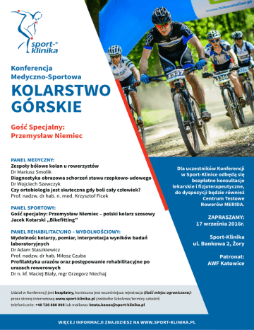 Konferencja Medyczno-Sportowa KOLARSTWO GÓRSKIE Gość Specjalny: Przemysław Niemiec Panel medyczny: Zespoły bólowe kolan u rowerzystów Dr Mariusz Smolik Diagnostyka obrazowa schorzeń stawu rzepkowo-udowego Dr Wojciech Szewczyk Czy ortobiologia jest skuteczna gdy boli cały człowiek? Prof. nadzw. dr hab. n. med. Krzysztof Ficek Panel sportowy: Gość specjalny: Przemysław Niemiec – polski kolarz szosowy Jacek Kotarski „Bikefitting” Dla uczestników Konferencji w Sport-Klinice odbędą się bezpłatne konsultacje lekarskie i fizjoterapeutyczne, do dyspozycji będzie również Centrum Testowe Rowerów MERIDA. Panel rehabilitacyjno – wydolnościowy: Wydolnośc kolarzy, pomiar, interpretacja wyników badań laboratoryjnych Dr Adam Staszkiewicz Prof. nadzw. dr hab. Miłosz Czuba Profilaktyka urazów oraz postępowanie rehabilitacyjne po urazach rowerowych Dr n. kf. Maciej Biały, mgr Grzegorz Niechaj ZAPRASZAMY: 17 września 2016r. Sport-Klinika ul. Bankowa 2, Żory Udział w Konferencji jest bezpłatny, konieczna jest wcześniejsza rejestracja (ilość miejsc ograniczona): przez stronę internetową www.sport-klinika.pl (zakładka Szkolenia/terminy szkoleń) telefonicznie: +48 726 880 006 lub mailowo: [email protected] więcej informacji znajdziesz na www.sport-klinika.pl Patronat: AWF Katowice