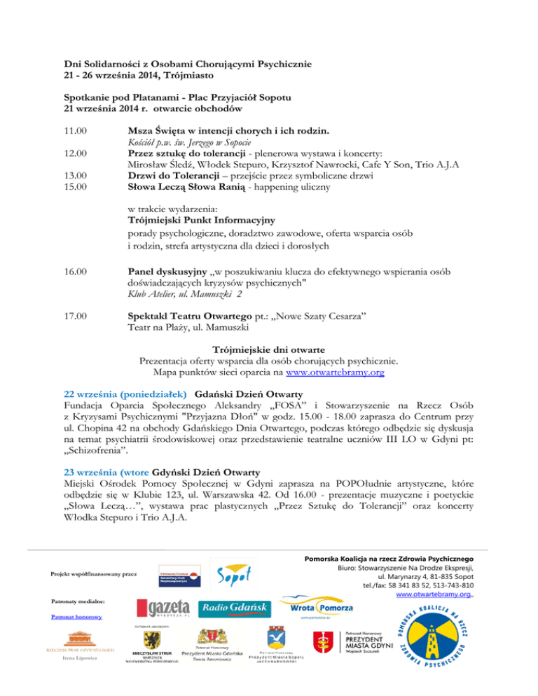 Dni Solidarności z Osobami Chorującymi Psychicznie 21 - 26 września 2014, Trójmiasto Spotkanie pod Platanami - Plac Przyjaciół Sopotu 21 września 2014 r. otwarcie obchodów 11.00 12.00 13.00 15.00 Msza Święta w intencji chorych i ich rodzin. Kościół p.w. św. Jerzego w Sopocie Przez sztukę do tolerancji - plenerowa wystawa i koncerty: Mirosław Śledź, Włodek Stepuro, Krzysztof Nawrocki, Cafe Y Son, Trio A.J.A Drzwi do Tolerancji – przejście przez symboliczne drzwi Słowa Leczą Słowa Ranią - happening uliczny w trakcie wydarzenia: Trójmiejski Punkt Informacyjny porady psychologiczne, doradztwo zawodowe, oferta wsparcia osób i rodzin, strefa artystyczna dla dzieci i dorosłych 16.00 Panel dyskusyjny „w poszukiwaniu klucza do efektywnego wspierania osób doświadczających kryzysów psychicznych" Klub Atelier, ul. Mamuszki 2 17.00 Spektakl Teatru Otwartego pt.: „Nowe Szaty Cesarza” Teatr na Plaży, ul. Mamuszki Trójmiejskie dni otwarte Prezentacja oferty wsparcia dla osób chorujących psychicznie. Mapa punktów sieci oparcia na www.otwartebramy.org 22 września (poniedziałek) Gdański Dzień Otwarty Fundacja Oparcia Społecznego Aleksandry „FOSA” i Stowarzyszenie na Rzecz Osób z Kryzysami Psychicznymi "Przyjazna Dłoń" w godz. 15.00 - 18.00 zaprasza do Centrum przy ul. Chopina 42 na obchody Gdańskiego Dnia Otwartego, podczas którego odbędzie się dyskusja na temat psychiatrii środowiskowej oraz przedstawienie teatralne uczniów III LO w Gdyni pt: „Schizofrenia”. 23 września (wtore Gdyński Dzień Otwarty Miejski Ośrodek Pomocy Społecznej w Gdyni zaprasza na POPOłudnie artystyczne, które odbędzie się w Klubie 123, ul. Warszawska 42. Od 16.00 - prezentacje muzyczne i poetyckie „Słowa Leczą…”, wystawa prac plastycznych „Przez Sztukę do Tolerancji” oraz koncerty Włodka Stepuro i Trio A.J.A. Projekt współfinansowany przez Patronaty medialne: Patronat honorowy Irena Lipowicz Pomorska Koalicja na rzecz Zdrowia Psychicznego Biuro: Stowarzyszenie Na Drodze Ekspresji, ul. Marynarzy 4, 81-835 Sopot tel./fax: 58 341 83 52, 513-743-810 www.otwartebramy.org,, Klub Samopomocy przy Zespole Opiekuńczym ul. Fredry 3 w Gdyni przeznaczony dla osób starszych wykazujących przewlekłe zaburzenia czynności psychicznych zaprasza na spotkanie integracyjne i projekcję filmu " 5 historii o szaleństwie” połączone z dyskusją dotyczącą zaburzonej komunikacji chorującej matki z dzieckiem. Zgłoszenia telefoniczne (58) 661 65 26. Spotkanie odbędzie się w godz. 10.00 – 13.00. 24 września (środa) Sopocki Dzień Otwarty Stowarzyszenie na Drodze Ekspresji w godzinach 16.00 – 18.00 organizuje spotkanie informacyjne i dyskusję dotyczącą perspektyw aktywizacji zawodowej niepełnosprawnych mieszkańców Pomorza. Spotkanie odbędzie się w Sopockim Centrum Organizacji Pozarządowych przy ul. Marynarzy 4. We wtorki zapraszamy chętnych na zajęcia sportowe 16.00 – 18.00, które odbywają się regularnie w Sopocie. Zapisy & informacje: 503 503 466; [email protected] Ponadto Pomorska Koalicja na rzecz Zdrowia Psychicznego zaprasza do udziału w konferencji i warsztatach pt.: „Otworzyć Bramy Tolerancji - jak współdziałać dla dobra osoby chorującej psychicznie”, które odbędą się w dniach 22-23 września 2014 r. w sali okrągłej Pomorskiego Urzędu Marszałkowskiego w Gdańsku oraz Pomorskim Parku Naukowo – Technologicznym w Gdyni. 24 września w godz. 10.00 – 13.00 w Centrum U7 Gdynia Wzg. Św. Maksymiliana ul. Świętojańska 133 odbędzie się Trójmiejski Turniej Bowlingu dla osób chorujących uczestników pomorskich ośrodków wsparcia. 26 września w godz. 10.00 – 13.00 Wojewódzki Szpital Psychiatryczny w Gdańsku zaprasza na Trójmiejski Turniej Gier Planszowych dla pacjentów szpitala i osób chętnych, który odbędzie się w godz. 9.30-12.30 w Oddziale Dziennym, ul. Srebrniki 17, budynek nr 19. Dla zwycięzców przewidziano nagrody. 09.30 - 10.00 Rejestracja i spotkanie informacyjne w godzinach 10.00 - 12.30 Turniej gier planszowych. Gry: Warcaby, szachy, chińczyk, scrable, bilard. Na Oddziale w Klubie Pacjenta odbędzie się wystawa prac (twórczości) pacjentów szpitala. Projekt współfinansowany przez Patronaty medialne: Patronat honorowy Irena Lipowicz Pomorska Koalicja na rzecz Zdrowia Psychicznego Biuro: Stowarzyszenie Na Drodze Ekspresji, ul. Marynarzy 4, 81-835 Sopot tel./fax: 58 341 83 52, 513-743-810 www.otwartebramy.org,, Dni Solidarności w ramach odbywają się w ramach programu "Schizofrenia - Otwórzcie Drzwi" Kampania "Schizofrenia - Otwórzcie Drzwi" mająca na celu przeciwdziałanie napiętnowaniu i dyskryminacji osób chorych na schizofrenię jest już realizowana od września 2000 r. w Polsce. Jej celem jest poprawa społecznego odbioru schizofrenii, pogłębienie tolerancji w naszym kraju dla osób chorych psychicznie. Program ma na celu integrację wszystkich środowisk związanych z leczeniem schizofrenii tak, aby ich wspólne działanie wpłynęło na zmianę postaw i uprzedzeń wobec osób chorych psychicznie. Bezpośrednim celem programu jest przeciwstawienie się stygmatyzacji i dyskryminacji osób chorych na schizofrenię poprzez edukację wielu grup społecznych uczniów, kleryków, pacjentów i ich rodzin, psychiatrów i lekarzy rodzinnych. Program nastawiony jest również na bliską współpracę z mediami nad nowym, bliższym prawdzie obrazem osoby chorej psychicznie w społeczeństwie. Program "Schizofrenia - Otwórzcie Drzwi" rozpoczął się w 1996 roku na Światowym Zjeździe Psychiatrycznym w Madrycie, a pierwszy program pilotażowy zainicjowano w Alberta w Kanadzie. Po pierwszych pozytywnych rezultatach programu kanadyjskiego, podobne akcje rozwinięto w Austrii, Chinach, Egipcie, Niemczech, Grecji, Indiach, Włoszech i Hiszpanii. W każdym z krajów program koordynowany jest przez komitet, w skład której wchodzą psychiatrzy, pacjenci, członkowie rodzin osób chory