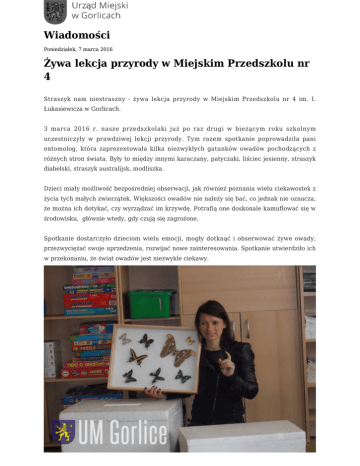 Wiadomości Poniedziałek, 7 marca 2016 Żywa lekcja przyrody w Miejskim Przedszkolu nr 4 Straszyk nam niestraszny - żywa lekcja przyrody w Miejskim Przedszkolu nr 4 im. I. Łukasiewicza w Gorlicach. 3 marca 2016 r. nasze przedszkolaki już po raz drugi w bieżącym roku szkolnym uczestniczyły w prawdziwej lekcji przyrody. Tym razem spotkanie poprowadziła pani entomolog, która zaprezentowała kilka niezwykłych gatunków owadów pochodzących z różnych stron świata. Były to między innymi karaczany, patyczaki, liściec jesienny, straszyk diabelski, straszyk australijsk, modliszka. Dzieci miały możliwość bezpośredniej obserwacji, jak również poznania wielu ciekawostek z życia tych małych zwierzątek. Większości owadów nie należy się bać, co jednak nie oznacza, że można ich dotykać, czy wyrządzać im krzywdę. Potrafią one doskonale kamuflować się w środowisku, głównie wtedy, gdy czują się zagrożone. Spotkanie dostarczyło dzieciom wielu emocji, mogły dotknąć i obserwować żywe owady, przezwyciężać swoje uprzedzenia, rozwijać nowe zainteresowania. Spotkanie utwierdziło ich w przekonaniu, że świat owadów jest niezwykle ciekawy. Źródło: Miejskie Przedszkole nr 4 w Gorlicach