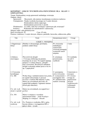 KONSPEKT LEKCJI WYCHOWANIA FIZYCZNEGO DLA KLASY I GIMNASTYKA Temat: Doskonalimy swoją sprawność naśladując zwierzęta. Zadania lekcji : Sprawność: Skoczność, siła ramion, koordynacja wzrokowo-ruchowa Umiejętności: Nauka wyskoku kucznego na 2 części skrzyni. Doskonalenie skoku zajęczego. Doskonalenie przewrotu w przód. Wiadomości: Co robić, Ŝeby być zwinnym i sprawnym jak zwierzęta? Postawy: WdraŜanie do samokontroli i samooceny. Miejsce zajęć: sala gimnastyczna Ilość ćwiczących: 20 Czas: 45 min. Pomoce: materace, 2 części skrzyni, obręcze, pachołki, ławeczka, odskocznia, piłka. Tok 1.Organizacja lekcji Treść Interpretacja treści Uwagi CZĘŚĆ I - WSTĘPNA Zbiórka w dwuszeregu, powitanie, W: ćwiczenia 3 min podanie zadań lekcji. naśladujące zachowanie zwierząt pomagają wzmocnić nasze mięśnie. 2.Zabawa oŜywiająca Wiewiórki do dziupli - Ćwiczący dobierają się parami, trzymają się za ręce. Na sygnał zajmują miejsce w wolnej obręczy „dziupli”. Pary wiewiórek, dla których zabraknie dziupli wykonują zadane przez n-la ćw. np. 5 pajacyków 2. Ćwiczenia kształtujące Ćw. RR U: poznajemy nowe ćwiczenia Wolny bieg z naśladowaniem lotu ptaka, S: wzmacnianie i na sygnał zatrzymanie w pozycji rozciąganie mm bociana z ruchem RR bokiem w górę W: naśladowanie Marsz na czworakach jak kotki, na ruchów zwierząt sygnał klęk podparty i uginanie ramion (kotek pije mleczko). Ćw. tuł. w pł. Marsz na czworakach, na sygnał koci strzał. w przód grzbiet. Ćw. NN Marsz w miejscu z wysokim unoszeniem kolan – ptaki brodzące Skiping A w miejscu – kłusaki Ćw. tuł. w pł. czołowej Pw. Postawa w rozkroku, RR w górę, boczne skłony z wyciąganiem RR w górę w skos – Ŝyrafa S: orientacja przestrzenna, szybkość N-l rozkłada na sali 8 obręczy Ustawienie w rozsypce N-l zwraca uwagę na poprawność pozycji wyjściowych i wykonanie ćwiczenia Ćw. równowagi Pw. Postawa. Uniesienie nogi ugiętej w U: przygotowanie górę, przełoŜenie pod nią ręki i chwyt za do ćwiczeń na nos – pozycja Ŝurawia równowaŜni Pw. jw. – pozycja jaskółki Ćw. mm grzbietu Pw. LeŜenie przodem. Uniesienie tułowia w górę i ruchy RR naśladujące pływanie Ŝabką Pw. jw. Obserwowanie zwierząt przez „lornetkę”, łokcie oderwane od podłoŜa. Ćw. mm brzucha Pw. LeŜenie tyłem. Uniesienie RR i NN w kierunku sufitu, „chodzenie po suficie” – muchy Pw. jw. NN ugięte w stawach kolanowych i biodrowych, dotknąć kolanami do czoła - ślimaczki Ćw. tułowia w Pw. Siad rozkroczny. KrąŜenia tułowia. pł. złoŜonej Podpory i podskoki 1. Zabawa oŜywiająca 2.Organizacja zajęć Marsz na odwrotnych czworakach – U: ćw. przygotowujące raki, na sygnał kołyska na plecach. Podskoki obunóŜ jak kangury, na sygnał do przewrotów przysiad podparty. CZĘŚĆ II - GŁÓWNA Skoki zajęcze, na sygnał zajączki tworzą U: doskonalenie skoku zajęczego 5-cio osobowe grupki wokół „norek” trzymając obręcz oburącz. S: koordynacja wzrokoworuchowa Plan rozmieszczenia przyrządów na sali gimnastycznej. Odskocznia pod materacem odwrócona ławeczka obręcze 2 cz. skrzyni drabinki materac piłka I II III IV W: objaśnienie zadań, pokaz w wykonaniu n-la lub ucznia Dynamiczny podział na 4 zespoły N-l rozkłada na sali 4 obręcze Przygotowanie przyrządów do ćwiczeń. I zespół - „małpki” 3. Ćw. zwinnościowo- Przewrót w przód z przysiadu do akrobatyczne przysiadu, przejście po drabinkach na wys. 4-5 szczebla. Dodatkowo przewrót w tył na pochylni. S: zwinność P: wdraŜanie do samokontroli i samooceny U: doskonalenie przewrotów 4. Ćw. w podporach II zespół – „szczeniaczki” Na czworakach: toczenie piłki głową slalomem. S: siła RR 5. Ćw. równowagi III zespół - „kotki” Przejście równowaŜne po odwróconej ławeczce: przodem, bokiem, tyłem, na czworakach. S: równowaga P: samokontrola poprawności wykonywania ćwiczeń. 6. Ćw. IV zespół – „zajączki” skocznościowe Wyskok kuczny na 2 części skrzyni, zeskok w głąb, powrót skokami zajęczymi. 1. Ćw. o charakterze korekcyjnym CZĘŚĆ III - KOŃCOWA Pw. Klęk podparty S: koordynacja Uniesienie PR i LN równolegle do ruchowa podłoŜa – przeciąganie się pieska 2. Podsumowanie Zbiórka na środku sali, siad skrzyŜny, lekcji dzieci odpowiadają na pyt. n-la Ewaluacja Dzieci, którym lekcja się podobała miałczą jak kotki, dzieci niezadowolone szczekają. 3. Zabawa uspokajająca, zakończenie lekcji S: skoczność Pomoc i U: przygotowanie asekuracja do przeskoku n-la kucznego przez skrzynię Marsz na palcach wokół sali cichutko jak myszki. n-l zwraca uwagę na poprawność ćwiczenia W: Jakie zwierzęta naśladowaliśmy na lekcji? Dlaczego zwierzęta są szybkie i zwinne? W ciszy dzieci opuszczają salę.