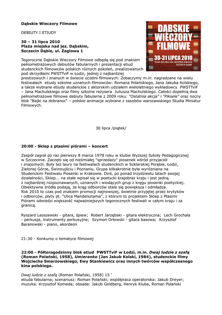 Dąbskie Wieczory Filmowe DEBIUTY I ETIUDY 30 – 31 lipca 2010 Plaża miejska nad jez. Dąbskim, Szczecin Dąbie, ul. Żaglowa 1 Tegoroczne Dąbskie Wieczory Filmowe odbędą się pod znakiem pełnometrażowych debiutów fabularnych i prezentacji etiud studenckich filmowców polskich różnych pokoleń, zrealizowanych pod skrzydłami PWSTTviF w Łodzi, jednej z najbardziej prestizowych i znanych w świecie uczelni filmowych. Zobaczymy m.in. nagradzane na wielu festiwałach etiudy szkolne uznanych filmowców: Romana Polańskiego, Jana Jakuba Kolskiego, a także wybrane etiudy studenckie z aktorskim udziałem wieloletniego wykładowcy PWSTTviF – Jana Machulskiego oraz filmy szkolne reżysera Juliusza Machulskiego. Całości dopełnią dwa pełnometrażowe filmowe debiuty fabularne z 2009 roku: "Ostatnia akcja" i "Piksele" oraz nocny blok "Bajki na dobranoc" – polskie animacje wybrane z zasobów warszawskiego Studia Miniatur Filmowych. 30 lipca /piątek/ 20:00 - Sklep z ptasimi piórami – koncert Zespół zagrał po raz pierwszy 8 marca 1978 roku w klubie Wyższej Szkoły Pedagogicznej w Szczecinie. Zaczęło się od nieśmiałej "sprzedaży" piosenek wśród przyjaciół i znajomych. Były też laury na festiwalach studenckich w Szklarskiej Porębie, Łodzi, Zielonej Górze, Świnoujściu i Poznaniu. Grupa kilkakrotnie była wyróżniana na Studenckim Festiwalu Piosenki w Krakowie. Dziś, po ponad trzydziestu latach swojej działalności, Sklep... na stałe wpisał się w poetycki krajobraz kraju i jest jedną z najbardziej rozpoznawanych, uznanych i wiodących grup z kręgu piosenki poetyckiej. Obiektywne źródła podają, że krąg odbiorców stale się powiększa i odmładza. Rok 2010 to czas pod znakiem promocji najnowszej, świetnie przyjętej przez krytyków i odbiorców, płyty pt. "Ulica Mandelsztama", z którym to projektem Sklep z Ptasimi Piórami odwiedzi większość najważniejszych tegorocznych festiwali w całym kraju i za granicą. Ryszard Leoszewski - gitara, śpiew; Robert Jarzębski - gitara elektryczna; Lech Grochala - perkusja, instrumenty perkusyjne; Szymon Orłowski - gitara basowa; Krzysztof Baranowski - piano, akordeon 21:30 - Konkursy o tematyce filmowej 22:00 - Półtoragodzinny blok etiud PWSTTviF w Łodzi, m.in. Dwaj ludzie z szafą (Roman Polański, 1958), Umieranko (Jan Jakub Kolski, 1984), studenckie filmy Wojciecha Smarzowskiego, Ewy Stankiewicz oraz innych twórców współczesnego kina polskiego. Dwaj ludzie z szafą (Roman Polański, 1958) 15 ' etiuda fabularna; scenariusz: Roman Polański; współpraca operatorska: Jakub Dreyer; muzyka: Krzysztof Komeda; obsada: Jakub Goldberg, Henryk Kluba, Roman Polański Umieranko (Jan Jakub Kolski, 1984) 10 ' etiuda fabularna; zdjęcia: Jan Jakub Kolski Fire inside/Świt (Wojciech Smarzowski, 1991) 6 ' etiuda dokumentalna; zdjęcia: Wojciech Smarzowski; muzyka: Blitzkrieg Głupie zagadki (Ewa Stankiewicz, 2000) 9 ' etiuda dokumentalna; scenariusz: Ewa Stankiewicz; zdjęcia: Marta Pruska; muzyka: Juliusz Lorantc, Jonasz Kofta Za nieprzypadkowych ludzi (Ewa Stankiewicz, 2004) 18 ' etiuda fabularna; scenariusz: Ewa Stankiewicz; zdjęcia: Sławomir Bergański, Ewa Stankiewicz; muzyka: Michał Lorenc Praca dyplomowa/Jankowski M. (Michał Jankowski, 2006) 15 ' etiuda fabularna; scenariusz: Michał Jankowski; zdjęcia: Łukasz Rosenberg, Bartosz Bieniek; obsada: Małgorzata Zawadzka, Anna Zdanowicz, Wiesława Piećko, Michał Jankowski Dzień, w którym pękło niebo (Karol Białas, 2009) 12 ' etiuda dokumentalna; scenariusz: Karol Białas; zdjęcia: Jacek Szymański; imitator dźwięku: Michał Jankowski 23:30 - Piksele (2009) – pełnometrażowy debiut fabularny Jacka Lusińskiego, z udziałem Anny Cieślak, Mariana Opani, Edwarda Lubaszenki, Adama Ferency, Andrzeja Grabowskiego i gwiazdorskim - dosłownie - udziałem Kayah. dramat/komedia; scenariusz i reżyseria: Jacek Lusiński; zdjęcia: Piotr Śliskowski, Piotr Piesiak, Jan Holoubek, Witold Płóciennik; muzyka: Paweł Lucewicz; 99 ' Kiedy Alicja (Anna Cieślak) – młoda i piękna fotoreporterka popularnego dziennika postanowi zrobić zdjęcie życia, nikt i nic nie stanie jej na przeszkodzie. Wystarczy telefon z aparatem fotograficznym. Wszystko, co spotka na drodze, może stać się tematem na pierwszą stronę: aktor, który potknął się na schodach („Znany aktor znów nachlany!”), letni domek gwiazdy („Przed czym się ukrywa?”) czy były ubek koczujący w lesie („Poznał największe tajemnice polskich gwiazd”). Gdy telefon Alicji, w niecodziennych okolicznościach, trafia w ręce pracowników izby wytrzeźwień, okazuje się, że życie potrafi pisać znacznie dziwniejsze scenariusze! 01:10 - "Bajki na dobranoc" – godzinna prezentacja krótkometrażowych filmów animowanych z zasobów warszawskiego Studia Miniatur Filmowych. Będą to "bajki" różnej treści – od animowanych żartobliwych opowiastek dla dorosłych po autentyczne bajki na dobranoc, które wielu widzów pamięta z dzieciństwa, zrealizowane przez wielkie nazwiska polskiej animacji: Juliana Antoniszczaka, Romana Huszczo, Bogdana Nowickiego, z muzyką znanych kompozytorów – m.in. Waldemara Kazaneckiego. Duch zamczyska Sakramento, scenariusz: Tadeusz Frey, Leonard Pulchny; scenografia i reżyseria: Leonard Pulchny; muzyka: Jerzy Woźniak; 1962, 11' 11'' Baśnie i waśnie, scenariusz: Andrzej Lach, Maria Achmatowicz; scenografia i reżyseria: Bogdan Nowicki; muzyka: Waldemar Kazanecki; 1964, 10 ' 16 '' W szponach seksu, scenariusz, scenografia, reżyseria, muzyka: Julian Antoniszczak, 1969, 9 ' 21 '' Kochajmy straszydła: Szatańskie tempo, scenariusz: Ryszard Sławczyński, scenografia i reżyseria: Roman Huszczo, muzyka: Waldemar Kazanecki, 1970, 9 ' 54 '' Jak działa jamniczek, scenariusz: Julian Antoniszczak, Danuta Zadrzyńska, scenografia, reżyseria, muzyka: Julian Antoniszczak, 1971, 8 ' 50'' 1001 drobiazgów, scenariusz, scenografia, reżyseria, muzyka: Julian