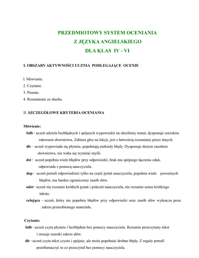 PRZEDMIOTOWY SYSTEM OCENIANIA Z JĘZYKA ANGIELSKIEGO DLA KLAS IV - VI I. OBSZARY AKTYWNOŚCI UCZNIA PODLEGAJĄCE OCENIE l. Mówienie. 2. Czytanie. 3. Pisanie. 4. Rozumienie ze słuchu. II. SZCZEGÓŁOWE KRYTERIA OCENIANIA Mówienie: bdb · uczeń udziela bezbłędnych i spójnych wypowiedzi na określony temat, dysponuje szerokim zakresem słownictwa. Zabiera głos na lekcji, jest z łatwością rozumiany przez innych. db · uczeń wypowiada się płynnie, popełniają niekiedy błędy. Dysponuje dużym zasobem słownictwa, nie waha się wyrażać myśli. dst · uczeń popełnia wiele błędów przy odpowiedzi, brak mu spójnego łączenia zdań, odpowiada z pomocą nauczyciela. dop · uczeń potrafi odpowiedzieć tylko na część pytań nauczyciela, popełnia wiele poważnych błędów, ma bardzo ograniczony zasób słów. ndst · uczeń nie rozumie krótkich pytań i poleceń nauczyciela, nie rozumie sensu krótkiego tekstu. celująca - uczeń, który nie popełnia błędów przy odpowiedzi oraz zasób słów wykracza poza zakres przerobionego materiału. Czytanie: bdb · uczeń czyta płynnie i bezbłędnie bez pomocy nauczyciela. Rozumie przeczytany tekst i stosuje szeroki zakres słów. db · uczeń czyta tekst czysto i spójnie, ale może popełniać drobne błędy. Z reguły potrafi przetłumaczyć to co przeczytał bez pomocy nauczyciela. dst · uczeń potrafi przeczytać co najmniej 50% tekstu bez rażących błędów, średnio radzi sobie z czytaniem. dop · uczeń czyta tylko z pomocą nauczyciela. Ma poważne problemy z czytaniem, nie potrafi zrozumieć sensu prostego zdania. ndst · uczeń nie potrafi przeczytać tekstu nawet z pomocą nauczyciela, wykazuje zupełny brak zrozumienia prostych zdań. celująca - uczeń, który czyta tekst bardzo płynnie i wyraźnie, niekoniecznie przerobiony na lekcji i umie go przetłumaczyć. Pisanie: bdb · uczeń potrafi poprawnie stosować poznane struktury gramatyczne, nie popełnia błędów gramatycznych, buduje spójne i poprawne zdania. db · uczeń zazwyczaj buduje poprawnie gram. Zdania popełniając niekiedy błędy. dst · uczeń buduje zdania spójne, sensowne, ale na ogół popełnia liczne błędy gram. opanował tylko niektóre struktury proste i złożone. dop · uczeń operuje niedużą ilością struktur prostych i złożonych, buduje niepoprawne gram. zdania, zadania z gramatyki wykonuje z pomocą nauczyciela. ndst· uczeń nie potrafi samodzielnie zapisać pojedynczego znanego mu słowa lub krótkiego zdania. Popełnia rażące błędy w pisowni, nie odrabia prac domowych nie prowadzi w sposób systematyczny zeszytu i ćwiczeń. celująca – uczeń, który . umie rozwiązać dodatkowe zadania w stopniu trudniejszym od pozostałych. Rozumienie ze słuchu: bdb · uczeń bardzo dobrze rozumie sens ogólny różnorodnych tekstów i rozmów. Potrafi bezbłędnie wykonać zadanie ze słuchu polegające na uzupełnianiu tekstu czy udzielaniu odpowiedzi na pytania. db · uczeń rozumie zdecydowaną większość informacji sytuacji komunikacyjnych potrafi przekształcić je właściwie w narzuconą formę. dst · uczeń nie zawsze rozumie sens różnorodnych tekstów, potrafi udzielić odpowiedzi tylko z pomocą nauczyciela. dop · uczeń jest w stanie wychwycić tylko kilka kluczowych informacji po wysłuchaniu danego tekstu. ndst · uczeń wykazuje rażący brak rozumienia prostego tekstu czytanego bądź słyszanego z kasety. Nie potrafi zrozumieć prostych poleceń nauczyciela. celująca – uczeń , który rozumie teksty słuchane wykraczające poza program nauczania. III. SPOSOBY I FORMY OCENIANIA Ocenianie bieżące: a) Metody i formy oceniania: 1. ustne: odpowiedź ustna, dyskusja, rozmowa, 2. pisemne: sprawdzian zapowiedziany z określonego materiału, kartkówka niezapowiedziana z ostatnich trzech lekcji; praca pisemna lub test sprawdzający z działu programowego; praca domowa 3. ćwiczenia praktyczne 4. prace samodzielne uczniów 5. prace w grupach 6. aktywność i zaangażowanie na lekcjach 7. prace nieobowiązkowe , nadprogramowe. 8. praca ucznia na lekcji (odpowiedzi, aktywność i zaangażowanie, stosunek ucznia do przedmiotu, wyposażenie w pomoce dydaktyczne) 9. bieżące prace domowe 10. zapisy lekcyjne w zeszycie przedmiotowym 11. zadania dodatkowe Uczeń oceniany jest z czterech sprawności: mówienie, pisanie, czytanie, rozumienie ze słuchu. Uczeń również otrzyma ocenę za znajomość słownictwa. W semestrze uczeń zobowiązany jest do napisania co najmniej 2 testów, obejmujących większy zakres materiału (od 1 do 3 działów). Uczeń ma prawo do poprawy oceny niesatysfakcjonującej z każdego testu lub pracy pracy pisemnej z działu programowego. b) Kryteria oceny ucznia - obowiązująca skala ocen: • celujący – 6 - cel • bardzo dobry – 5 - bdb • dobry – 4 – db • dostateczny – 3 - dost • dopuszczający – 2 - dop • niedostateczny – 1 – ndst Za poniżej wyszczególnione aktywności uczeń może otrzymać „+” oraz „ – „ ( trzy plusy – ocena bardzo dobra, trzy minusy – ocena niedostateczna). • praca ucznia na lekcji (odpowiedzi, aktywność i zaangażowanie, stosunek ucznia do przedmiotu, wyposażenie w pomoce dydaktyczne) • bieżące prace domowe • zapisy lekcyjne w zeszycie przedmiotowym • zadania dodatkowe c) punktacja testów i sprawdzianów Kryteria oceny: 40%-49% - ocena dopuszczająca 50%-69% - ocena dostateczna 70%-89% - ocena dobra 90%-100% - ocena bardzo dobra Poniżej 40% uczeń nie powinien zaliczyć testu. Rozwiązanie testu na ocenę bdb i dodatkowo rozwiązanie trudniejszego zadania daje szansę na zdobycie oceny celujące Ocenianie okresowe: Ocena okresowa to końcowa ocena za pracę w ciągu całego semestru czyli ocena śródroczna lub ocena końcoworoczna podsumowująca prace i wyniki w nauce w ciągu całego roku. CELUJĄCA · uczeń wykracza poza materiał programowy · biegle czyta i piszę · samodzielnie poszerza swoją wiedz