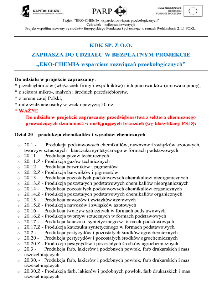 Projekt "EKO-CHEMIA wsparcie rozwiązań proekologicznych” Człowiek – najlepsza inwestycja Projekt współfinansowany ze środków Europejskiego Funduszu Społecznego w ramach Poddziałania 2.1.1 POKL. KDK SP. Z O.O. ZAPRASZA DO UDZIAŁU W BEZPŁATNYM PROJEKCIE „EKO-CHEMIA wsparciem rozwiązań proekologicznych” Do udziału w projekcie zapraszamy: * przedsiębiorców (właścicieli firmy i wspólników) i ich pracowników (umowa o pracę), * z sektora mikro-, małych i średnich przedsiębiorstw, * z terenu całej Polski, * mile widziane osoby w wieku powyżej 50 r.ż. * WAŻNE Do udziału w projekcie zapraszamy przedsiębiorstwa z sektora chemicznego prowadzących działalność w następujących branżach (wg klasyfikacji PKD): Dział 20 – produkcja chemikaliów i wyrobów chemicznych o o o o o o o o o o o o o o o o o o o o o 20.1 Produkcja podstawowych chemikaliów, nawozów i związków azotowych, tworzyw sztucznych i kauczuku syntetycznego w formach podstawowych 20.11 - Produkcja gazów technicznych 20.11.Z - Produkcja gazów technicznych 20.12 - Produkcja barwników i pigmentów 20.12.Z - Produkcja barwników i pigmentów 20.13 - Produkcja pozostałych podstawowych chemikaliów nieorganicznych 20.13.Z - Produkcja pozostałych podstawowych chemikaliów nieorganicznych 20.14 - Produkcja pozostałych podstawowych chemikaliów organicznych 20.14.Z - Produkcja pozostałych podstawowych chemikaliów organicznych 20.15 - Produkcja nawozów i związków azotowych 20.15.Z - Produkcja nawozów i związków azotowych 20.16 - Produkcja tworzyw sztucznych w formach podstawowych 20.16.Z - Produkcja tworzyw sztucznych w formach podstawowych 20.17 - Produkcja kauczuku syntetycznego w formach podstawowych 20.17.Z - Produkcja kauczuku syntetycznego w formach podstawowych 20.2 - Produkcja pestycydów i pozostałych środków agrochemicznych 20.20 - Produkcja pestycydów i pozostałych środków agrochemicznych 20.20.Z - Produkcja pestycydów i pozostałych środków agrochemicznych 20.3 - Produkcja farb, lakierów i podobnych powłok, farb drukarskich i mas uszczelniających 20.30. - Produkcja farb, lakierów i podobnych powłok, farb drukarskich i mas uszczelniających 20.30.Z - Produkcja farb, lakierów i podobnych powłok, farb drukarskich i mas uszczelniających o o o o o o o o o o o o o o o o o 20.4 - Produkcja mydła i detergentów, środków myjących i czyszczących, wyrobów kosmetycznych i toaletowych 20.41 - Produkcja mydła i detergentów, środków myjących i czyszczących 20.41.Z - Produkcja mydła i detergentów, środków myjących i czyszczących 20.42 – Produkcja wyrobów kosmetycznych i toaletowych 20.42.Z - Produkcja wyrobów kosmetycznych i toaletowych 20.5 - Produkcja pozostałych wyrobów chemicznych 20.51 - Produkcja materiałów wybuchowych 20.51.Z - Produkcja materiałów wybuchowych 20.52 - Produkcja klejów 20.52.Z - Produkcja klejów 20.53 - Produkcja olejków eterycznych 20.53.Z - Produkcja olejków eterycznych 20.59 - Produkcja pozostałych wyrobów chemicznych, gdzie indziej niesklasyfikowana 20.59.Z - Produkcja pozostałych wyrobów chemicznych, gdzie indziej niesklasyfikowana 20.6 - Produkcja włókien chemicznych 20.60 - Produkcja włókien chemicznych 20.60.Z - Produkcja włókien chemicznych Dział 21 – produkcja podstawowych substancji farmaceutycznych oraz leków i pozostałych wyrobów farmaceutycznych o o o o o o 21.1 - Produkcja podstawowych substancji farmaceutycznych 21.10 - Produkcja podstawowych substancji farmaceutycznych 21.10.Z - Produkcja podstawowych substancji farmaceutycznych 21.2 - Produkcja leków i pozostałych wyrobów farmaceutycznych 21.20 - Produkcja leków i pozostałych wyrobów farmaceutycznych 21.20.Z - Produkcja leków i pozostałych wyrobów farmaceutycznych Dział 22 – produkcja z wyrobów gumy i tworzyw sztucznych o o o o o o o o o o o o o o 22.1. - Produkcja wyrobów z gumy 22.11 - Produkcja opon i dętek z gumy; bieżnikowanie i regenerowanie opon z gumy 22.11.Z - Produkcja opon i dętek z gumy; bieżnikowanie i regenerowanie opon z gumy 22.19 - Produkcja pozostałych wyrobów z gumy 22.19.Z - Produkcja pozostałych wyrobów z gumy 22.2 - Produkcja wyrobów z tworzyw sztucznych 22.21 - Produkcja płyt, arkuszy, rur i kształtowników z tworzyw sztucznych 22.21.Z - Produkcja płyt, arkuszy, rur i kształtowników z tworzyw sztucznych 22.22 - Produkcja opakowań z tworzyw sztucznych 22.22.Z - Produkcja opakowań z tworzyw sztucznych 22.23 - Produkcja wyrobów dla budownictwa z tworzyw sztucznych 22.23.Z - Produkcja wyrobów dla budownictwa z tworzyw sztucznych 22.29 - Produkcja pozostałych wyrobów z tworzyw sztucznych 22.29.Z - Produkcja pozostałych wyrobów z tworzyw sztucznych W ramach udziału w projekcie oferujemy: 1. Bezpłatny udział w 4 dniowym szkoleniu System Zarządzania Środowiskowego 2. Bezpłatne konsultacje nt. wdrażania rozwiązań ekologicznych w przedsiębiorstwie 3. Atrakcyjne i praktyczne materiały szkoleniowe 4. Lunch i serwis kawowy podczas każdego dnia szkolenia Cel szkolenia: Przygotowanie uczestników do opracowania i implementacji „planu wdrożenia działań proekologicznych“ w firmie Zapoznanie uczestników z istotą, celem, rodzajami, planowaniem i metodyką prowadzenia auditów, Zapoznanie uczestników z normą ISO 14001 oraz podstawami normy ISO 5001, Przygotowanie przyszłych auditorów do efektywnego przeprowadzenia auditów w przedsiębiorstwie zgodnie z normą ISO 14001. RAMOWY PLAN SZKOLENIA DZIEŃ I Koncepcja funkcjonowania Systemu Zarządzania Środowiskiem Podstawowe pojęcia dotyczące funkcjonowania Systemu Zarządzania Środowiskowego Podstawowe wymagania prawne Systemu Zarządzania Środowiskiem DZIEŃ II Norma ISO 14001, omówienie założeń i wymagań normy ISO 14001 Norma ISO 5001, omówienie założeń i wymagań normy ISO 5001 DZIEŃ III Przebieg procesu - wdrożenie i funkcjonowanie Systemu Zarządzania Środowiskiem Tworzenie polityki środowiskowej Opraco
