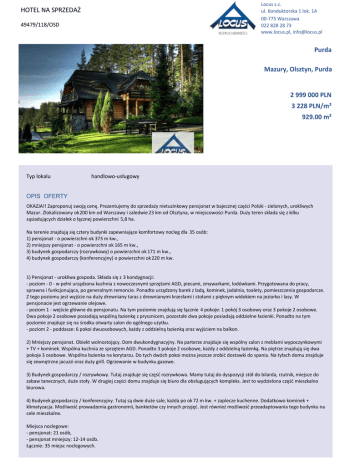 Locus s.c. ul. Konduktorska 1 lok. 1A 00-775 Warszawa 022 828 28 73 www.locus.pl, [email protected] ,Kd>E^WZ 49479/118/OSD Purda Mazury, Olsztyn, Purda 2 999 000 PLN 3 228 PLN/m² 929.00 m² Typ lokalu ŚĂŶĚůŽǁŽͲƵƐųƵŐŽǁLJ OPIS OFERTY K<:͊͊ĂƉƌŽƉŽŶƵũƐǁŽũČĐĞŶħ͘WƌĞnjĞŶƚƵũĞŵLJĚŽƐƉƌnjĞĚĂǏLJŶŝĞƚƵnjŝŶŬŽǁLJƉĞŶƐũŽŶĂƚǁďĂũĞĐnjŶĞũĐnjħƑĐŝWŽůƐŬŝͲnjŝĞůŽŶLJĐŚ͕ƵƌŽŬůŝǁLJĐŚ Mazur. Zlokalizowany ok 200 km od Warszawy i zaledwie 23ŬŵŽĚKůƐnjƚLJŶĂ͕ǁŵŝĞũƐĐŽǁŽƑĐŝWƵƌĚĂ͘ƵǏLJƚĞƌĞŶƐŬųĂĚĂƐŝħnjŬŝůŬƵ ƐČƐŝĂĚƵũČĐLJĐŚĚnjŝĂųĞŬŽųČĐnjŶĞũƉŽǁŝĞƌnjĐŚŶŝ5,8 ha. EĂƚĞƌĞŶŝĞnjŶĂũĚƵũČƐŝħĐnjƚĞƌLJďƵĚLJŶŬŝnjĂƉĞǁŶŝĂũČĐĞŬŽŵĨŽƌƚŽǁLJŶŽĐůĞŐĚůĂ 35 osób: 1) pensjonat - o powierzchni ok 373 m kw., 2) mniejszy pensjonat - o powierzchni ok 165 m kw., 3) budynek gospodarczy (rozrywkowy) o powierzchni ok 171 m kw., 4) budynek gospodarczy (konferencyjny) o powierzchni ok 220 m kw. 1ͿWĞŶƐũŽŶĂƚͲƵƌŽŬůŝǁĂŐŽƐƉŽĚĂ͘^ŬųĂĚĂƐŝħnj3 kondygnacji: - poziom - 0ͲǁƉĞųŶŝƵƌnjČĚnjŽŶĂŬƵĐŚŶŝĂnjŶŽǁŽĐnjĞƐŶLJŵŝƐƉƌnjħƚĂŵŝ'͕ƉŝĞĐĂŵŝ͕njŵLJǁĂƌŬĂŵŝ͕ůŽĚſǁŬĂŵŝ͘WƌnjLJŐŽƚŽǁĂŶĂĚŽƉƌĂĐLJ͕ ƐƉƌĂǁŶĂŝĨƵŶŬĐũŽŶƵũČĐĂ͕ƉŽŐĞŶĞƌĂůŶLJŵƌĞŵŽŶĐŝĞ͘WŽŶĂĚƚŽƵƌnjČĚnjŽŶLJďĂƌĞŬnjůĂĚČ͕ŬŽŵŝŶĞŬ͕ũĂĚĂůŶŝĂ͕ƚŽĂůĞƚLJ͕ƉŽŵŝĞƐnjĐnjĞŶŝĂŐŽƐƉŽĚĂƌĐnjĞ͘ ƚĞŐŽƉŽnjŝŽŵƵũĞƐƚǁLJũƑĐŝĞŶĂĚƵǏLJĚƌĞǁŶŝĂŶLJƚĂƌĂƐnjĚƌĞǁŶŝĂŶLJŵŝŬƌnjĞƐųĂŵŝŝƐƚŽųĂŵŝnjƉŝħŬŶLJŵǁŝĚŽŬŝĞŵŶĂũĞnjŝŽƌŬŽŝůĂƐLJ͘t pensjonacie jest ogrzewanie olejowe. - poziom 1ͲǁĞũƑĐŝĞŐųſǁŶĞĚŽƉĞŶƐũŽŶĂƚƵ͘EĂƚLJŵƉŽnjŝŽŵŝĞnjŶĂũĚƵũČƐŝħųČĐnjŶŝĞ 4 pokoje: 1 pokój 3 osobowy oraz 3 pokoje 2 osobowe. Dwa pokoje 2ŽƐŽďŽǁĞƉŽƐŝĂĚĂũČǁƐƉſůŶČųĂnjŝĞŶŬħnjƉƌLJƐnjŶŝĐĞŵ͕ƉŽnjŽƐƚĂųĞĚǁĂƉŽŬŽũĞƉŽƐŝĂĚĂũČŽĚĚnjŝĞůŶĞųĂnjŝĞŶŬŝ͘WŽŶĂĚƚŽŶĂƚLJŵ ƉŽnjŝŽŵŝĞnjŶĂũĚƵũĞƐŝħŶĂƑƌŽĚŬƵŽƚǁĂƌƚLJƐĂůŽŶĚŽŽŐſůŶĞŐŽƵǏLJƚŬƵ͘ - poziom 2 - poddasze: 6ƉŽŬŽŝĚǁƵŽƐŽďŽǁLJĐŚ͕ŬĂǏĚLJnjŽĚĚnjŝĞůŶČųĂnjŝĞŶŬČŽƌĂnjǁLJũƑĐŝĞŵŶĂďĂůŬŽŶ͘ 2ͿDŶŝĞũƐnjLJƉĞŶƐũŽŶĂƚ͘KďŝĞŬƚǁŽůŶŽƐƚŽũČĐLJ͘ŽŵĚǁƵŬŽŶĚLJŐŶĂĐLJũŶLJ͘EĂƉĂƌƚĞƌnjĞnjŶĂũĚƵũĞƐŝħǁƐƉſůŶLJƐĂůŽŶnjŵĞďůĂŵŝǁLJƉŽĐnjLJŶŬŽǁLJŵŝ нdsнŬŽŵŝŶĞŬ͘tƐƉſůŶĂŬƵĐŚŶŝĂnjĞƐƉƌnjħƚĞŵ'͘WŽŶĂĚƚŽ3 pokoje 2ŽƐŽďŽǁĞ͕ŬĂǏĚLJnjŽĚĚnjŝĞůŶČųĂnjŝĞŶŬČ͘EĂƉŝħƚƌnjĞnjŶĂũĚƵũČƐŝħĚǁĂ pokoje 3ŽƐŽďŽǁĞ͘tƐƉſůŶĂųĂnjŝĞŶŬĂŶĂŬŽƌLJƚĂƌnjƵ͘ŽƚLJĐŚĚǁſĐŚƉŽŬŽŝŵŽǏŶĂũĞƐnjĐnjĞnjƌŽďŝđĚŽƐƚĂǁŬŝĚŽƐƉĂŶŝĂ͘EĂƚLJųĂĐŚĚŽŵƵnjŶĂũĚƵũĞ ƐŝħnjĞǁŶħƚƌnjŶĞũĂĐƵnjnjŝŽƌĂnjĚƵǏLJŐƌŝůů͘KŐƌnjĞǁĂŶŝĞǁďƵĚLJŶŬƵŐĂnjŽǁĞ͘ 3ͿƵĚLJŶĞŬŐŽƐƉŽĚĂƌĐnjLJͬƌŽnjƌLJǁŬŽǁLJ͘dƵƚĂũnjŶĂũĚƵũĞƐŝħĐnjħƑđƌŽnjƌLJǁŬŽǁĂ͘DĂŵLJƚƵƚĂũĚŽĚLJƐƉŽnjLJĐũŝƐƚſųĚŽďŝůĂƌĚĂ͕ƌnjƵƚŶŝŬ͕ŵŝĞũƐĐĞĚŽ njĂďĂǁƚĂŶĞĐnjŶLJĐŚ͕ĚƵǏĞƐƚŽųLJ͘tĚƌƵŐŝĞũĐnjħƑĐŝĚŽŵƵnjŶĂũĚƵũĞƐŝħďŝƵƌŽĚůĂŽďƐųƵŐƵũČĐLJĐŚŬŽŵƉůĞŬƐ͘:ĞƐƚƚŽǁLJĚnjŝĞůŽŶĂĐnjħƑđŵŝĞƐnjŬĂůŶŽ biurowa. 4ͿƵĚLJŶĞŬŐŽƐƉŽĚĂƌĐnjLJͬŬŽŶĨĞƌĞŶĐLJũŶLJ͘dƵƚĂũƐČĚǁŝĞĚƵǏĞƐĂůĞ͕ŬĂǏĚĂƉŽŽŬ72 m kw. + zaplecze kuchenne. Dodatkowo kominek + ŬůŝŵĂƚLJnjĂĐũĂ͘DŽǏůŝǁŽƑđƉƌŽǁĂĚnjĞŶŝĂŐĂƐƚƌŽŶŽŵŝŝ͕ďĂŶŬŝĞƚſǁĐnjLJŝŶŶLJĐŚƉƌnjLJũħđ͘:ĞƐƚƌſǁŶŝĞǏŵŽǏůŝǁŽƑđƉƌnjĞĂĚĂƉƚŽǁĂŶŝĂƚĞŐŽďƵĚLJŶŬƵŶĂ cele mieszkalne. Miejsca noclegowe: - pensjonat: 21 osób, - pensjonat mniejszy: 12-14 osób. BČĐnjŶŝĞ͗35 miejsc noclegowych. ,Kd>E^WZ 49479/118/OSD Locus s.c. ul. Konduktorska 1 lok. 1A 00-775 Warszawa 022 828 28 73 www.locus.pl, [email protected] EĂƚĞƌĞŶŝĞũĞƐƚƉŽŶĂĚƚŽƉůĂĐnjĂďĂǁ͕ŵŝĞũƐĐĞĚŽƉĂƌŬŽǁĂŶŝĂ͘:ĞƐƚƚŽďĂƌĚnjŽĐŝĐŚĂŝnjŝĞůŽŶĂŽŬŽůŝĐĂ͕ƉŝħŬŶLJǁŝĚŽŬŶĂůĂƐLJŝǁŽĚħ͘ƵǏĂĐnjħƑđ ƚĞƌĞŶƵƚŽůĂƐ͘/ƐƚŶŝĞũĞŵŽǏůŝǁŽƑđƌŽnjďƵĚŽǁLJŽŬŽůĞũŶĞŵŶŝĞũƐnjĞůƵďǁŝħŬƐnjĞďĂnjLJŶŽĐůĞŐŽǁĞ͘:ĞƐƚƌſǁŶŝĞǏŵŽǏůŝǁŽƑđƉƌnjĞnjŶĂďLJǁĐħ ǁLJĚnjŝĞůĞŶŝĂŵŶŝĞũƐnjLJĐŚĚnjŝĂųĞŬ͕ƉƌnjĞŬƐnjƚĂųĐĞŶŝĂŝĐŚŶĂďƵĚŽǁůĂŶĞŝŽĚƐƉƌnjĞĚĂǏLJ͘ KďŝĞŬƚƑǁŝĞƚŶŝĞƐƉƌĂǁĚnjŝƐŝħũĂŬŽŬůŝŵĂƚLJĐnjŶĞŵŝĞũƐĐĞĚŽŽĚƉŽĐnjLJŶŬƵ͕ĐnjLJƚĞǏŶĂǁLJũĂnjĚLJŝŶƚĞŐƌĂĐLJũŶĞ͘tŶŝĞĚĂůĞŬŝĞũŽĚůĞŐųŽƑĐŝnjŶĂũĚƵũĞƐŝħ park linowy, paintball, quady, strzelnictwo i inne atrakcje. Dodatkowe informacje: - monitoring, - bardzo dobry standard. ĂƉƌĂƐnjĂŵĚŽŬŽŶƚĂŬƚƵƉŽǁŝħĐĞũŝŶĨŽƌŵĂĐũŝ͘ EƵŵĞƌůŝĐĞŶĐũŝƉŽƑƌĞĚŶŝŬĂŽĚƉŽǁŝĞĚnjŝĂůŶĞŐŽnjĂǁŽĚŽǁŽnjĂǁLJŬŽŶĂŶŝĞƵŵŽǁLJƉŽƑƌĞĚŶŝĐƚǁĂ͗Ϯϰϰϴ Kontakt :ĂƌŽƐųĂǁ'ĂďůĞƌ 602 232 667 [email protected] KK&Zd%