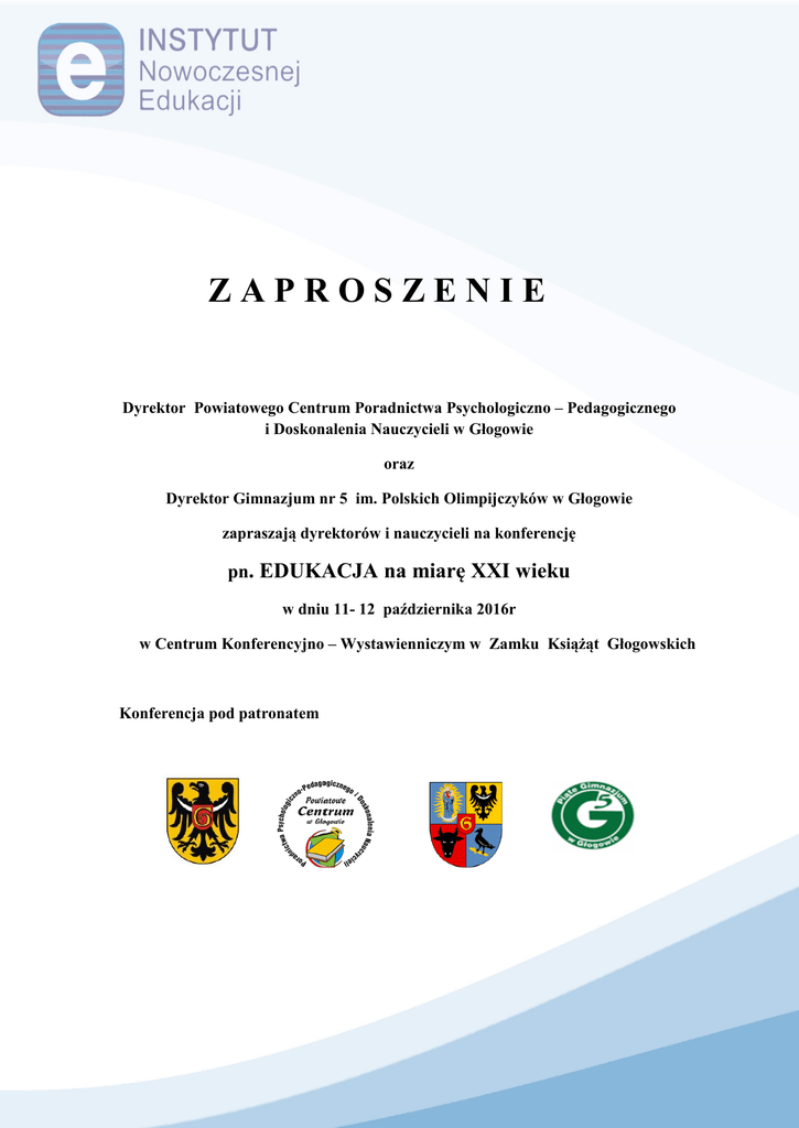 ZAPROSZENIE Dyrektor Powiatowego Centrum Poradnictwa Psychologiczno – Pedagogicznego i Doskonalenia Nauczycieli w Głogowie oraz Dyrektor Gimnazjum nr 5 im. Polskich Olimpijczyków w Głogowie zapraszają dyrektorów i nauczycieli na konferencję pn. EDUKACJA na miarę XXI wieku w dniu 11- 12 października 2016r w Centrum Konferencyjno – Wystawienniczym w Zamku Książąt Głogowskich Konferencja pod patronatem PROGRAM KONFERENCJI dzień I 11.10.2016 r. 9:30 – 10:00 10:10 – 10:30 Centrum Konferencyjno- Wystawiennicze w Zamku Książąt Głogowskich rejestracja uczestników otwarcie konferencji i przywitanie zaproszonych gości Barbara Krzywulicz dyrektor PCPPP i DN w Głogowie Iwona Lis prezes Fundacji Instytut Nowoczesnej Edukacji -Warszawa 10:30 – 11:45 Marta Miłoń - „W drodze do cyfryzacji edukacji autostradą A2K2 - czyli o czterech cechach nowoczesnej szkoły” 11:45 - 13:00 prof. dr hab. Maciej Sysło – „Nauka kodowania w szkole” 13:00 – 13:30 przerwa kawowa 13:30 – 15:00 Colin Rose – „Jak sprawić, by inwestycje w nowe technologie przełożyły się na sukces ucznia?” 15:00 - 15:15 oficjalne zakończenie konferencji i pożegnanie gości 15:15 - 15:30 wydanie zaświadczeń dla uczestników konferencji dzień II 12.10.2016 r. Gimnazjum nr 5 im. Polskich Olimpijczyków w Głogowie 10:10 – 10:15 - przywitanie przybyłych gości Alina Barnowicz – dyrektor Gimnazjum nr 5 Iwona Lis – prezes Fundacji Instytut Nowoczesnej Edukacji – Warszawa 10:15 – 10:30 - otwarcie nowoczesnej klasopracowni geograficznej, zadania realizowanego w ramach budżetu obywatelskiego miasta Głogowa w roku 2016 10:30 – 11:00 - Colin Rose – „Cyfrowa klasa klasą XXI wieku” 11:00 – 11:30 - Alina Baranowicz dyrektor Gimnazjum nr 5 w Głogowie „Jak ważne jest wprowadzenie nowych technologii do edukacji?” 11:30 – 12:30 - lekcja pokazowa na poziomie kształcenia ogólnego III etapu edukacyjnego 12:30 – 13:00 - zamknięcie konferencji PRELEGENCI Marta Miłoń - specjalista ds. szkoleń Fundacji Instytutu Nowoczesnej Edukacji w Warszawie; psychopedagog kreatywności, terapeuta pedagogiczny, nauczyciel, trener i wykładowca, odbyła wiele spotkań z nauczycielami, rodzicami, dziećmi i młodzieżą. prof. dr hab. Maciej Sysło – Wydział Matematyki i Informatyki Uniwersytetu Wrocławskiego, Wydział Matematyki i Informatyki Uniwersytetu Mikołaja Kopernika w Toruniu, matematyk, nauczyciel akademicki kierunków związanych z informatyką.; autor ponad 150 publikacji związanych z matematyką, informatyką i dydaktyką informatyki, współtwórca krajowej olimpiady informatycznej oraz wielu innych przedsięwzięć związanych z rozwojem polskiej edukacji. Colin Rose – wybitny brytyjski psycholog, doradca rządu brytyjskiego, światowy autorytet w dziedzinie efektywnego uczenia się – człowiek, który przeniósł nowoczesną psychologię uczenia się z zacisza gabinetów do świata praktycznej edukacji, dostępnej dla każdego człowieka; wykładowca, współtwórca brytyjskiej „Kampanii na Rzecz Uczenia się”, twórca popularnej metody efektywnego uczenia się przyjętej przez wiele szkół na świecie i w Polsce. Organizatorzy konferencji: Ośrodek Doradztwa Metodycznego – PCPPP i DN w Głogowie ul. Jedności Robotniczej 38 67-200 Głogów Gimnazjum nr 5 im. Polskich Olimpijczyków w Głogowie ul. Gwiaździsta 2 67-200 Głogów Fundacja Instytut Nowoczesnej Edukacji w Warszawie ul. Wyczółki 44 02-830 Warszawa Multitablica Sp. z o.o. w Warszawie ul. Wyczółki 44 02-820 Warszawa UWAGA WAŻNE Prosimy o telefoniczne potwierdzenie udziału w pierwszym i w drugim dniu konferencji ze względu na ograniczoną liczbę miejsc do dnia 06.10.2016r. pod nr tel. 76 838 42 93