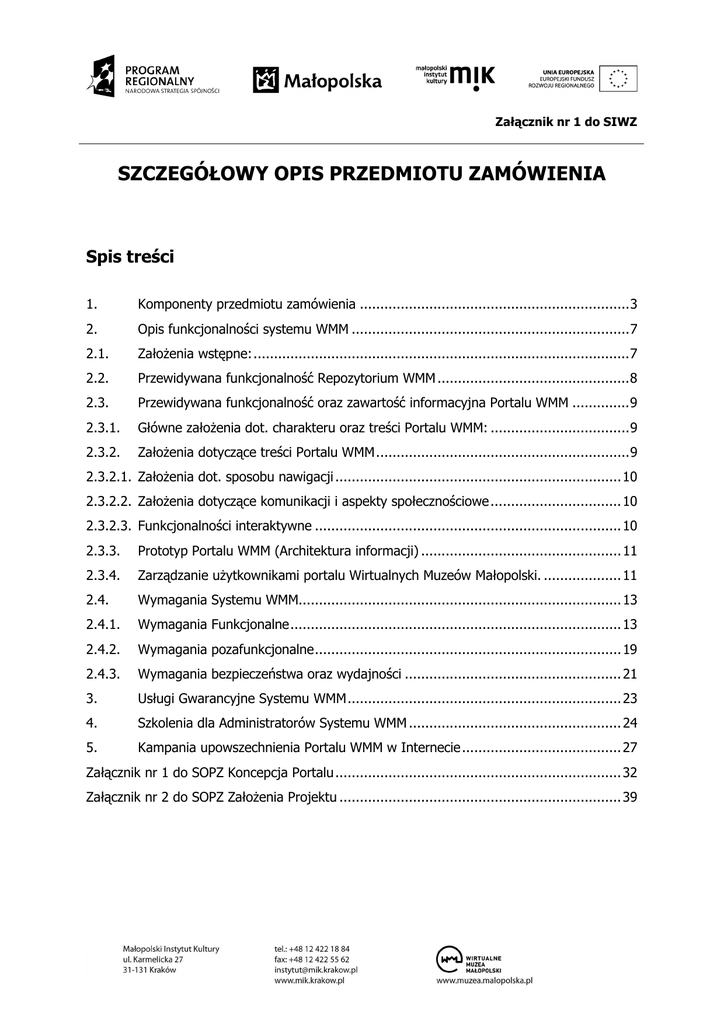 Załącznik nr 1 do SIWZ SZCZEGÓŁOWY OPIS PRZEDMIOTU ZAMÓWIENIA Spis treści 1. Komponenty przedmiotu zamówienia ..................................................................3 2. Opis funkcjonalności systemu WMM ....................................................................7 2.1. Założenia wstępne:............................................................................................7 2.2. Przewidywana funkcjonalność Repozytorium WMM ...............................................8 2.3. Przewidywana funkcjonalność oraz zawartość informacyjna Portalu WMM ..............9 2.3.1. Główne założenia dot. charakteru oraz treści Portalu WMM: ..................................9 2.3.2. Założenia dotyczące treści Portalu WMM..............................................................9 2.3.2.1. Założenia dot. sposobu nawigacji ......................................................................10 2.3.2.2. Założenia dotyczące komunikacji i aspekty społecznościowe ................................ 10 2.3.2.3. Funkcjonalności interaktywne ........................................................................... 10 2.3.3. Prototyp Portalu WMM (Architektura informacji) ................................................. 11 2.3.4. Zarządzanie użytkownikami portalu Wirtualnych Muzeów Małopolski. ................... 11 2.4. Wymagania Systemu WMM............................................................................... 13 2.4.1. Wymagania Funkcjonalne................................................................................. 13 2.4.2. Wymagania pozafunkcjonalne........................................................................... 19 2.4.3. Wymagania bezpieczeństwa oraz wydajności ..................................................... 21 3. Usługi Gwarancyjne Systemu WMM................................................................... 23 4. Szkolenia dla Administratorów Systemu WMM .................................................... 24 5. Kampania upowszechnienia Portalu WMM w Internecie ....................................... 27 Załącznik nr 1 do SOPZ Koncepcja Portalu ...................................................................... 32 Załącznik nr 2 do SOPZ Założenia Projektu ..................................................................... 39 SKRÓTY I DEFINICJE ZASTOSOWANE W TEKŚCIE Beneficjent, Wnioskodawca, Urząd Marszałkowski Województwa Małopolskiego UMWM GUS Główny Urząd Statystyczny Metadane Dane opisujące właściwości obiektu muzealnego, cyfrowego MIK Muzea MRPO Obiekt muzealny, obiekt Plan Projektu Podmiot Zarządzający, Partner Projektu Projekt, przedsięwzięcie, projekt kluczowy Portal, Portal WMM Regionalna Pracownia Digitalizacji Repozytorium, Repozytorium WMM RG System, System Wirtualnych Muzeów Małopolski, System WMM Upowszechnianie Portalu WMM WMM Wystawa wirtualna modelu obiektu muzealnego lub obiektu medialnego. Małopolski Instytut Kultury 35 muzeów z terenu Województwa Małopolskiego zaangażowanych w projekt na mocy trójstronnych porozumień podpisanych w dn. 4 marca 2010r. Małopolski Regionalny Program Operacyjny na lata 2007-2013 Fizyczny obiekt dziedzictwa kulturowego Dokument kontrolny dla zarządzania projektem. Definiuje organizację oraz procesy zarządzania oraz techniczne niezbędne do spełnienia założeń projektu. Małopolski Instytut Kultury „Wirtualne Muzea Małopolski” Planowany do stworzenia portal Wirtualnych Muzeów Małopolski pod adresem www.muzea.malopolska.pl Regionalna Pracownia Digitalizacji projektu „Wirtualne Muzea Małopolski” usytuowana w Wojewódzkiej Bibliotece Publicznej, ul. Rajska 1 w Krakowie, lokal nr 217, 2 piętro odpowiada za digitalizację 3D obiektów, które będą zamieszczane na Portalu Komponent Systemu WMM, planowany do stworzenia repozytorium zawierający zdigitalizowane obiekty. Departament Rozwoju Gospodarczego Urzędu Marszałkowskiego Województwa Małopolskiego Beneficjent System będący przedmiotem niniejszego zamówienia, obejmujący m.in. repozytorium (w tym: system do zarządzania wirtualnymi ekspozycjami i oprogramowanie bazodanowe) oraz portal (w tym: utworzenie strony internetowej) wraz z instalacją, pomocą techniczną i szkoleniami Upowszechnianie informacji dot. portalu Wirtualne Muzea Małopolski (WMM) w Internecie, zgodnie z wcześniej opracowaną Strategią „Wirtualne Muzea Małopolski” Wystawa cyfrowych modeli obiektów muzealnych zrealizowana przy wykorzystaniu technologii informacyjnych, w tym wirtualnej i wzbogaconej rzeczywistości oraz technologii WWW strona 2 z 42 1. Komponenty przedmiotu zamówienia Przedmiotem zamówienia jest „Zaprojektowanie, wykonanie i wdrożenie „Systemu Wirtualne Muzea Małopolski” w ramach projektu Wirtualne Muzea Małopolski, realizowanego w ramach Małopolskiego Regionalnego Programu Operacyjnego na lata 2007-2013. Założenia realizacji projektu stanowią załącznik nr 2 do SOPZ. 1.1. Zakres przedmiotu zamówienia obejmuje w szczególności: A. Budowa i wdrożenie Systemu Wirtualnych Muzeów Małopolski (System WMM, składającego się z Repozytorium WMM oraz Portalu WMM), w tym: 1) Opracowanie dokumentacji przedwdrożeniowej (Etap I), zawierającej: • Plan Projektu; • Analizę przedwdrożeniową; • Projekt Techniczny Systemu WMM (zawierający prototyp systemu WMM: Repozytorium i Portal; • Prototyp Systemu WMM: Interaktywne Prototypy Repozytorium i Prototyp Portalu. 2) Opracowanie Systemu WMM (Etap II), w tym: • Opracowanie Systemu WMM; • Dostarczenie odpowiedniego oprogramowania bazodanowego (wraz z wymaganymi licencjami); • Instalacja oprogramowania Systemu WMM; • Konfiguracja oprogramowania Systemu WMM; • Przeprowadzenie testów przez Wykonawcę oraz Zamawiającego; 3) Zatwierdzenie ostatecznej wersji Systemu WMM: Portalu WMM i Repozytorium WMM, Uruchomienie produkcyjne systemu WMM (Etap III), w tym: • Uzupełnianie treści Portalu WMM