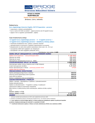 STUDY & WORK AUSTRALIA Kaplan International Colleges (Brisbane, Cairns, Adelaide) Rodzaj kursu Kurs angielskiego Intensive English, IELTS Preparation - poranne * rozpoczęcie z każdym poniedziałkiem * kurs w cenie 215 AUD za tydzień - zajęcia poranne (od 24 tygodni kursu) * zajęcia 5 dni w tygodniu (poniedziałek - piątek) Czas trwania kursu (wizy) 12 tygodni kursu angielskiego poranne + 4 - 6 tygodni przerwy + 12 tygodni kursu angielskiego poranne + dodatkowy miesiąc pobytu * możliwość przedłużenia wizy i pobytu z poziomu Australii * zakwaterowanie na pierwsze 4 tygodnie organizowane na życzenie * ubezpieczenie na cały okres pobytu (szacowany okres wizy: ok.. 8 m-cy) * oszczędność 2400 AUD względem cen oficjalnych! * oszczędność 144 AUD względem podwyżek 2017! Orientacyjny kurs waluty 1 AUD 3,20 PLN SUMA OPŁAT ZWIĄZANYCH Z WYKUPIENIEM KURSU Opłata za kurs językowy - cena promocyjna 2016 Wpisowe do szkoły Materiały do nauki Obowiązkowe ubezpieczenie na 8 m-cy OSHC PODSUMOWANIE OPŁAT ZA NAUKĘ Obowiązująca opłata wizowa ustalona przez Urząd Imigracji Credit Card payment (0,98%) Koszty administracyjne w Polsce - promocja grudzień 2016 5 160 AUD 250 AUD 288 AUD 292 AUD 5 990 AUD 550 AUD 5,39 AUD 0 PLN (opłata 490 PLN zniesiona) ŚWIADCZENIA DODATKOWE Opieka polskojęzycznego biura w Sydney GRATIS Otwarcie konta bankowego przed wyjazdem GRATIS Karta SIM do telefonu GRATIS Pomoc w znalezieniu pracy po przyjeździe GRATIS ZAKWATEROWANIE I PRZELOT Odbiór z lotniska - obowiązkowy w pakiecie z zakwaterowaniem Rodzaj zakwaterowania Opłata za zakwaterowanie - 4 tygodnie w pokoju 2 osobowym Jednorazowa opłata za rezerwacje mieszkania Bilet lotniczy w jedną stronę (cena orientacyjna, zależna od daty wylotu) Inne Razem opłaty w PLN Razem opłaty w AUD RAZEM * końcowa wartość jest przeliczona na PLN i jest uzależniona od kursu AUD ** kosztorys przedstawia jedynie orientacyjną wartość kursu i nie stanowi oferty handlowej *** przy wpłacie na konto Bridge Agency w Polsce pobierana dodatkowa opłata na pokrycie kosztów przelewu międzynarodowego do Australii w wysokości 45 AUD *** możliwość dokonania wpłaty w Polsce na konto złotówkowe (PLN) oraz walutowe (AUD) 0 PLN 6 545 AUD 20 945 PLN