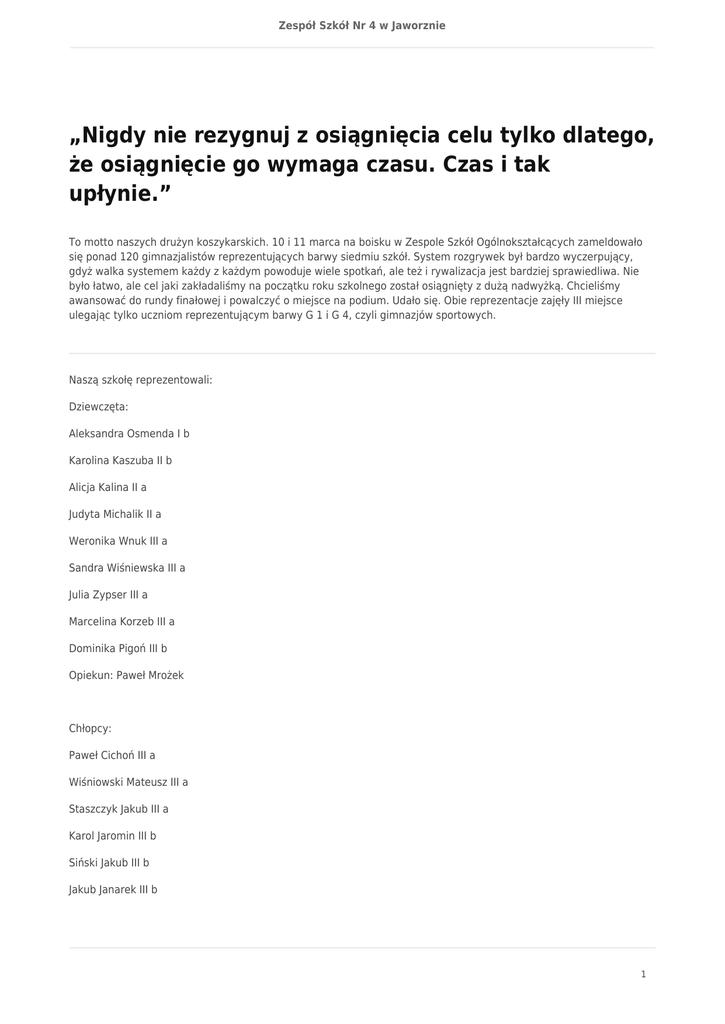 Zespół Szkół Nr 4 w Jaworznie „Nigdy nie rezygnuj z osiągnięcia celu tylko dlatego, że osiągnięcie go wymaga czasu. Czas i tak upłynie.” To motto naszych drużyn koszykarskich. 10 i 11 marca na boisku w Zespole Szkół Ogólnokształcących zameldowało się ponad 120 gimnazjalistów reprezentujących barwy siedmiu szkół. System rozgrywek był bardzo wyczerpujący, gdyż walka systemem każdy z każdym powoduje wiele spotkań, ale też i rywalizacja jest bardziej sprawiedliwa. Nie było łatwo, ale cel jaki zakładaliśmy na początku roku szkolnego został osiągnięty z dużą nadwyżką. Chcieliśmy awansować do rundy finałowej i powalczyć o miejsce na podium. Udało się. Obie reprezentacje zajęły III miejsce ulegając tylko uczniom reprezentującym barwy G 1 i G 4, czyli gimnazjów sportowych. Naszą szkołę reprezentowali: Dziewczęta: Aleksandra Osmenda I b Karolina Kaszuba II b Alicja Kalina II a Judyta Michalik II a Weronika Wnuk III a Sandra Wiśniewska III a Julia Zypser III a Marcelina Korzeb III a Dominika Pigoń III b Opiekun: Paweł Mrożek Chłopcy: Paweł Cichoń III a Wiśniowski Mateusz III a Staszczyk Jakub III a Karol Jaromin III b Siński Jakub III b Jakub Janarek III b 1 Zespół Szkół Nr 4 w Jaworznie Dawid Sowa III b Jakub Kaszowski II a Maksymilian Wnęczak II a Opiekun: Mariusz Kowalski Poniżej wyniki dwudniowej rywalizacji: Dziewczęta : 1. 2. 3. 4. 5. G4 G1 G9 G7 G 10 Chłopcy: 1. 2. 3. 4. 5. G4 G1 G9 G7 G5 Opracował: Kowalski Mariusz 2