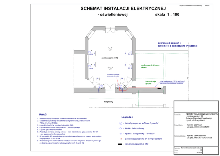 SCHEMAT INSTALACJI ELEKTRYCZNEJ - oœwietleniowej c strona ...... skala 1 : 100 ochrona od pora¿eñ : system TN-S samoczynne wyù¹czanie d e 60 f 60 3x9 W Projekt architektoniczno-budowlany 3x9 W 60 e 60 pomieszczenie nr 13 a 3x9 W f 3x9 W b pomieszczenie biurowe (piêtro) do obwodu kinkietów do obwodu ¿yrandoli 64 64 c d h obw. oœwietleniowy YDYp 3x1,5 mm2 wprowadziã do istniej¹cej rozdzielni W ef P a b komunikacja (piêtro) h w i g 3x9 W 3x9 W g hol gùówny UWAGI : 1. Nale¿y odù¹czyã istniej¹ce zasilanie oœwietlenia w rozdzielni RG. 2. Caùoœã nowej instalacji oœwietleniowej wykonac jako p/t przewodami YDYp 3x1,5 mm2 700V. 3. £¹czniki obsadziã w puszkach gùêbokich fi 60 . 4. £¹czniki zamontowaã na wysokoœci 1,30 m od podùogi. 5. £¹cznik typu metal stare zùote. 6. Projektuje siê nowe kinkiety œcienne - retro z œwietlówk¹ typu œwieczka 3x9 W. nas wysokoœci 2,0 m od podùogi. 7. W rozdzielni RG now¹ instalacjê oœwietleniow¹ zabezpieczyã nowym wyù¹cznikiem nadpr¹dowym S301 B 16A. 8. Przenieœã ù¹cznik podœwietlenia witra¿y z korytarza na piêtrze do sali i wykonaã go na œcianie przy drzwiach wejœciowych gùównych (ù¹cznik "i"). Legenda : - istniej¹ca oprawa sufitowa /¿yrandol - kinkiet œwiecznikowy - ù¹cznik 2-biegunowy 16A/230V - puszka rozgaùezienia p/t fi 80 po sufitem Projekt: Projektant: REMONT POMIESZCZEÑ STAROSTWA - pomieszczenia nr 13 Budynek Starostwa Powiatowego Lêbork, ul. Czoùgistów 5 mgr in¿. Leon Kruk upr. proj. nr UAN.8342/45/90 Sprawdzajacy: mgr in¿. Jan Grabowski upr. proj. nr BK.II.F.7342/324/98 - istniej¹ca rozdzielnia RG Rysunek: Schemat instalacji elektr.-oœwietl. Skala: Data: 1 : 100 2012-02
