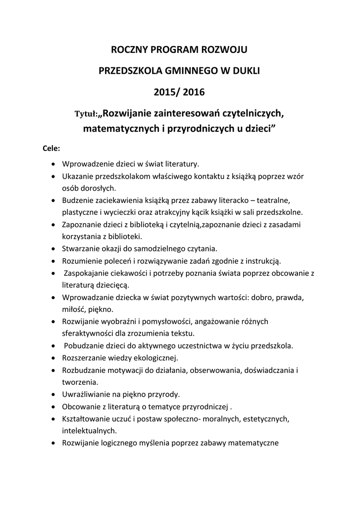 ROCZNY PROGRAM ROZWOJU PRZEDSZKOLA GMINNEGO W DUKLI 2015/ 2016 Tytuł:„Rozwijanie zainteresowań czytelniczych, matematycznych i przyrodniczych u dzieci” Cele: Wprowadzenie dzieci w świat literatury. Ukazanie przedszkolakom właściwego kontaktu z książką poprzez wzór osób dorosłych. Budzenie zaciekawienia książką przez zabawy literacko – teatralne, plastyczne i wycieczki oraz atrakcyjny kącik książki w sali przedszkolne. Zapoznanie dzieci z biblioteką i czytelnią,zapoznanie dzieci z zasadami korzystania z biblioteki. Stwarzanie okazji do samodzielnego czytania. Rozumienie poleceń i rozwiązywanie zadań zgodnie z instrukcją. Zaspokajanie ciekawości i potrzeby poznania świata poprzez obcowanie z literaturą dziecięcą. Wprowadzanie dziecka w świat pozytywnych wartości: dobro, prawda, miłość, piękno. Rozwijanie wyobraźni i pomysłowości, angażowanie różnych sferaktywności dla zrozumienia tekstu. Pobudzanie dzieci do aktywnego uczestnictwa w życiu przedszkola. Rozszerzanie wiedzy ekologicznej. Rozbudzanie motywacji do działania, obserwowania, doświadczania i tworzenia. Uwrażliwianie na piękno przyrody. Obcowanie z literaturą o tematyce przyrodniczej . Kształtowanie uczuć i postaw społeczno- moralnych, estetycznych, intelektualnych. Rozwijanie logicznego myślenia poprzez zabawy matematyczne TERMIN SPOSÓB REALIZACJI ODPOWIEDZIALNI ZA WYKONANIE Dziecko w świecie literatury wrzesień Tworzenie w salach Kącików Książki, troska o ich estetykę (cały rok) Czytanie utworów literackich przez zaproszonych gości (cały rok) Comiesięczne spotkania teatralne Tworzenie albumu przeczytanych książek w grupie Misiów (cały rok) Codzienne czytanie bajek w grupach Wycieczka „ W poszukiwaniu jesieni”(IX –X) Sprzątanie świata Prenumerata czasopism dziecięcych Wszyscy nauczyciele Wszyscy nauczyciele Dyrektor M. Szczurek D. Józefczyk Wszystkie nauczycielki Nauczyciele starszych grup dyrektor Jesień w literaturze październik Tworzenie kącików przyrody w każdej sali (cały rok) Wyjazd do teatru Jesienny Konkurs Plastyczny „Jesień w wierszach” Rola pośrednika w odbiorze utworów literackich (pedagogizacja rodziców) Jesienny konkurs poezji Zabawy w sklep z wykorzystaniem materiału przyrodniczego Wykorzystanie w czasie zajęć zgromadzonego materiału przyrodniczego Wszyscy nauczyciele Wszyscy nauczyciele A. Jaworska A.Buczyńska Pac Małgorzata Głód Wszyscy nauczyciele Wszyscy nauczyciele Wszyscy nauczyciele Książka na jesienną szarugę listopad Zawiązanie współpracy z Domem Pomocy Środowiskowej Miś bohaterem utworów literackich Czytanie w domu z rodzicami – konkurs „Zakładka do książki” Spotkanie z Leśnikiem (całe przedszkole) dyrektor i naucz. Wszyscynauczyciele I. Walaszek K. Michno M. Głód I. Walaszek Świąteczne Bajanie grudzień Kiermasz świąteczny- dochód przeznaczony na doposażenie Kącików Książki Przekazywanie tradycji i obrzędów Wszyscy nauczyciele Wszyscy nauczyciele Bożonarodzeniowych Oglądanie bajek o tematyce świątecznej „Boże Narodzenie”- album w obrazkach (Biblia narodzenia) I. Walaszek M. Szczurek W teatrze styczeń Teatrzyk cieni –znane bajki Zaangażowanie rodziców do wykonania kukiełek do określonej bajki Zorganizowanie przedstawienia kukiełkowego Zabawy w formie dramy Inscenizacja na podstawie wybranego utworu literackiego Małgorzata Szczurek D. Józefczyk K. Michno Wszyscy nauczyciele A.Pelczar M. Zawada Znamy te bajki luty Wspólne czytanie bajek w domu przez rodziców, rysowanie ilustracji przez dziecko i rodzica, wykonanie albumu „Mój ulubiony bohater”- konkurs plastyczny (starsze grupy) Wspólne opowiadanie znanych bajek w oparciu o ilustrowane książki M. Zawada A. Pelczar Uliasz U. Aszlar M. Szczurek D. Józefczyk Wszyscy nauczyciele Matematyka na wesoło marzec Quiz matematyczny A. Jaworska A. Buczyńska Pac Wprowadzanie pojęć matematycznych w oparciu o wiersze z literatury dziecięcej Zabawy w sklep- ważenie Sadzenie roślin w kąciku przyrody Dzień zabaw matematycznych Dzień figur geometrycznych Wszyscy nauczyciele Małgorzata Głód Wiosna wokół nas kwiecień Małgorzata Głód Konkurs wiersza o wiośnie Wykorzystanie książek popularno –naukowych Wszystkie nauczycielki (albumy, książki przyrodnicze, czasopisma) w poznawaniu przyrody Słuchanie bajek przez dzieci w otoczeniu przyrody Prowadzenie zabaw badawczych np. ile kropek ma biedronka Wycieczka do Karpackich Parków Krajobrazowych D. Józefczyk M. Szczurek KLUB MŁODEGO CZYTELNIKA maj Wizyta w bibliotece Nawiązanie współpracy z LO i SP (uczniowie czytają przedszkolakom) Pedagogizacja rodziców – artykuły na str. Internetowej przedszkola i na gazetce Wizyta w księgarni, zakup książki Najpiękniejsza bajka – konkurs dla dzieci i rodziców Spotkanie z poetą Chętni nauczyciele dyrektor Wszystkie nauczycielki K. Michno, M.Głód, U. Aszlar I. Walaszek Letnie atrakcje czerwiec III Piknik Rodzinny Dzień Dziecka - wyjście do kina Organizowanie w poszczególnych grupach wycieczek edukacyjnych i krajoznawczych odwiedzenie dworku M. Konopnickiej w Żarnowcu Turniej sportowy grup zerowych Naucz. i rodzice Wszyscynauczyciele Wszyscynauczyciele M. Zawada A. Pelczar Uliasz Opracował Zespół Edukacyjny Przedszkola