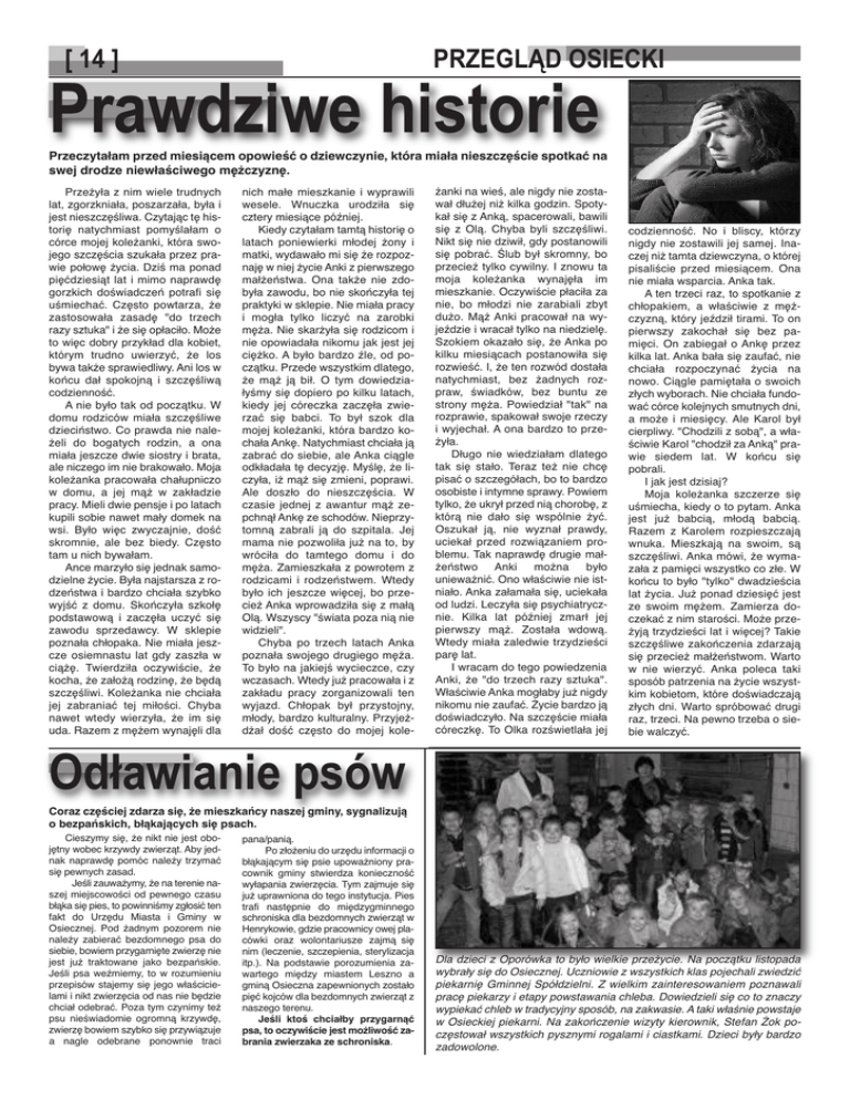 [ 14 ] PRZEGLĄD OSIECKI Prawdziwe historie Przeczytałam przed miesiącem opowieść o dziewczynie, która miała nieszczęście spotkać na swej drodze niewłaściwego mężczyznę. Przeżyła z nim wiele trudnych lat, zgorzkniała, poszarzała, była i jest nieszczęśliwa. Czytając tę historię natychmiast pomyślałam o córce mojej koleżanki, która swojego szczęścia szukała przez prawie połowę życia. Dziś ma ponad pięćdziesiąt lat i mimo naprawdę gorzkich doświadczeń potrafi się uśmiechać. Często powtarza, że zastosowała zasadę "do trzech razy sztuka" i że się opłaciło. Może to więc dobry przykład dla kobiet, którym trudno uwierzyć, że los bywa także sprawiedliwy. Ani los w końcu dał spokojną i szczęśliwą codzienność. A nie było tak od początku. W domu rodziców miała szczęśliwe dzieciństwo. Co prawda nie należeli do bogatych rodzin, a ona miała jeszcze dwie siostry i brata, ale niczego im nie brakowało. Moja koleżanka pracowała chałupniczo w domu, a jej mąż w zakładzie pracy. Mieli dwie pensje i po latach kupili sobie nawet mały domek na wsi. Było więc zwyczajnie, dość skromnie, ale bez biedy. Często tam u nich bywałam. Ance marzyło się jednak samodzielne życie. Była najstarsza z rodzeństwa i bardzo chciała szybko wyjść z domu. Skończyła szkołę podstawową i zaczęła uczyć się zawodu sprzedawcy. W sklepie poznała chłopaka. Nie miała jeszcze osiemnastu lat gdy zaszła w ciążę. Twierdziła oczywiście, że kocha, że założą rodzinę, że będą szczęśliwi. Koleżanka nie chciała jej zabraniać tej miłości. Chyba nawet wtedy wierzyła, że im się uda. Razem z mężem wynajęli dla nich małe mieszkanie i wyprawili wesele. Wnuczka urodziła się cztery miesiące później. Kiedy czytałam tamtą historię o latach poniewierki młodej żony i matki, wydawało mi się że rozpoznaję w niej życie Anki z pierwszego małżeństwa. Ona także nie zdobyła zawodu, bo nie skończyła tej praktyki w sklepie. Nie miała pracy i mogła tylko liczyć na zarobki męża. Nie skarżyła się rodzicom i nie opowiadała nikomu jak jest jej ciężko. A było bardzo źle, od początku. Przede wszystkim dlatego, że mąż ją bił. O tym dowiedziałyśmy się dopiero po kilku latach, kiedy jej córeczka zaczęła zwierzać się babci. To był szok dla mojej koleżanki, która bardzo kochała Ankę. Natychmiast chciała ją zabrać do siebie, ale Anka ciągle odkładała tę decyzję. Myślę, że liczyła, iż mąż się zmieni, poprawi. Ale doszło do nieszczęścia. W czasie jednej z awantur mąż zepchnął Ankę ze schodów. Nieprzytomną zabrali ją do szpitala. Jej mama nie pozwoliła już na to, by wróciła do tamtego domu i do męża. Zamieszkała z powrotem z rodzicami i rodzeństwem. Wtedy było ich jeszcze więcej, bo przecież Anka wprowadziła się z małą Olą. Wszyscy "świata poza nią nie widzieli". Chyba po trzech latach Anka poznała swojego drugiego męża. To było na jakiejś wycieczce, czy wczasach. Wtedy już pracowała i z zakładu pracy zorganizowali ten wyjazd. Chłopak był przystojny, młody, bardzo kulturalny. Przyjeżdżał dość często do mojej kole- Odławianie psów żanki na wieś, ale nigdy nie zostawał dłużej niż kilka godzin. Spotykał się z Anką, spacerowali, bawili się z Olą. Chyba byli szczęśliwi. Nikt się nie dziwił, gdy postanowili się pobrać. Ślub był skromny, bo przecież tylko cywilny. I znowu ta moja koleżanka wynajęła im mieszkanie. Oczywiście płaciła za nie, bo młodzi nie zarabiali zbyt dużo. Mąż Anki pracował na wyjeździe i wracał tylko na niedzielę. Szokiem okazało się, że Anka po kilku miesiącach postanowiła się rozwieść. I, że ten rozwód dostała natychmiast, bez żadnych rozpraw, świadków, bez buntu ze strony męża. Powiedział "tak" na rozprawie, spakował swoje rzeczy i wyjechał. A ona bardzo to przeżyła. Długo nie wiedziałam dlatego tak się stało. Teraz też nie chcę pisać o szczegółach, bo to bardzo osobiste i intymne sprawy. Powiem tylko, że ukrył przed nią chorobę, z którą nie dało się wspólnie żyć. Oszukał ją, nie wyznał prawdy, uciekał przed rozwiązaniem problemu. Tak naprawdę drugie małżeństwo Anki można było unieważnić. Ono właściwie nie istniało. Anka załamała się, uciekała od ludzi. Leczyła się psychiatrycznie. Kilka lat później zmarł jej pierwszy mąż. Została wdową. Wtedy miała zaledwie trzydzieści parę lat. I wracam do tego powiedzenia Anki, że "do trzech razy sztuka". Właściwie Anka mogłaby już nigdy nikomu nie zaufać. Życie bardzo ją doświadczyło. Na szczęście miała córeczkę. To Olka rozświetlała jej codzienność. No i bliscy, którzy nigdy nie zostawili jej samej. Inaczej niż tamta dziewczyna, o której pisaliście przed miesiącem. Ona nie miała wsparcia. Anka tak. A ten trzeci raz, to spotkanie z chłopakiem, a właściwie z mężczyzną, który jeździł tirami. To on pierwszy zakochał się bez pamięci. On zabiegał o Ankę przez kilka lat. Anka bała się zaufać, nie chciała rozpoczynać życia na nowo. Ciągle pamiętała o swoich złych wyborach. Nie chciała fundować córce kolejnych smutnych dni, a może i miesięcy. Ale Karol był cierpliwy. "Chodzili z sobą", a właściwie Karol "chodził za Anką" prawie siedem lat. W końcu się pobrali. I jak jest dzisiaj? Moja koleżanka szczerze się uśmiecha, kiedy o to pytam. Anka jest już babcią, młodą babcią. Razem z Karolem rozpieszczają wnuka. Mieszkają na swoim, są szczęśliwi. Anka mówi, że wymazała z pamięci wszystko co złe. W końcu to było "tylko" dwadzieścia lat życia. Już ponad dziesięć jest ze swoim mężem. Zamierza doczekać z nim starości. Może przeżyją trzydzieści lat i więcej? Takie szczęśliwe zakończenia zdarzają się przecież małżeństwom. Warto w nie wierzyć. Anka poleca taki sposób patrzenia na życie wszystk