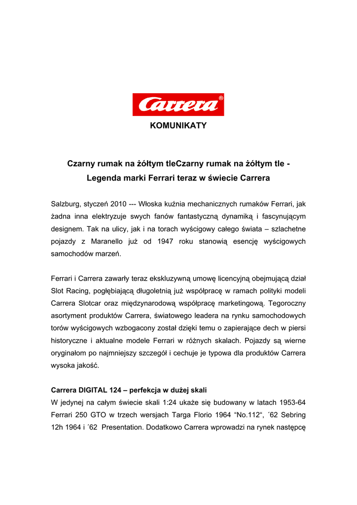 KOMUNIKATY Czarny rumak na żółtym tleCzarny rumak na żółtym tle Legenda marki Ferrari teraz w świecie Carrera Salzburg, styczeń 2010 --- Włoska kuźnia mechanicznych rumaków Ferrari, jak żadna inna elektryzuje swych fanów fantastyczną dynamiką i fascynującym designem. Tak na ulicy, jak i na torach wyścigowy całego świata – szlachetne pojazdy z Maranello już od 1947 roku stanowią esencję wyścigowych samochodów marzeń. Ferrari i Carrera zawarły teraz ekskluzywną umowę licencyjną obejmującą dział Slot Racing, pogłębiającą długoletnią już współpracę w ramach polityki modeli Carrera Slotcar oraz międzynarodową współpracę marketingową. Tegoroczny asortyment produktów Carrera, światowego leadera na rynku samochodowych torów wyścigowych wzbogacony został dzięki temu o zapierające dech w piersi historyczne i aktualne modele Ferrari w różnych skalach. Pojazdy są wierne oryginałom po najmniejszy szczegół i cechuje je typowa dla produktów Carrera wysoka jakość. Carrera DIGITAL 124 – perfekcja w dużej skali W jedynej na całym świecie skali 1:24 ukaże się budowany w latach 1953-64 Ferrari 250 GTO w trzech wersjach Targa Florio 1964 “No.112“, ´62 Sebring 12h 1964 i ´62 Presentation. Dodatkowo Carrera wprowadzi na rynek następcę 250, Ferrari 330 w wersji „P3/4 No.22" oraz zaprezentowany w roku 1976 Ferrari 412P w wersji „NART ´67“. Carrera DIGITAL 132 – najnowsze rozwiązania techniczne napotykają włoską sztukę budowy pojazdów W systemach w skali 1:32 z układem cyfrowym będzie można spotkać Ferrari w dwóch zestawach i 5ciu oddzielnych pojazdach. Wraz z zestawem „Formula Racing“ i Ferrari F1 2010 Fernando Alonso w domowym zaciszu zagości prawdziwa atmosfera wyścigów formuły 1. W zestawie „Ferrari Competition“ piloci zasiądą za kierownicą Ferrari 599 XX w wersji race i „Geneva Motorshow“ w wersji Presentation. Na cyfrowym torze miłośnicy Carrera będą mogli bliżej poznać Ferrari 458 Italia, najnowszy model samochodu wyścigowego Coupé z Maranello w dwóch wersjach. Carrera Evolution: Ferrari niezrównane również w wersji klasycznej Również system analogowy Carrera Evolution oferuje bolidy marzeń Scuderia. Zestawy „Ferrari Racing“ z dwoma Ferrari 599 XX i „Ferrari Racing“ z Ferrari F1 2010, w którym Fernando Alonso podejmie pojedynek z McLaren-Mercedes MP4-24 „No.1“ zapewnią szybsze bicie serca. Dodatkowo również tutaj na start czekają oba modele Ferrari 458 Italia.. Carrera DIGITAL 143 – cyfrowy przygoda ze skaczącym rumakiem W układzie cyfrowym w skali 1:43 Fernando Alonso w Ferrari F1 2010 spotyka w zestawie „Full Speed“ Sebastiana Vettela w Red Bull RB5. F1 2010 jest tak jak i Ferrari 599 XX jako model „Geneva Motorshow“ dostępny także oddzielnie. Carrera GO!!! – spektakularne akcje powered by Ferrari W zestawie „Formula Cup“ Fernando Alonso w F1 2010 napotyka na McLaren Mercedes MP4-24, a w zestawie „Formula Masters“ na Sebastiana Vettelsa w Red Bull RB5. W zestawie „Formula Champions“ przeżyć można jego pojedynek z francuskim Renault a w „Ferrari Champions“ walczy przeciwko koledze z tej samej stajni Felipe Massa. Zestaw „Sportcar Stars“ fascynuje poza tym emocjami, jakie rodzą się w pojedynku Ferrari 599 XX z Porsche GT3 Cup. W zestawie „Ferrari Challenge“ do akcji wkraczają dwie wersje 599 XX. Ferrari 599 XX i F1 2010 znaleźć można także jako oddzielne pojazdy w bogatym asortymencie akcesoriów Carrera GO!!!. Kontakt dla prasy: Jürgen Brückmann Brückmann, Agentur für Kommunikation Bergstrasse 131 69121 Heidelberg Tel.: +49 (0) 6221 471153 Fax.: +49 (0) 6221 471205 Mobil: +49 (0) 160 96409610 e-mail: [email protected]