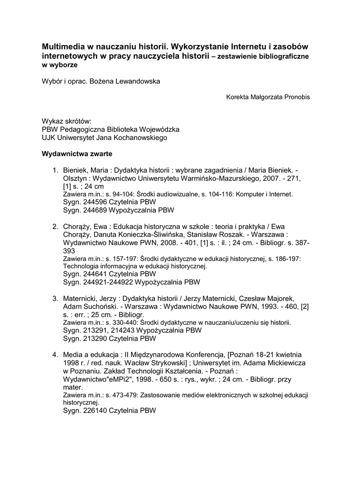 Multimedia w nauczaniu historii. Wykorzystanie Internetu i zasobów internetowych w pracy nauczyciela historii – zestawienie bibliograficzne w wyborze Wybór i oprac. Bożena Lewandowska Korekta Małgorzata Pronobis Wykaz skrótów: PBW Pedagogiczna Biblioteka Wojewódzka UJK Uniwersytet Jana Kochanowskiego Wydawnictwa zwarte 1. Bieniek, Maria : Dydaktyka historii : wybrane zagadnienia / Maria Bieniek. Olsztyn : Wydawnictwo Uniwersytetu Warmińsko-Mazurskiego, 2007. - 271, [1] s. ; 24 cm Zawiera m.in.: s. 94-104: Środki audiowizualne, s. 104-116: Komputer i Internet. Sygn. 244596 Czytelnia PBW Sygn. 244689 Wypożyczalnia PBW 2. Chorąży, Ewa : Edukacja historyczna w szkole : teoria i praktyka / Ewa Chorąży, Danuta Konieczka-Śliwińska, Stanisław Roszak. - Warszawa : Wydawnictwo Naukowe PWN, 2008. - 401, [1] s. : il. ; 24 cm. - Bibliogr. s. 387393 Zawiera m.in.: s. 157-197: Środki dydaktyczne w edukacji historycznej, s. 186-197: Technologia informacyjna w edukacji historycznej. Sygn. 244641 Czytelnia PBW Sygn. 244921-244922 Wypożyczalnia PBW 3. Maternicki, Jerzy : Dydaktyka historii / Jerzy Maternicki, Czesław Majorek, Adam Suchoński. - Warszawa : Wydawnictwo Naukowe PWN, 1993. - 460, [2] s. : err. ; 25 cm. - Bibliogr. Zawiera m.in.: s. 330-440: Środki dydaktyczne w nauczaniu/uczeniu się historii. Sygn. 213291, 214243 Wypożyczalnia PBW Sygn. 213290 Czytelnia PBW 4. Media a edukacja : II Międzynarodowa Konferencja, [Poznań 18-21 kwietnia 1998 r. / red. nauk. Wacław Strykowski] ; Uniwersytet im. Adama Mickiewicza w Poznaniu. Zakład Technologii Kształcenia. - Poznań : Wydawnictwo"eMPi2", 1998. - 650 s. : rys., wykr. ; 24 cm. - Bibliogr. przy mater. Zawiera m.in.: s. 473-479: Zastosowanie mediów elektronicznych w szkolnej edukacji historycznej. Sygn. 226140 Czytelnia PBW 5. Metody komputerowe w badaniach i nauczaniu historii / red. Krzysztof Narojczyk, Bohdan Ryszewski. - Olsztyn : Wydawnictwo Uniwersytetu Warmińsko-Mazurskiego, cop. 2005. - 177 s. : il. ; 24 cm Biblioteka UJK 6. Multimedia w edukacji historycznej i społecznej / red. nauk. Janusz Rulka, Barbara Tarnowska. - Bydgoszcz : Wydawnictwo Akademii Bydgoskiej im. Kazimierza Wielkiego, 2002. - 305, [2] s. : il., wykr. ; 24 cm Czytelnia Pedagogiczna UJK Biblioteka UJK 7. Nowe media w edukacji / red. Tadeusz Lewowicki, Bronisław Siemieniecki.. Toruń : Wydawnictwo Adam Marszałek, cop. 2012. - 265 s. : il. ; 23 cm. (Multimedialna Biblioteka Pedagogiczna). - Bibliogr. przy rozdz. Zawiera m.in.: nowe technologie w kształceniu, fotografia dydaktyczna w programach multimedialnych - na przykładzie programu do podręcznika historii „Śladami przeszłości” dla klasy pierwszej gimnazjum. Czytelnia Pedagogiczna UJK 8. Współczesna dydaktyka historii : zarys encyklopedyczny : dla nauczycieli i studentów / pod red. Jerzego Maternickiego ; Maria Bieniek [et. al.]. Warszawa : „Juka”, 2004. - 470,[1] s. ; 24 cm. - Bibliogr. s. 452-455 Zawiera m.in.: s. 142-143: Internet w nauczaniu – uczeniu się historii, s. 308-309: Programy komputerowe w nauczaniu i uczeniu się historii. Sygn. 238954 Czytelnia PBW Sygn. 240220 Wypożyczalnia PBW 9. Zielecki, Alojzy : Wprowadzenie do dydaktyki historii / Alojzy Zielecki. - Kraków : „Avalon”, 2007. - 384 s. ; 20 cm. - Bibliogr. s. 377-379 i przy rozdz. Zawiera m.in.: s. 264-271: Historyczna edukacja medialna, s. S. 269-271: Internetowa edukacja historyczna. Technologia kształcenia, s. 283-366 : Środki edukacji historycznej. Sygn. 244056 Czytelnia PBW Sygn. 242714 Wypożyczalnia PBW Wydawnictwa ciągłe (dostępne w Czytelni PBW) 10. Ausz, Anna : Metody nauczania historii a multimedia : możliwości zastosowania komputera w metodzie projektów - teoria i praktyka / Anna Ausz, Mariusz Ausz // „Wiadomości Historyczne”. - 2011, nr 3, s. 21-29 Przykłady projektów edukacyjnych z wykorzystaniem multimediów. 11. Chomicki, Grzegorz : Próby integrowania historii i informatyki (z doświadczeń szkół krakowskich) / Grzegorz Chomicki // „Wiadomości Historyczne” . - 1999, nr 2, s. 89-91 Komputery w nauczaniu historii. 12. Gregorczyk, Grażyna : Programy edukacyjne wspomagające nauczanie historii / Grażyna Gregorczyk // „Komputer w Szkole” . - 1996, nr 6, s.62-74 Zaprezentowano kilka programów komputerowych. 13. Hoszowska, Mariola : Historia świata jako pomoc w nauczaniu historii / Mariola Hoszowska // „Wiadomości Historyczne”. - 1997, nr 2, s. 94-98 Program komputerowy. 14. Julkowska, Violetta : Historia dla nowej generacji / Violetta Julkowska // „Edukacja Medialna”. - 2000, nr 2, s. 7-11. - Bibliogr. Nowa filozofia edukacji historycznej. Modyfikacja tradycyjnej struktury lekcji. Nowoczesny warsztat edukacji - podręczniki, multimedialne pakiety edukacyjne, komputerowe programy historyczne. 15. Julkowska, Violetta : Media w warsztacie nauczyciela historii / Violetta Julkowska // „Edukacja Medialna”. - 2000, nr 2, s. 49 Filmoteka, programy multimedialne, multimedialne pakiety edukacyjne, adresy internetowe. 16. Jurek, Krzysztof : Internet w pracy nauczyciela historii / Krzysztof Jurek // „Wiadomości Historyczne”. - 2001, [nr] 4, s. 212-219 17. Konigsberg, Grzegorz : Multimedialny program ,,Nowa Sól’’ - przykład oryginalnego propagowania problematyki regionalnej w szkole średniej / Grzegorz Konigsberg // „Geografia w Szkole”. - 1999, nr 4, s. 228 Program zawiera tematy przyrodnicze, gospodarcze i historyczne. 18. Majewski, Piotr M. : Sprawdź swą wiedzę / Piotr M. Majewski// „Mówią Wieki”. - 2001, nr 6, s. 56-57 Historia ludzkości. Teoria i testy - pomoc w nauczaniu historii, CD-ROM wydany przez firmę Mark Soft. 19. Osiński, Zbigniew : Edukacja historyczna w Internecie - mrzonki czy realne możliwości? / Zbigniew Osiński // „Wiadomości Historyczne”. - 2007, nr 1, s. 511 Edukacyjne wykorzystanie technologii informacyjnej w nauczaniu historii. 20. Osiński, Zbigniew : Internetowe zasoby dla nauczycieli historii / Zbi