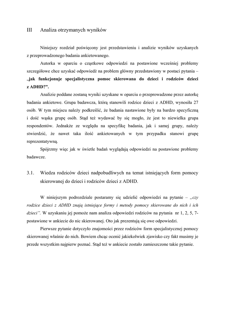 III Analiza otrzymanych wyników Niniejszy rozdział poświęcony jest przedstawieniu i analizie wyników uzyskanych z przeprowadzonego badania ankietowanego. Autorka w oparciu o cząstkowe odpowiedzi na postawione wcześniej problemy szczegółowe chce uzyskać odpowiedź na problem główny przedstawiony w postaci pytania – „jak funkcjonuje specjalistyczna pomoc skierowana do dzieci i rodziców dzieci z ADHD?”. Analizie poddane zostaną wyniki uzyskane w oparciu o przeprowadzone przez autorkę badania ankietowe. Grupa badawcza, którą stanowili rodzice dzieci z ADHD, wynosiła 27 osób. W tym miejscu należy podkreślić, że badania nastawione były na bardzo specyficzną i dość wąska grupę osób. Stąd też wydawać by się mogło, że jest to niewielka grupa respondentów. Jednakże ze względu na specyfikę badania, jak i samej grupy, należy stwierdzić, że nawet taka ilość ankietowanych w tym przypadku stanowi grupę reprezentatywną. Spójrzmy więc jak w świetle badań wyglądają odpowiedzi na postawione problemy badawcze. 3.1. Wiedza rodziców dzieci nadpobudliwych na temat istniejących form pomocy skierowanej do dzieci i rodziców dzieci z ADHD. W niniejszym podrozdziale postaramy się udzielić odpowiedzi na pytanie – „czy rodzice dzieci z ADHD znają istniejące formy i metody pomocy skierowane do nich i ich dzieci”. W uzyskaniu jej pomoże nam analiza odpowiedzi rodziców na pytania nr 1, 2, 5, 7postawione w ankiecie do nic skierowanej. Oto jak prezentują się owe odpowiedzi. Pierwsze pytanie dotyczyło znajomości przez rodziców form specjalistycznej pomocy skierowanej właśnie do nich. Bowiem chcąc ocenić jakiekolwiek zjawisko czy fakt musimy je przede wszystkim najpierw poznać. Stąd też w ankiecie zostało zamieszczone takie pytanie. Tabela 2 Znajomość form pomocy rodzicom dzieci z ADHD Odpowiedź grupy wsparcia internetowa grupa wsparcia terapia rodzinna indywidualne konsultacje psychoedukacja Kobiety1 liczba % odpowiedzi 15 65,2 16 69,5 9 21 6 39,1 91,3 26,0, Mężczyźni2 Wszyscy3 liczba % liczba % odpowiedzi odpowiedzi 0 0 15 55,5 3 75,0 19 70,3 1 2 0 25,0 50,0 0 10 23 6 37,0 85,1 22,2 Jak widać na podstawie powyższej tabeli najwięcej spośród rodziców, bo aż 23 osoby, tj. 85,1%, zna, czyli kiedykolwiek słyszało o istnieniu indywidualnych konsultacji dla rodziców dzieci z ADHD. Spośród tej grupy aż 21 wskazań, na tę właśnie formę wsparcia, padło ze strony kobiet. W grupie kobiet była to też największa liczba wskazań na formę znaną większości z nich - 91,3% kobiet wskazało te kategorię. Wśród grupy mężczyzn najwięcej wskazań padło na internetową grupę wsparcia, co należy wytłumaczyć faktem i aż troje z nich zostało pozyskanych do badania właśnie w oparciu tę formę wsparcia wsparcia, tj. forum portalu adhd.org.pl. Najmniej osób wskazało na psychoedukację, jako znaną im formę wsparcia rodziców dzieci z ADHD, na grupę 27 respondentów było to jedynie 6 osób (22,2%). Wśród mężczyzn żaden nie wskazał na grupę wsparcia, w tradycyjnym rozumieniu, jako na formę pomocy rodzicom dzieci z zespołem nadpobudliwości, w grupie kobiet na tę formę wsparcia wskazało aż 15 z nich czyli ponad 55% wszystkich ankietowanych. 10 osób tj. 37% ogółu, wskazało na znajomość terapii rodzinnej jako formy pomocy skierowanej także do rodziców dzieci nadpobudliwych. W kategorii inne 3 rodziców podało kolejno: warsztaty w szkole, warsztaty dla rodziców czy letnie wyjazdy integracyjne. Jak widać rodzice dość dobrze znają formy pomocy adresowane właśnie do nich. Martwi jedynie fakt, że tak niewielu z nich wskazuje na psychoedukację, jako formę pomocy. Stanowi ona przecież podstawę wszelkich działań w terapii dziecka, zgodnie z założeniem, że to rodzice stanowią w jego toku trzon oddziaływań. By oddziaływać muszą wiedzieć jak i temu służy właśnie psychoedukacja. W tym miejscu ważne i interesujące jest to, skąd rodzice czerpali wiadomości o tego rodzaju pomocy. Jakie instytucje, czy też osoby poinformowały rodziców o tej kwestii, 1 Od tej pory ankietę kobiet będzie oznaczać symbol „K”. Od tej pory ankietę mężczyzn będzie oznaczać symbol „M”. 3 Od tej pory odpowiedź wszystkich respondentów będzie oznaczana symbolem „W”. 2 czy szukali oni tych informacji na własna rękę. W końcu, czy instytucje niosące taką pomoc informują o tym fakcie, by rodzice wiedzieli gdzie skierować się po pomoc. Problem ten przedstawia kolejna tabela. Tabela 3 Źródła wiedzy nt. istniejących form pomocy Odpowiedź poradnia psychologicznopedagogiczna szkoła, do której uczęszcza dziecko Internet czasopismo specjalistyczne znajomy, który ma dziecko z ADHD K liczba odpowiedzi % M liczba odpowiedzi % W liczba % odpowiedzi 14 63,6 2 50,0 16 61,5 5 13 0 22,7 59,0 0 0 3 0 0 75,0 0 5 16 0 19,2 61,5 0 8 36,3 1 25,0 9 34,6 Osoby badane zapytano w jaki sposób uzyskały informacje o istniejących formach pomocy skierowanych do rodziców dzieci z ADHD. Największa grupa respondentów odpowiedziała, że informacje na ten temat uzyskała w poradni psychologiczno – pedagogicznej, 16 osób (61,5%). Ta sama liczba jako źródło wiedzy na ten temat wskazała środowisko Internet. Co nie dziwi przy dużej liczbie respondentów pozyskanych właśnie za pomocą tego narzędzia. Podobnie wskazanie tych kategorii rozkłada się w poszczególnych grupach. 14 (63,6%) kobiet wskazało na poradnie psychologiczno - pedagogiczną jako miejsce, gdzie uzyskały one informacje na temat pomocy oferowanej rodzicom dzieci z ADHD, tą odpowiedź wskazało także 2 (50%) mężczyzn. Natomiast na Internet, jako źródło informacji na ten temat, wskazało 3 mężczyzn i 13 kobiet, co stanowi odpowiednio 75 % populacji mężczyzn biorących udział w badaniu i 59% populacji kobiet, które udzieliły odpowiedzi na owo pytanie. Żaden z respondentów nie wskazał na czasopisma specjalist