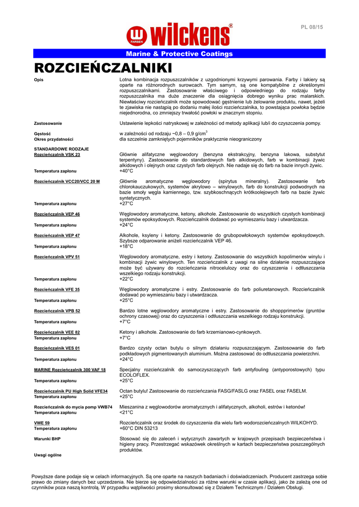 PL 08/15 Marine & Protective Coatings ROZCIEŃCZALNIKI Opis Lotna kombinacja rozpuszczalników z uzgodnionymi krzywymi parowania. Farby i lakiery są oparte na różnorodnych surowcach. Tym samym, są one kompatybilne z określonymi rozpuszczalnikami. Zastosowanie właściwego i odpowiedniego do rodzaju farby rozpuszczalnika ma duże znaczenie dla osiągnięcia dobrego wyniku prac malarskich. Niewłaściwy rozcieńczalnik może spowodować gęstnienie lub żelowanie produktu, nawet, jeżeli te zjawiska nie nastąpią po dodaniu małej ilości rozcieńczalnika, to powstająca powłoka będzie niejednorodna, co zmniejszy trwałość powłoki w znacznym stopniu. Zastosowanie Ustawienie lepkości natryskowej w zależności od metody aplikacji lub/i do czyszczenia pompy. Gęstość Okres przydatności w zależności od rodzaju ~0,8 – 0,9 g/cm3 dla szczelnie zamkniętych pojemników praktycznie nieograniczony STANDARDOWE RODZAJE Rozcieńczalnik VSK 23 Temperatura zapłonu Rozcieńczalnik VCC20/VCC 20 M Temperatura zapłonu Rozcieńczalnik VEP 46 Temperatura zapłonu Rozcieńczalnik VEP 47 Temperatura zapłonu Rozcieńczalnik VPV 51 Temperatura zapłonu Rozcieńczalnik VFE 35 Temperatura zapłonu Głównie alifatyczne węglowodory (benzyna ekstrakcyjny, benzyna lakowa, substytut terpentyny). Zastosowanie do standardowych farb alkidowych, farb w kombinacji żywic alkidowych i olejnych oraz czystych farb olejnych. Nie nadaje się do farb na bazie innych żywic. +40°C Głównie aromatyczne węglowodory (spirytus mineralny). Zastosowanie farb chlorokauczukowych, systemów akrylowo – winylowych, farb do konstrukcji podwodnych na bazie smoły węgla kamiennego, tzw. szybkoschnących krótkoolejowych farb na bazie żywic syntetycznych. +27°C Węglowodory aromatyczne, ketony, alkohole. Zastosowanie do wszystkich czystych kombinacji systemów epoksydowych. Rozcieńczalnik dodawać po wymieszaniu bazy i utwardzacza. +24°C Alkohole, ksyleny i ketony. Zastosowanie do grubopowłokowych systemów epoksydowych. Szybsze odparowanie aniżeli rozcieńczalnik VEP 46. +18°C Węglowodory aromatyczne, estry i ketony. Zastosowanie do wszystkich kopolimerów winylu i kombinacji żywic winylowych. Ten rozcieńczalnik z uwagi na silne działanie rozpuszczające może być używany do rozcieńczania nitrocelulozy oraz do czyszczenia i odtłuszczania wszelkiego rodzaju konstrukcji. +22°C Węglowodory aromatyczne i estry. Zastosowanie do farb poliuretanowych. Rozcieńczalnik dodawać po wymieszaniu bazy i utwardzacza. +25°C Temperatura zapłonu Bardzo lotne węglowodory aromatyczne i estry. Zastosowanie do shoppprimerów (gruntów ochrony czasowej) oraz do czyszczenia i odtłuszczania wszelkiego rodzaju konstrukcji. +7°C Rozcieńczalnik VEE 82 Temperatura zapłonu Ketony i alkohole. Zastosowanie do farb krzemianowo-cynkowych. +7°C Rozcieńczalnik VES 01 Bardzo czysty octan butylu o silnym działaniu rozpuszczającym. Zastosowanie do farb podkładowych pigmentowanych aluminium. Można zastosować do odtłuszczania powierzchni. +24°C Rozcieńczalnik VPB 52 Temperatura zapłonu Temperatura zapłonu Specjalny rozcieńczalnik do samoczyszczących farb antyfouling (antyporostowych) typu ECOLOFLEX. +25°C Rozcieńczalnik PU High Solid VFE34 Temperatura zapłonu Octan butylu! Zastosowanie do rozcieńczania FASG/FASLG oraz FASEL oraz FASELM. +25°C Rozcieńczalnik do mycia pomp VWB74 Temperatura zapłonu Mieszanina z węglowodorów aromatycznych i alifatycznych, alkoholi, estrów i ketonów! <21°C VWE 59 Temperatura zapłonu Rozcieńczalnik oraz środek do czyszczenia dla wielu farb wodorozcieńczalnych WILKOHYD. +60°C DIN 53213 Warunki BHP Stosować się do zaleceń i wytycznych zawartych w krajowych przepisach bezpieczeństwa i higieny pracy. Przestrzegać wskazówek określnych w kartach bezpieczeństwa poszczególnych produktów. MARINE Rozcieńczalnik 300 VAF 18 Uwagi ogólne Powyższe dane podaje się w celach informacyjnych. Są one oparte na naszych badaniach i doświadczeniach. Producent zastrzega sobie prawo do zmiany danych bez uprzedzenia. Nie bierze się odpowiedzialności za różne warunki w czasie aplikacji, jako że zależą one od czynników poza naszą kontrolą. W przypadku wątpliwości prosimy skonsultować się z Działem Technicznym / Działem Obsługi.