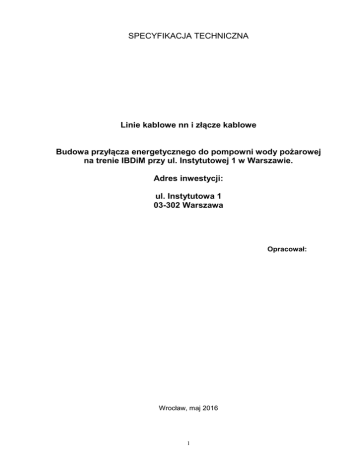 SPECYFIKACJA TECHNICZNA Linie kablowe nn i złącze kablowe Budowa przyłącza energetycznego do pompowni wody pożarowej na trenie IBDiM przy ul. Instytutowej 1 w Warszawie. Adres inwestycji: ul. Instytutowa 1 03-302 Warszawa Opracował: Wrocław, maj 2016 1 Szczegółowa Specyfikacja Techniczna 1. WSTĘP 1.1. Przedmiot SST Przedmiotem niniejszej Specyfikacji Technicznej Wykonania i Odbioru Robót (STWiORB) są wymagania dotyczące wykonania i odbioru robót kablowych linii energetycznych nn 0,4 kV ze złączem kablowym ZK-3a na terenie IBDiM przy ul. Instytutowej 1 w Warszawie. 1.2. Zakres robót objętych Ustalenia zawarte w niniejszej specyfikacji mają zastosowanie do budowy linii kablowych nn. 1.3. Określenia podstawowe Linia kablowa - kabel wielożyłowy lub wiązka kabli jednożyłowych w układzie wielofazowym albo kilka kabli jedno- lub wielożyłowych połączonych równolegle, łącznie z osprzętem, ułożone na wspólnej trasie i łączące zaciski tych samych dwóch urządzeń elektrycznych jedno- lub wielofazowych. Trasa kablowa - pas terenu, w którym ułożone są jedna lub więcej linii kablowych. Napięcie znamionowe linii - napięcie międzyprzewodowe, na które linia kablowa została zbudowana. Osprzęt linii kablowej - zbiór elementów przeznaczonych do łączenia, rozgałęziania lub zakończenia kabli. Osłona kabla - konstrukcja przeznaczona do ochrony kabla przed uszkodzeniami mechanicznymi, chemicznymi i działaniem łuku elektrycznego. Przykrycie - słoma ułożona nad kablem w celu ochrony przed mechanicznym uszkodzeniem od góry. Przegroda - osłona ułożona wzdłuż kabla w celu oddzielenia go od sąsiedniego kabla lub od innych urządzeń. Skrzyżowanie - takie miejsce na trasie linii kablowej, w którym jakakolwiek część rzutu poziomego linii kablowej przecina lub pokrywa jakąkolwiek część rzutu poziomego innej linii kablowej lub innego urządzenia podziemnego. Zbliżenie - takie miejsce na trasie linii kablowej, w którym odległość między linią kablową, urządzeniem podziemnym lub drogą komunikacyjną itp. jest mniejsza niż odległość dopuszczalna dla danych warunków układania bez stosowania przegród lub osłon zabezpieczających i w których nie występuje skrzyżowanie. Przepust kablowy - konstrukcja o przekroju okrągłym przeznaczona do ochrony kabla przed uszkodzeniami mechanicznymi, chemicznymi i działaniem łuku elektrycznego. Dodatkowa ochrona przeciwporażeniowa - ochrona części przewodzących, dostępnych w wypadku pojawienia się na nich napięcia w warunkach zakłóceniowych. Elektroenergetyczna linia napowietrzna - urządzenie napowietrzne przeznaczone do przesyłania energii elektrycznej, składające się z przewodów, izolatorów, konstrukcji wsporczych i osprzętu. Napięcie znamionowe linii U - napięcie międzyprzewodowe, na które linia jest zbudowana. Odległość pionowa - odległość między rzutami pionowymi przedmiotów. Odległość pozioma - odległość między rzutami poziomymi przedmiotów. Przęsło - część linii napowietrznej, zawarta między sąsiednimi konstrukcjami wsporczymi. Zwis f - odległość pionowa między przewodem a prostą łączącą punkty zawieszenia przewodu w środku rozpiętości przęsła. Słup - konstrukcja wsporcza linii osadzona w gruncie bezpośrednio lub za pomocą fundamentu. Obostrzenie linii - szereg dodatkowych wymagań dotyczących linii elektroenergetycznej na odcinku wymagającym zwiększonego bezpieczeństwa (wg warunków podanych w p. 5.8). Bezpieczne zawieszenie przewodu na izolatorach liniowych stojących - zawieszenie przy użyciu dodatkowego przewodu zabezpieczającego, zapobiegające opadnięciu przewodu roboczego w 2 przypadku zerwania go w pobliżu izolatora. Rozróżnia się bezpieczne zawieszenie przewodu: przelotowe i odciągowe. Przewód zabezpieczający - przewód dodatkowy wykonany z tego samego materiału i o tym samym przekroju co przewód zabezpieczany, przymocowany do przewodu zabezpieczanego przy pomocy złączek. Bezpieczne zawieszenie przewodu na łańcuchu izolatorów wiszących - zawieszenie zapobiegające opadnięciu przewodu w przypadku, gdy zerwie się jeden rząd łańcucha. Rozróżnia się bezpieczne zawieszenie przewodu: przelotowe, odciągowe i przelotowo-odciągowe. Łańcuch izolatorowy - jeden lub więcej izolatorów wiszących, połączonych szeregowo wraz z osprzętem umożliwiającym przegubowe połączenie izolatorów między sobą, konstrukcją zawieszeniową, z uchwytem przewodu, a w razie potrzeby wyposażony również w osprzęt do ochrony łańcucha przed skutkami łuku elektrycznego. Stacja transformatorowa - jest to zespół urządzeń, których głównym zadaniem jest przetwarzanie lub rozdział albo przetwarzanie i rozdział energii elektrycznej. Słupowa stacja transformatorowa - jest to stacja, której urządzenia umieszczone są na słupach. Miejska stacja transformatorowa - jest to stacja, której urządzenia znajdują się wewnątrz pomieszczenia, przy czym dostęp do tych urządzeń jest możliwy tylko z tego pomieszczenia. 1.4. Ogólne wymagania dotyczące robót Wykonawca przed przystąpieniem do wykonywania robót, powinien przedstawić do aprobaty Inżyniera program zapewnienia jakości (PZJ). 2. MATERIAŁY 2.1. Ogólne wymagania Wszystkie zakupione przez Wykonawcę materiały, dla których normy PN i BN przewidują posiadanie zaświadczenia o jakości lub atestu, powinny być zaopatrzone przez producenta w taki dokument. Inne materiały powinny być wyposażone w takie dokumenty na życzenie Inżyniera. 2.1.1.Materiałami stosowanymi do budowy linii kablowej i napowietrznej są: - kabel elektroenergetyczny YAKXS 4x120 mm 2 i YAKXS 4x35 mm2; - rury polietylenowe SRS – 110; - złącze kablowe nn ZK-3a; -Szafka sterownia SSO 2.2. Kable Przy budowie linii energetycznych należy stosować kable uzgodnione z zakładem eksploatującym sieci oraz zgodne z dokumentacją projektową. Przekrój żył kabli pow