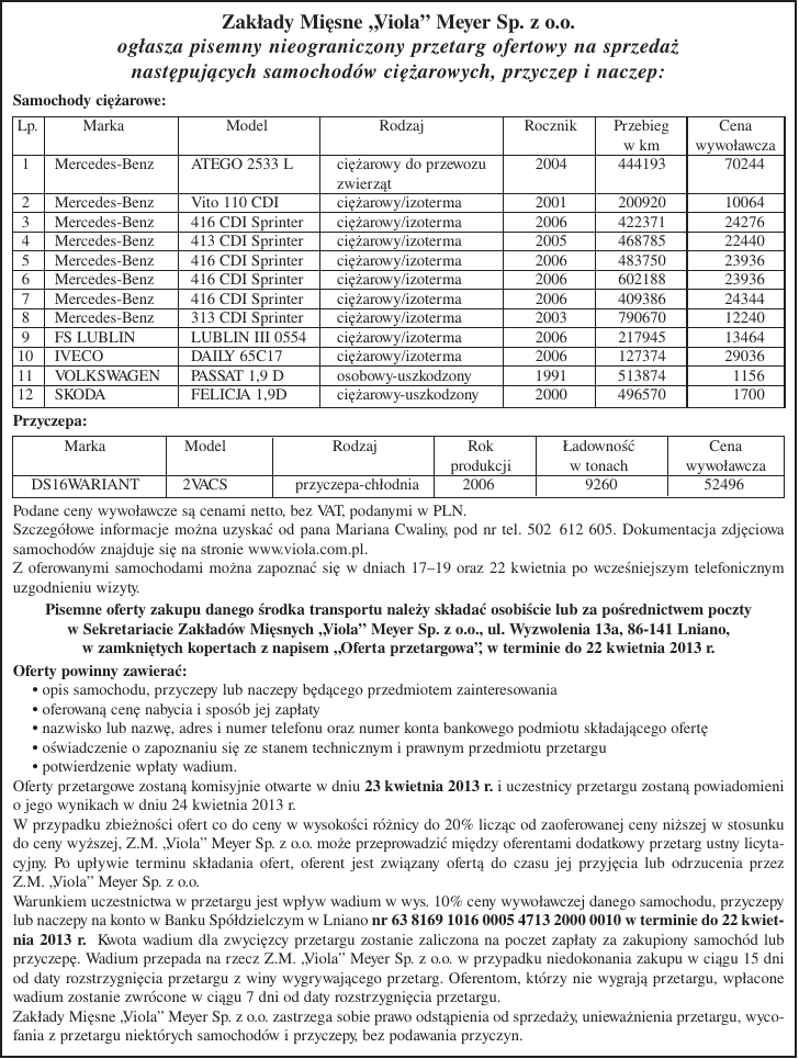 Zakłady Mięsne „Viola” Meyer Sp. z o.o. ogłasza pisemny nieograniczony przetarg ofertowy na sprzedaż następujących samochodów ciężarowych, przyczep i naczep: Samochody ciężarowe: Lp. Marka Model Rodzaj 1 Mercedes-Benz ATEGO 2533 L 2 3 4 5 6 7 8 9 10 11 12 Mercedes-Benz Mercedes-Benz Mercedes-Benz Mercedes-Benz Mercedes-Benz Mercedes-Benz Mercedes-Benz FS LUBLIN IVECO VOLKSWAGEN SKODA Vito 110 CDI 416 CDI Sprinter 413 CDI Sprinter 416 CDI Sprinter 416 CDI Sprinter 416 CDI Sprinter 313 CDI Sprinter LUBLIN III 0554 DAILY 65C17 PASSAT 1,9 D FELICJA 1,9D Rocznik ciężarowy do przewozu zwierząt ciężarowy/izoterma ciężarowy/izoterma ciężarowy/izoterma ciężarowy/izoterma ciężarowy/izoterma ciężarowy/izoterma ciężarowy/izoterma ciężarowy/izoterma ciężarowy/izoterma osobowy-uszkodzony ciężarowy-uszkodzony 2004 Przebieg w km 444193 2001 2006 2005 2006 2006 2006 2003 2006 2006 1991 2000 200920 422371 468785 483750 602188 409386 790670 217945 127374 513874 496570 Cena wywoławcza 70244 10064 24276 22440 23936 23936 24344 12240 13464 29036 1156 1700 Przyczepa: Marka Model Rodzaj DS16WARIANT 2VACS przyczepa-chłodnia Rok produkcji 2006 Ładowność w tonach 9260 Cena wywoławcza 52496 Podane ceny wywoławcze są cenami netto, bez VAT, podanymi w PLN. Szczegółowe informacje można uzyskać od pana Mariana Cwaliny, pod nr tel. 502 612 605. Dokumentacja zdjęciowa samochodów znajduje się na stronie www.viola.com.pl. Z oferowanymi samochodami można zapoznać się w dniach 17–19 oraz 22 kwietnia po wcześniejszym telefonicznym uzgodnieniu wizyty. Pisemne oferty zakupu danego środka transportu należy składać osobiście lub za pośrednictwem poczty w Sekretariacie Zakładów Mięsnych „Viola” Meyer Sp. z o.o., ul. Wyzwolenia 13a, 86-141 Lniano, w zamkniętych kopertach z napisem „Oferta przetargowa”, w terminie do 22 kwietnia 2013 r. Oferty powinny zawierać: • opis samochodu, przyczepy lub naczepy będącego przedmiotem zainteresowania • oferowaną cenę nabycia i sposób jej zapłaty • nazwisko lub nazwę, adres i numer telefonu oraz numer konta bankowego podmiotu składającego ofertę • oświadczenie o zapoznaniu się ze stanem technicznym i prawnym przedmiotu przetargu • potwierdzenie wpłaty wadium. Oferty przetargowe zostaną komisyjnie otwarte w dniu 23 kwietnia 2013 r. i uczestnicy przetargu zostaną powiadomieni o jego wynikach w dniu 24 kwietnia 2013 r. W przypadku zbieżności ofert co do ceny w wysokości różnicy do 20% licząc od zaoferowanej ceny niższej w stosunku do ceny wyższej, Z.M. „Viola” Meyer Sp. z o.o. może przeprowadzić między oferentami dodatkowy przetarg ustny licytacyjny. Po upływie terminu składania ofert, oferent jest związany ofertą do czasu jej przyjęcia lub odrzucenia przez Z.M. „Viola” Meyer Sp. z o.o. Warunkiem uczestnictwa w przetargu jest wpływ wadium w wys. 10% ceny wywoławczej danego samochodu, przyczepy lub naczepy na konto w Banku Spółdzielczym w Lniano nr 63 8169 1016 0005 4713 2000 0010 w terminie do 22 kwietnia 2013 r. Kwota wadium dla zwycięzcy przetargu zostanie zaliczona na poczet zapłaty za zakupiony samochód lub przyczepę. Wadium przepada na rzecz Z.M. „Viola” Meyer Sp. z o.o. w przypadku niedokonania zakupu w ciągu 15 dni od daty rozstrzygnięcia przetargu z winy wygrywającego przetarg. Oferentom, którzy nie wygrają przetargu, wpłacone wadium zostanie zwrócone w ciągu 7 dni od daty rozstrzygnięcia przetargu. Zakłady Mięsne „Viola” Meyer Sp. z o.o. zastrzega sobie prawo odstąpienia od sprzedaży, unieważnienia przetargu, wycofania z przetargu niektórych samochodów i przyczepy, bez podawania przyczyn.
