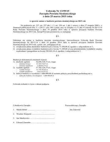 Uchwała Nr 13/59/15 Zarządu Powiatu Siemiatyckiego z dnia 25 marca 2015 roku w sprawie zmian w budżecie powiatu siemiatyckiego na 2015 rok Na podstawie art. 237, art. 257 pkt 1 i 3, art. 258 ust. 1 pkt 1 ustawy z dnia 27 sierpnia 2009 r. o finansach publicznych (Dz. U. z 2013 r. poz. 885 z późn. zm.) w związku z § 11 pkt 4 Uchwały Nr III/12/14 Rady Powiatu Siemiatyckiego z dnia 19 grudnia 2014 roku w sprawie przyjęcia budżetu Powiatu Siemiatyckiego na 2015 rok, Zarząd Powiatu postanawia, co następuje: § 1. Dokonuje się zmian w budżecie powiatu siemiatyckiego, zatwierdzonym Uchwałą Rady Powiatu Siemiatyckiego Nr III/12/14 z dnia 19 grudnia 2014 roku w sprawie przyjęcia budżetu Powiatu Siemiatyckiego na 2015 rok, z późn. zm., polegających na: 1) zwiększeniu planu dochodów budżetowych o kwotę 71.389,00 zł, zgodnie z załącznikiem nr 1, 2) zwiększeniu planu wydatków budżetowych o kwotę 71.389,00 zł oraz przeniesieniu wydatków między rozdziałami i paragrafami na kwotę 290.845,34 zł, zgodnie z załącznikiem nr 2. § 2. Budżet po dokonanych zmianach wynosi: 1) dochody ogółem 56.696.328,75 zł, z tego: dochody bieżące dochody majątkowe 2) wydatki ogółem wydatki bieżące wydatki majątkowe 53.148.274,97 zł, 3.548.053,78 zł, 57.702.328,75 zł, z tego: 51.778.792,82 zł, 5.923.535,93 zł, 3) deficyt budżetu w wysokości 1.006.000,00 zł zostanie pokryty przychodami pochodzącymi z: nadwyżki budżetu z lat ubiegłych – 1.006.000,00 zł. § 3. Uchwała wchodzi w życie z dniem podjęcia. Członkowie Zarządu: 1. Marek Bobel ...................................................... 2. Wiesław Klepacki ............................................. 3. Jan Markiewicz ………..................................... 4. Edward Zaremba ……………………….…….. Przewodniczący Zarządu: Jan Zalewski Objaśnienie wprowadzonych zmian - załącznik nr 1: Zwiększa się plan dochodów budżetu powiatu o kwotę 71.389,00 zł, z tego: dz. 600, rozdz. 60014 – zwiększenie o kwotę 35.000,00 zł dotacji celowej z tytułu pomocy finansowej udzielonej przez Gminę Siemiatycze na wykonanie Remontu nawierzchni gruntowej na odcinku drogi powiatowej nr 1718B Tołwin – Romanówka poprzez dożwirowanie warstwą kruszywa naturalnego, dz. 852, rozdz.. 85201 – zwiększenie o kwotę 27.082,00 zł dotacji celowej z budżetu państwa (rezerwa celowa cz. 83, poz. 53) na zadania z zakresu administracji rządowej oraz inne zadania zlecone ustawami realizowane przez powiat w 2015 roku, z przeznaczeniem na finansowanie pobytu dzieci cudzoziemców w placówkach opiekuńczo-wychowawczych, zgodnie z art. 181 pkt 2 ustawy o wspieraniu rodziny i systemie pieczy zastępczej, zgodnie z pismem PUW w Białymstoku z dnia 17.03.2015 r. znak FBII.3111.77.2015.MA, dz. 853, rozdz. 85334 – zwiększenie o kwotę 9.307,00 zł dotacji celowej z budżetu państwa (rezerwa celowa cz. 83, poz. 13) na zadania z zakresu administracji rządowej oraz inne zadania zlecone ustawami realizowane przez powiat w 2015 roku, tj. na realizację pomocy dla repatriantów i ich rodzin udzielanej przez powiat w zakresie określonym w art. 17 i 23 ustawy z dnia 9 listopada 2000 r. o repatriacji (Dz. U. z 2014 r., poz. 1392), zgodnie z pismem PUW w Białymstoku z dnia 26.02.2015 r. znak FBII.3111.6.2015.BB. Objaśnienie wprowadzonych zmian – załącznik nr 2: 1. Dokonuje się przeniesień w planie wydatków Starostwa Powiatowego w Siemiatyczach na kwotę 14.576,82 zł, z tego: dz. 630, rozdz. 63095 – przeniesienia na kwotę 8,01 zł, w planie projektu „Podlasie Nadbużańskie w Twoich rękach” realizowanego w ramach PROW 2007-2013, dz. 710, rozdz. 71095 – przeniesienia na kwotę 1.500,00 zł, dz. 750, rozdz. 75019 – przeniesienia na kwotę 500,00 zł, dz. 750, rozdz. 75045 – przeniesienia na kwotę 1.201,91 zł, dz. 750, rozdz. 75075 – przeniesienia na kwotę 4.000,00 zł, dz. 750, rozdz. 75095 – przeniesienia na kwotę 566,90 zł, w planie projektu „Rozszerzenie oferty Centrum Wsparcia Organizacji Pozarządowych” realizowanego w ramach PROW 2007-2013, dz. 754, rozdz. 75495 – przeniesienia na kwotę 1.600,00 zł, dz. 801, rozdz. 80195 – przeniesienia na kwotę 2.200,00 zł, dz. 921, rozdz. 92195 – przeniesienia na kwotę 2.500,00 zł, dz. 926, rozdz. 92605 – przeniesienia na kwotę 500,00 zł. 2. Dokonuje się przeniesień w planie wydatków Powiatowego Zarządu Dróg w Siemiatyczach w dz. 600Transport i łączność, rozdz. 60014 na kwotę 214.000,00 zł, zgodnie z wnioskiem znak PZD.2.302.2.2015 z dnia 10.03.2015 r., oraz zwiększa się wydatki o kwotę 35.000,00 zł z przeznaczeniem na wykonanie Remontu nawierzchni gruntowej na odcinku drogi powiatowej nr 1718B Tołwin – Romanówka poprzez dożwirowanie warstwą kruszywa naturalnego. 3. Dokonuje się przeniesień w planie wydatków Powiatowego Inspektoratu Nadzoru Budowlanego w Siemiatyczach w dz. 710-Działalność usługowa, rozdz. 71015 na kwotę 389,86 zł, zgodnie z wnioskiem znak FK.3012.2.2015 z dnia 12.03.2014 r. 4. Dokonuje się przeniesień w planie wydatków Komendy Powiatowej PSP w Siemiatyczach w dz. 754 – Bezpieczeństwo publiczne i ochrona przeciwpożarowa, rozdz. 75411 na kwotę 545,83 zł, zgodnie z wnioskiem znak PF.0332.2.2-2.2015.AŻ z dnia 11.03.2015 r. 5. Dokonuje się przeniesień w planie wydatków Zespołu Szkół Rolniczych w Czartajewie na kwotę 31.556,74 zł, na podstawie wniosków: znak ZSz.311.2.2015 z dnia 19.03.2015 r. oraz znak ZSz.311.3.2015 z dnia 23.03.2015 r., z tego: dz. 801, rozdz. 80130 – przeniesienia na kwotę 8.035,62 zł i zwiększenie wydatków o 8.239,70 zł, dz. 801, rozdz. 80148 – zmniejszenie wydatków o kwotę 2.068,19 zł, dz. 801, rozdz. 80195 – przeniesienia na kwotę 15.000,00 zł i zmniejszenie wydatków o kwotę 6.171,51 zł, dz. 854, rozdz. 85410 – przeniesienia na kwotę 281,42 zł. 6. Dokonuje się przeniesień w planie wydatków Zespołu Szkół Rolni