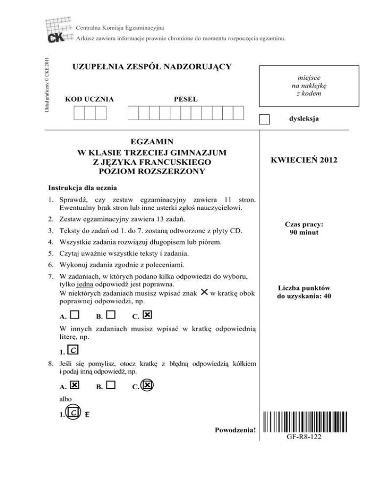 Centralna Komisja Egzaminacyjna Układ graficzny © CKE 2011 Arkusz zawiera informacje prawnie chronione do momentu rozpoczęcia egzaminu. UZUPEŁNIA ZESPÓŁ NADZORUJĄCY KOD UCZNIA miejsce na naklejkę z kodem PESEL dysleksja EGZAMIN W KLASIE TRZECIEJ GIMNAZJUM Z JĘZYKA FRANCUSKIEGO POZIOM ROZSZERZONY KWIECIEŃ 2012 Instrukcja dla ucznia 1. Sprawdź, czy zestaw egzaminacyjny zawiera 11 stron. Ewentualny brak stron lub inne usterki zgłoś nauczycielowi. 2. Zestaw egzaminacyjny zawiera 13 zadań. 3. Teksty do zadań od 1. do 7. zostaną odtworzone z płyty CD. Czas pracy: 90 minut 4. Wszystkie zadania rozwiązuj długopisem lub piórem. 5. Czytaj uważnie wszystkie teksty i zadania. 6. Wykonuj zadania zgodnie z poleceniami. 7. W zadaniach, w których podano kilka odpowiedzi do wyboru, tylko jedna odpowiedź jest poprawna. W niektórych zadaniach musisz wpisać znak w kratkę obok poprawnej odpowiedzi, np. A. B. C. Liczba punktów do uzyskania: 40 W innych zadaniach musisz wpisać w kratkę odpowiednią literę, np. 1. C 8. Jeśli się pomylisz, otocz kratkę z błędną odpowiedzią kółkiem i podaj inną odpowiedź, np. A. B. C. albo 1. C E Powodzenia! GF-R8-122 Zadanie 1. (0–4) Usłyszysz dwukrotnie wypowiedzi czterech osób na temat ich ulubionych sposobów spędzania wakacji. Do każdej wypowiedzi dopasuj zajęcie (A–E), które dana osoba najbardziej lubi. Jedno zajęcie nie pasuje do żadnej osoby. Wpisz odpowiednią literę w każdą kratkę (1.–4.). A. B. C. D. E. 1. 2. 3. 4. Zadanie 2. (0–1) Usłyszysz dwukrotnie wypowiedź Julie. O czym mówi? Wpisz znak X w kratkę obok odpowiedzi A, B albo C. Julie parle A. de la visite de son cousin. B. des monuments de Strasbourg. C. de son passe-temps préféré. Strona 2 z 11 Zadanie 3. (0–1) Usłyszysz dwukrotnie wypowiedź Marka. O czym mówi? Wpisz znak X w kratkę obok odpowiedzi A, B albo C. Marc parle A. de son école. B. de la voiture de papa. C. de sa façon de se détendre. Zadanie 4. (0–1) Usłyszysz dwukrotnie wypowiedź Jacques. Dlaczego Jacques dzwoni do Monique? Wpisz znak X w kratkę obok odpowiedzi A, B albo C. Jacques appelle Monique pour A. l’inviter à un spectacle. B. s’excuser de son absence. C. l’informer d’un concours théâtral. Zadanie 5. (0–1) Usłyszysz dwukrotnie rozmowę dwóch osób. Gdzie się znajdują? Wpisz znak X w kratkę obok odpowiedzi A, B albo C. Les personnes qui parlent sont A. à la maison. B. au restaurant. C. dans un magasin. Strona 3 z 11 Zadanie 6. (0–1) Usłyszysz dwukrotnie rozmowę. Co André proponuje Marie ? Wpisz znak X w kratkę obok odpowiedzi A, B albo C. André propose à Marie d’aller A. chez Jean. B. au café. C. au cinéma. Zadanie 7. (0–1) Usłyszysz dwukrotnie rozmowę. Dokąd idzie dziewczyna ? Wpisz znak X w kratkę obok odpowiedzi A, B albo C. La fille veut aller A. à la poste. B. à l’école. C. au parc. Zadanie 8. (0–3) Przeczytaj teksty. Odpowiedz na pytania. Wpisz znak X w kratkę A albo B. 1. Qui demande de faire les courses ? A. B. André, passe à la boulangerie pour acheter une baguette et un pain complet pour le dîner. Margot Pierre, j’ai déjà fait des achats pour le dîner. Passe à l’école pour chercher Sophie. Claire Strona 4 z 11 2. Qui veut acheter un lecteur MP3 ? A. B. J’ai perdu mon nouveau lecteur Mp3 Récompense Appelez-moi au 01 32 43 65 12 Toute la journée Je cherche un lecteur MP3 Bon marché Appelez-moi au 01 28 35 34 18 Tlj, après 18h 3. Tu veux danser, où vas-tu ? A. B. Fête des fleurs de Tarbes ! PROGRAMME – animations de rue – 300 000 fleurs présentées – élection de la reine des fleurs 22h – grand bal avec orchestre et la chanteuse Samira Fête des plantes de Lancieux ! PROGRAMME 11h – conférence 14h – visite des jardins 16h – film documentaire sur les plantes de bord de mer Restauration sur place Strona 5 z 11 Zadanie 9. (0–4) Przeczytaj tekst. Dopasuj obrazek (A–E) do każdej części tekstu. Jeden obrazek nie pasuje do żadnej części tekstu. Wpisz odpowiednią literę w każdą kratkę (1.–4.). A. B. D. C. E. Strona 6 z 11 BIENVENUE À GRENOBLE ! Bientôt Grenoble n’aura plus de secrets pour vous. Vous serez surpris par la ville et ses contrastes. L’Office de Tourisme de Grenoble vous propose un large choix de visites : les ruelles médiévales de Grenoble, ses musées classiques et contemporains et, bien sûr, la montagne ! 1. En montant à la Bastille, une petite montagne fortifiée, vous ferez un voyage inoubliable en empruntant l’un des premiers téléfériques urbains au monde ! Là-haut,vous serez surpris par l’immensité du panorama de la ville. 2. Situé place Lavalette, le musée de Grenoble est considéré comme le plus ancien musée d’art contemporain en France. Les collections permanentes rassemblent 1500 œuvres dans 57 salles sur 14000 m2. 3. L’environnement exceptionnel dont bénéficie la ville vous permet d’organiser des excursions en famille ou des randonnées à pied au départ du centre-ville de Grenoble : toute la montagne est accessible à partir de Grenoble ! 4. Profitez de votre séjour pour avoir le plaisir de découvrir la cuisine grenobloise, de déguster quelques spécialités dauphinoises (gratin dauphinois, gâteau aux noix) ou de montagne (fromages). Strona 7 z 11 Zadanie 10. (0–3) Przeczytaj tekst. Uzupełnij go brakującymi fragmentami zdań (A–D). Jeden fragment zdania nie pasuje do tekstu. Wpisz odpowiednią literę w każdą kratkę (1.–3.). JEAN : Alors, tu habites à Argelès ? Argelès, c’est grand ? MARC : Non, c’est un petit village très joli, 1. JEAN : Et il y a beaucoup de touristes ? MARC : Oui, 2. JEAN: Tu habites dans un appartement ? MARC: Non, dans une maison moderne. De la terrasse, 3. , c’est un petit port. , surtout des Allemands, des Anglais. Il y a aussi un joli jardin autour de la maison. A. j’ai beaucoup d’amis B. j’ai une belle vue sur la mer C. il y a la mer D. il y en a beaucoup Str