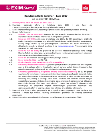 Regulamin Hello Summer – Lato 2017 na imprezy BP EXIM S.A. 1. Promocja trwa od 16.11.2016 r. do 09.01.2017 r. 2. Promocja obejmuje oferty z katalogu Lato 2017 i nie łączy się z innymi promocjami. Promocja nie dotyczy biletów lotniczych. 3. Każda impreza ma ograniczoną ilość miejsc przeznaczoną do sprzedaży w czasie promocji. 4. Zasady Hello Summer: 4.1. Zaliczka 10% od rezerwacji. Dopłata do 20% wartości imprezy do dnia 31.01.2017, dopłata do 100% wartości imprezy do 21 dni przed wylotem. 4.2. Rabat do 600 PLN na imprezy z katalogu Lato 2017, do 30% dodatkowej zniżki dla osoby dorosłej na dostawce oraz aż do 80% dodatkowej zniżki dla dzieci na dostawce. Rabaty mogą różnić się dla poszczególnych kierunków lub hoteli. Informacja o aktualnych cenach w biurach podróży i na www.eximtours.pl. Prezentowane ceny zawierają już naliczony rabat. 4.3. Rabat 40 PLN od osoby dla grup od 8 do 15 osób. Rabat nie łączy się z kartą stałego klienta. Rabat nie obowiązuje w przypadku imprez realizowanych przelotem rejsowym (nie czarterowym) oraz biletów lotniczych. 4.4. Rabat 2% dla klientów posiadających Kartę Stałego Klienta. 4.5. Super cena dla dzieci – od 49 PLN. 4.6. Gratis ubezpieczenie następstw chorób przewlekłych. 4.7. Gwarancja Niezmienności Ceny – gwarantujemy Państwu utrzymanie do dnia wyjazdu ceny z dnia zakupu oferty. Ewentualny wzrost kursów walut, kosztu transportu lub opłat lotniskowych, paliwowych itp. nie będzie miał wpływu na cenę. 4.8. Gwarancja jednorazowej, bezpłatnej zmiany składników rezerwacji do 30 dni przed wylotem . W tym okresie można zmienić termin wyjazdu, jego długość, kierunek, hotel, typ pokoju (bez zmiany liczby uczestników na mniejszą), a także lotnisko wylotowe na dowolną inną ofertę z katalogu Lato 2017. Możliwa jest również zmiana danych uczestników wyjazdu. Zmiany dokonywane są na warunkach cenowych wg. aktualnej oferty (nie dotyczy ofert typu „last minute” i „super last minute”). Gwarancja nie obowiązuje w przypadku imprez realizowanych przelotem rejsowym (nie czarterowym), ofert w oparciu o tanie linie lotnicze oraz biletów lotniczych. 5. Promocja nie dotyczy ofert grupowych. W przypadku ofert grupowych cena ustalana jest odrębnie i może być wyższa. Powyżej wymienione gwarancje nie dotyczą zamówień grupowych. 6. Integralną częścią warunków Hello Summer są ogólne warunki uczestnictwa OWU.