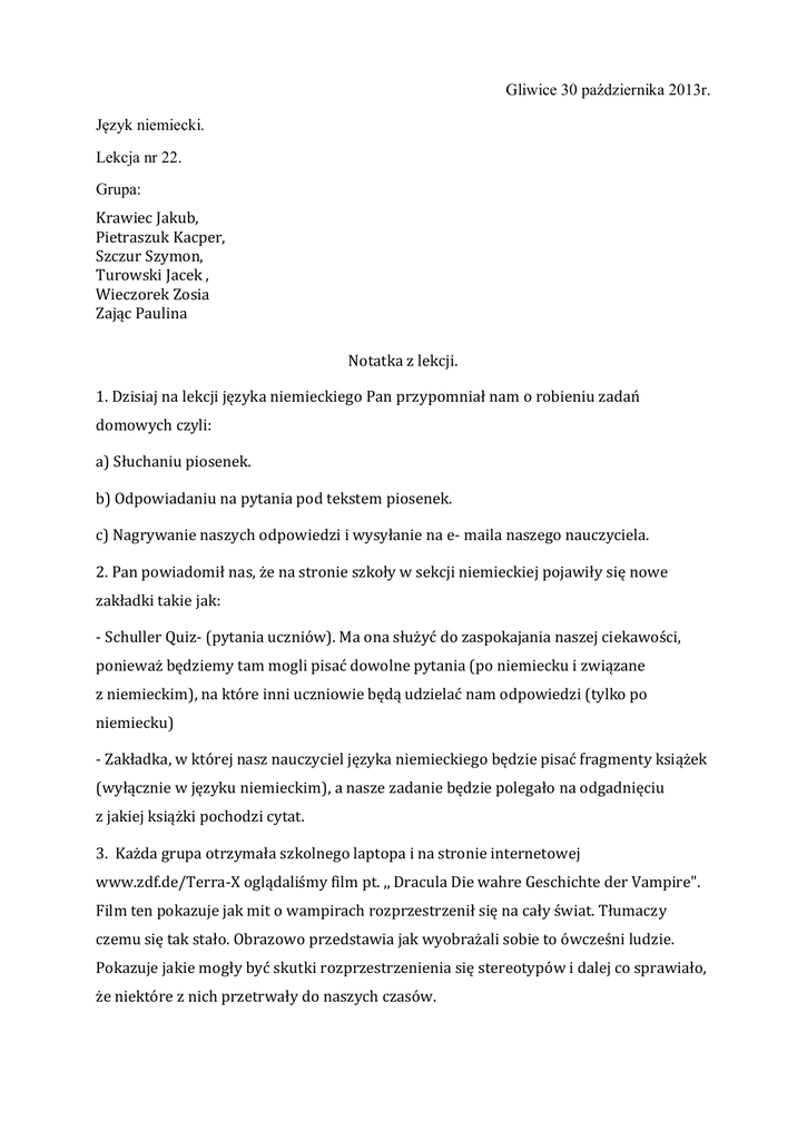Gliwice 30 października 2013r. Język niemiecki. Lekcja nr 22. Grupa: Krawiec Jakub, Pietraszuk Kacper, Szczur Szymon, Turowski Jacek , Wieczorek Zosia Zając Paulina Notatka z lekcji. 1. Dzisiaj na lekcji języka niemieckiego Pan przypomniał nam o robieniu zadań domowych czyli: a) Słuchaniu piosenek. b) Odpowiadaniu na pytania pod tekstem piosenek. c) Nagrywanie naszych odpowiedzi i wysyłanie na e- maila naszego nauczyciela. 2. Pan powiadomił nas, że na stronie szkoły w sekcji niemieckiej pojawiły się nowe zakładki takie jak: - Schuller Quiz- (pytania uczniów). Ma ona służyć do zaspokajania naszej ciekawości, ponieważ będziemy tam mogli pisać dowolne pytania (po niemiecku i związane z niemieckim), na które inni uczniowie będą udzielać nam odpowiedzi (tylko po niemiecku) - Zakładka, w której nasz nauczyciel języka niemieckiego będzie pisać fragmenty książek (wyłącznie w języku niemieckim), a nasze zadanie będzie polegało na odgadnięciu z jakiej książki pochodzi cytat. 3. Każda grupa otrzymała szkolnego laptopa i na stronie internetowej www.zdf.de/Terra-X oglądaliśmy film pt. ,, Dracula Die wahre Geschichte der Vampire". Film ten pokazuje jak mit o wampirach rozprzestrzenił się na cały świat. Tłumaczy czemu się tak stało. Obrazowo przedstawia jak wyobrażali sobie to ówcześni ludzie. Pokazuje jakie mogły być skutki rozprzestrzenienia się stereotypów i dalej co sprawiało, że niektóre z nich przetrwały do naszych czasów. Gliwice 31 października 2013r. Język niemiecki. Lekcja nr 23. Grupa: Krawiec Jakub, Pietraszuk Kacper, Szczur Szymon, Wieczorek Zosia Zając Paulina Notatka z lekcji. 1. Dzisiaj podczas zajęć z języka niemieckiego wszyscy uczniowie klasy I e wykonywali portrety znanych osób. Przełamywaliśmy rutynę zwykłych lekcji, nabieraliśmy rozmachu oraz śmiałości i co najważniejsze wyrażaliśmy siebie. Pan dał nam pełną dowolność w kreowaniu i odbieraniu namalowanych postaci. Każdy mógł interpretować obraz na swój sposób. Pan zasugerował, że mamy malować farbami na kartkach formatu A4 i większość osób dostosowała się do polecenia nauczyciela. Rezultaty naszych zmagań twórczych będzie można zobaczyć w szkole, ponieważ zostaną one powieszone w klasie numer 33 ( pracownia językowa- niemiecka). 2. Ponad to, na lekcji nasz nauczyciel porównywał nasz mózg do Jabba, któremu należy podawać mądre, rzeczowe, rozsądne informacje warte zapamiętania, ponieważ ów potwór wszystkie je chłonie i mają one duży wpływ na jego rozwój oraz charakter. Z tego powodu Pan zaproponował nam porcje znakomitej muzyki, która z pewnością nie zostanie wydalona. Miedzy innymi słuchaliśmy ponadczasowych utworów następujących wykonawców: Jim Morrison, Jimi Hendrix, Johnny Cash i Stanisław Soyka. 3. Na zakończenie nasz nauczyciel zapoznał nas z nowym zadaniem, którego podejmiemy się w dniu dzisiejszym, a ukończymy je w klasie trzeciej. Mianowicie mamy odszukać sławnych Gliwiczan, poczytać i dowiedzieć się różnych ciekawostek o nich samych, ich życiu i wpływie jaki wywarli na nasze miasto.