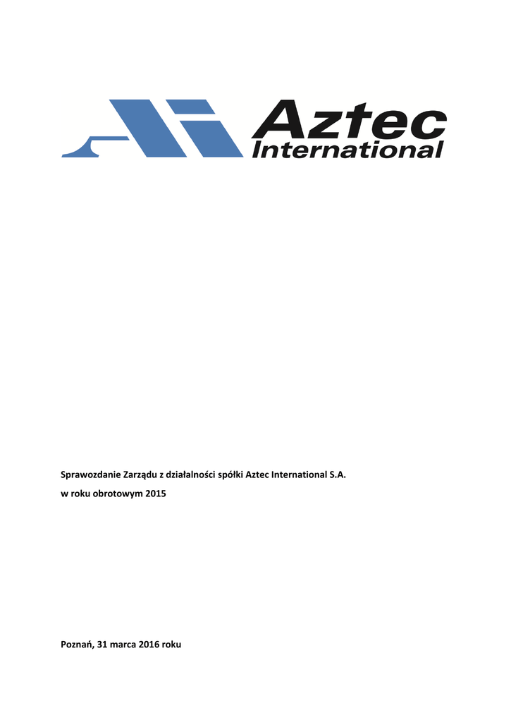 Sprawozdanie Zarządu z działalności spółki Aztec International S.A. w roku obrotowym 2015 Poznań, 31 marca 2016 roku Sprawozdanie Zarządu z działalności Aztec International S.A. w roku obrotowym 2015 Spis treści Wstęp ......................................................................................................................................... 3 1. Zdarzenia istotnie wpływające na działalność jednostki, jakie nastąpiły w roku obrotowym, a także po jego zakończeniu, do dnia zatwierdzenia sprawozdania finansowego ………………………………………………………………………………………………………………………………………………5 2. Przewidywany rozwój jednostki ......................................................................................... 8 I. Nowe produkty ................................................................................................................ 8 II. Inwestycje w infrastrukturę produkcyjną ....................................................................... 8 3. Ważniejsze osiągnięcia w dziedzinie badań i rozwoju ........................................................ 8 4. Aktualna i przewidywana sytuacja finansowa .................................................................... 8 I. Działalność operacyjna i finansowa ................................................................................ 8 II. Pozycje bilansowe ......................................................................................................... 11 III. Czynniki ryzyka i opis zagrożeń ..................................................................................... 14 IV. Sytuacja kadrowa .......................................................................................................... 15 V. Podsumowanie .............................................................................................................. 16 5. Akcje własne...................................................................................................................... 16 6. Posiadane przez jednostkę oddziały ................................................................................. 16 7. Instrumenty finansowe ..................................................................................................... 16 8. Stosowanie ładu korporacyjnego...................................................................................... 16 2 Sprawozdanie Zarządu z działalności Aztec International S.A. w roku obrotowym 2015 Wstęp Niniejsze Sprawozdanie sporządzono w dniu 31 marca 2016 roku celem przedstawienia akcjonariuszom Aztec International Spółka Akcyjna (dalej: Aztec, Spółka) działalności Spółki w roku obrotowym 2015, zgodnie z wymogiem określonym w art. 395 §2 ust. 1 Kodeksu spółek handlowych (Dz .U. 2000.94.1037). Sprawozdanie obejmuje zgodnie z art. 49 ustawy o rachunkowości z dnia 29 września 1994 roku (Dz. U. t.j. z 2013 r. poz. 330, 613.) istotne informacje o stanie majątkowym i sytuacji finansowej, w tym ocenę uzyskiwanych efektów oraz wskazanie czynników ryzyka i opis zagrożeń, a w szczególności następujące części: 1. Zdarzenia istotnie wpływające na działalność jednostki, jakie nastąpiły w roku obrotowym, a także po jego zakończeniu, do dnia zatwierdzenia sprawozdania finansowego. 2. Przewidywany rozwój jednostki. 3. Ważniejsze osiągnięcia w dziedzinie badań i rozwoju. 4. Aktualna i przewidywana sytuacja finansowa. 5. Nabycie akcji własnych. 6. Posiadane przez jednostkę oddziały. 7. Instrumenty finansowe. 8. Stosowanie zasad ładu korporacyjnego. Ogólna charakterystyka Spółki Spółka powstała w dniu 4 sierpnia 2008 roku w wyniku przekształcenia Aztec International Sp. z o. o. w spółkę akcyjną. Zgodnie ze Statutem Spółka została zawiązana na czas nieokreślony. Na dzień bilansowy (31.12.2015) kapitał podstawowy Spółki wynosił 3 414 667,00 zł i dzielił się na 3 414 667 akcji po 1 zł każda. 3 Sprawozdanie Zarządu z działalności Aztec International S.A. w roku obrotowym 2015 Skład osobowy Zarządu oraz Rady Nadzorczej Aztec International S.A. na dzień 31.12.2015r.: Zarząd: Rada Nadzorcza: 1. Marek Ciulis – Prezes Zarządu 1. Henry de Graan – Przewodniczący 2. Rafał Cędrowski – Wiceprezes Zarządu, 2. Aneta Grząbka – Sekretarz Dyrektor Finansowy 3. Matthew de Graan 4. Maciej Gramala 5. Tomasz Nieborak 6. David Welk 4 Sprawozdanie Zarządu z działalności Aztec International S.A. w roku obrotowym 2015 1. Zdarzenia istotnie wpływające na działalność jednostki, jakie nastąpiły w roku obrotowym, a także po jego zakończeniu, do dnia zatwierdzenia sprawozdania finansowego I kwartał 2015 roku a) II etap VIII edycji konkursu Złota Strona Emitenta Spółka Aztec International S.A. została zakwalifikowana do II etapu ósmej edycji konkursu na najlepszą stronę internetową spółki giełdowej – Złota Strona Emitenta VIII. Podczas I etapu oceniano strony internetowe spółek giełdowych zarówno z Polski jak i zagranicy, które pod koniec sierpnia 2014 roku notowane były na Giełdzie Papierów Wartościowych w Warszawie. Pod uwagę wzięto m.in. jakość komunikacji z inwestorem i zawartość treści oraz funkcjonalność serwisu. Do II etapu zakwalifikowano łącznie 53 spółki, które wykazały największy poziom zawartości merytorycznej. b) Podjęcie nowych inwestycji W I kwartale 2015 roku Spółka była nastawiona na inwestycje, do czego w dużej mierze przyczynił się wzrost sprzedaży kalot. W celu zwiększenia wydajności produkcji podejmowane były działania takie jak nabycie maszyny do malowania proszkowego podkładek siodłowych oraz udoskonalenie innowacyjnej technologii malowania proszkowego – Master Coat®. Przyczyniło się to do zmniejszenia kosztów planowania poszerzenia parku technologicznego, poprawy wydajności cyklu produkcyjnego oraz zwiększenia automat