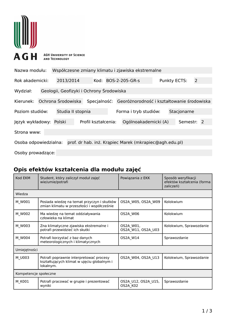 Nazwa modułu: Współczesne zmiany klimatu i zjawiska ekstremalne Rok akademicki: Wydział: Kierunek: 2013/2014 Kod: BOS-2-205-GR-s Punkty ECTS: 2 Geologii, Geofizyki i Ochrony Środowiska Ochrona Środowiska Poziom studiów: Specjalność: Studia II stopnia Język wykładowy: Polski Georóżnorodność i kształtowanie środowiska Forma i tryb studiów: Profil kształcenia: Stacjonarne Ogólnoakademicki (A) Semestr: 2 Strona www: Osoba odpowiedzialna: prof. dr hab. inż. Krąpiec Marek ([email protected]) Osoby prowadzące: Opis efektów kształcenia dla modułu zajęć Kod EKM Student, który zaliczył moduł zajęć wie/umie/potrafi Powiązania z EKK Sposób weryfikacji efektów kształcenia (forma zaliczeń) M_W001 Posiada wiedzę na temat przyczyn i skutków zmian klimatu w przeszłości i współcześnie OS2A_W05, OS2A_W09 Kolokwium M_W002 Ma wiedzę na temat oddziaływania człowieka na klimat OS2A_W06 Kolokwium M_W003 Zna klimatyczne zjawiska ekstremalne i potrafi przewidzieć ich skutki OS2A_W01, OS2A_W11, OS2A_U03 Kolokwium, Sprawozdanie M_W004 Potrafi korzystać z baz danych meteorologicznych i klimatycznych OS2A_W14 Sprawozdanie Potrafi poprawnie interpretować procesy kształtujących klimat w ujęciu globalnym i lokalnym. OS2A_W04, OS2A_U13 Kolokwium, Sprawozdanie OS2A_U12, OS2A_U15, OS2A_K02 Sprawozdanie Wiedza Umiejętności M_U003 Kompetencje społeczne M_K001 Potrafi pracować w grupie i prezentować wyniki 1/3 Karta modułu - Współczesne zmiany klimatu i zjawiska ekstremalne Matryca efektów kształcenia w odniesieniu do form zajęć Zajęcia seminaryjne Zajęcia praktyczne + - - - - - - - - - - M_W002 Ma wiedzę na temat oddziaływania człowieka na klimat + - - - - - - - - - - M_W003 Zna klimatyczne zjawiska ekstremalne i potrafi przewidzieć ich skutki - + - - - - - - - - - M_W004 Potrafi korzystać z baz danych meteorologicznych i klimatycznych + + - - - - - - - - - Potrafi poprawnie interpretować procesy kształtujących klimat w ujęciu globalnym i lokalnym. + + - - - - - - - - - - + - - - - - - - - - Zajęcia E-learning Konwersatori um Posiada wiedzę na temat przyczyn i skutków zmian klimatu w przeszłości i współcześnie Zajęcia terenowe Ćwiczenia projektowe M_W001 Inne Ćwiczenia laboratoryjne Forma zajęć Ćwiczenia audytoryjne Student, który zaliczył moduł zajęć wie/umie/potrafi Wykład Kod EKM Wiedza Umiejętności M_U003 Kompetencje społeczne M_K001 Potrafi pracować w grupie i prezentować wyniki Treść modułu zajęć (program wykładów i pozostałych zajęć) Wykład WYKŁAD System klimatyczny Ziemi. Zmiany klimat kuli ziemskiej w przeszłości geologicznej Historyczne i współczesne formy cyrkulacji atmosfery i wód oceanicznych Czynniki klimatotwórcze stabilizujące naturalną zmienność klimatu Naturalne przyczyny zmian klimatu Antropogeniczne przyczyny zmian klimatu Międzynarodowe, polityczne i gospodarcze aspekty zmian klimatu Scenariusze przewidywanych zmian klimatu w Europie i Polsce Ekstremalne zjawiska meteorologiczne i hydrologiczne (opady, huragany, śnieżyce, susze, pożary, powodzie, stepowienie, wzrost poziomu morza, zatapianie nisko położonych obszarów przybrzeżnych) Ćwiczenia audytoryjne ĆWICZENIA 2/3 Karta modułu - Współczesne zmiany klimatu i zjawiska ekstremalne Astronomiczne przyczyny zmian klimatu Ziemi Zmiany wybranych parametrów meteorologicznych na Ziemi w czasach historycznych Trendy czasowe temperatury i opadów w Europie Historyczne zmiany klimatu w Polsce Współczesne zjawiska wpływające na zmiany klimatu (NAO, ENSO) Przegląd zjawisk ekstremalnych Sposób obliczania oceny końcowej Ocena z kolokwium Wymagania wstępne i dodatkowe Podstawy meteorologii i klimatologii Zalecana literatura i pomoce naukowe Arche D., 2011: Globalne ocieplenie. Zrozumieć prognozę. PWN Warszawa Boryczka J.,1993: Naturalne i antropogeniczne zmiany klimatu Ziemi w XVII-XXI wieku. Wyd. UW, Warszawa Flannery T., 2007: Twórcy pogody, CKA, Gliwice Hoy D.V., Schatten K.H., 1997: The Role of the Sun in Climate Change, New York, Oxford, Oxford University Press Kożuchowski K., Przybylak R.,1995: Efekt cieplarniany. Wyd. „Wiedza Powszechna”, Warszawa Kożuchowski K. 2005: Meteorologia i klimatologia, PWN, Warszawa Kundzewicz Z.W., Kowalczyk P., 2008: Zmiany klimatu i ich skutki, Poznań, Kurpisz Lorenc H., 2004: Klimat – Wybrane zagadnienia, IMGW Warszawa Ruddiman W.F., 2001: Earth’s climate. University of Virginia, Lamont-Doherty Earth Observatory. New York Publikacje naukowe osób prowadzących zajęcia związane z tematyką modułu Nie podano dodatkowych publikacji Informacje dodatkowe Brak Nakład pracy studenta (bilans punktów ECTS) Forma aktywności studenta Obciążenie studenta Udział w wykładach 30 godz Udział w ćwiczeniach audytoryjnych 15 godz Samodzielne studiowanie tematyki zajęć 5 godz Przygotowanie do zajęć 10 godz Sumaryczne obciążenie pracą studenta 60 godz Punkty ECTS za moduł 2 ECTS 3/3