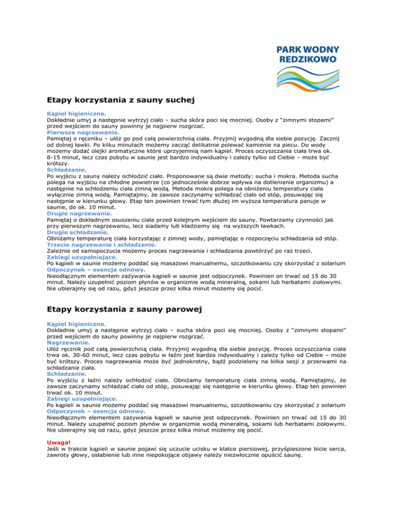 Etapy korzystania z sauny suchej Kąpiel higieniczna. Dokładnie umyj a następnie wytrzyj ciało – sucha skóra poci się mocniej. Osoby z “zimnymi stopami” przed wejściem do sauny powinny je najpierw rozgrzać. Pierwsze nagrzewanie. Pamiętaj o ręczniku – ułóż go pod całą powierzchnią ciała. Przyjmij wygodną dla siebie pozycję. Zacznij od dolnej ławki. Po kilku minutach możemy zacząć delikatnie polewać kamienie na piecu. Do wody możemy dodać olejki aromatyczne które uprzyjemnią nam kąpiel. Proces oczyszczania ciała trwa ok. 8-15 minut, lecz czas pobytu w saunie jest bardzo indywidualny i zależy tylko od Ciebie – może być krótszy. Schładzanie. Po wyjściu z sauny należy ochłodzić ciało. Proponowane są dwie metody: sucha i mokra. Metoda sucha polega na wyjściu na chłodne powietrze (co jednocześnie dobrze wpływa na dotlenienie organizmu) a następnie na schłodzeniu ciała zimną wodą. Metoda mokra polega na obniżeniu temperatury ciała wyłącznie zimną wodą. Pamiętajmy, że zawsze zaczynamy schładzać ciało od stóp, posuwając się następnie w kierunku głowy. Etap ten powinien trwać tym dłużej im wyższa temperatura panuje w saunie, do ok. 10 minut. Drugie nagrzewanie. Pamiętaj o dokładnym osuszeniu ciała przed kolejnym wejściem do sauny. Powtarzamy czynności jak przy pierwszym nagrzewaniu, lecz siadamy lub kładziemy się na wyższych ławkach. Drugie schładzanie. Obniżamy temperaturę ciała korzystając z zimnej wody, pamiętając o rozpoczęciu schładzania od stóp. Trzecie nagrzewanie i schładzanie. Zależnie od samopoczucia możemy proces nagrzewania i schładzania powtórzyć po raz trzeci. Zabiegi uzupełniające. Po kąpieli w saunie możemy poddać się masażowi manualnemu, szczotkowaniu czy skorzystać z solarium Odpoczynek – esencja odnowy. Nieodłącznym elementem zażywania kąpieli w saunie jest odpoczynek. Powinien on trwać od 15 do 30 minut. Należy uzupełnić poziom płynów w organizmie wodą mineralną, sokami lub herbatami ziołowymi. Nie ubierajmy się od razu, gdyż jeszcze przez kilka minut możemy się pocić. Etapy korzystania z sauny parowej Kąpiel higieniczna. Dokładnie umyj a następnie wytrzyj ciało – sucha skóra poci się mocniej. Osoby z “zimnymi stopami” przed wejściem do sauny powinny je najpierw rozgrzać. Nagrzewanie. Ułóż ręcznik pod całą powierzchnią ciała. Przyjmij wygodną dla siebie pozycję. Proces oczyszczania ciała trwa ok. 30-60 minut, lecz czas pobytu w łaźni jest bardzo indywidualny i zależy tylko od Ciebie – może być krótszy. Proces nagrzewania może być jednokrotny, bądź podzielony na kilka sesji z przerwami na schładzanie ciała. Schładzanie. Po wyjściu z łaźni należy ochłodzić ciało. Obniżamy temperaturę ciała zimną wodą. Pamiętajmy, że zawsze zaczynamy schładzać ciało od stóp, posuwając się następnie w kierunku głowy. Etap ten powinien trwać ok. 10 minut. Zabiegi uzupełniające. Po kąpieli w saunie możemy poddać się masażowi manualnemu, szczotkowaniu czy skorzystać z solarium Odpoczynek – esencja odnowy. Nieodłącznym elementem zażywania kąpieli w saunie jest odpoczynek. Powinien on trwać od 15 do 30 minut. Należy uzupełnić poziom płynów w organizmie wodą mineralną, sokami lub herbatami ziołowymi. Nie ubierajmy się od razu, gdyż jeszcze przez kilka minut możemy się pocić. Uwaga! Jeśli w trakcie kąpieli w saunie pojawi się uczucie ucisku w klatce piersiowej, przyśpieszone bicie serca, zawroty głowy, osłabienie lub inne niepokojące objawy należy niezwłocznie opuścić saunę.