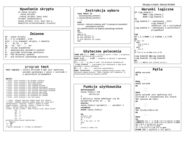 Wywołanie skryptu Zmienne Warunki logiczne Pętle program test