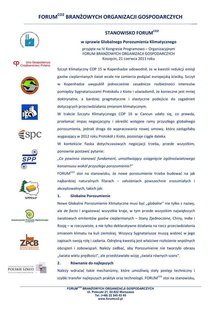 FORUMCO2 BRANŻOWYCH ORGANIZACJI GOSPODARCZYCH ___________________________________________________________________________________________________ ___ STANOWISKO FORUMCO2 w sprawie Globalnego Porozumienia Klimatycznego przyjęte na IV Kongresie Programowo – Organizacyjnym FORUM BRANŻOWYCH ORGANIZACJI GOSPODARCZYCH Koszęcin, 21 czerwca 2011 roku Szczyt Klimatyczny COP 15 w Kopenhadze udowodnił, że w kwestii redukcji emisji gazów cieplarnianych świat wcale nie zamierza podążać europejską ścieżką. Szczyt w Kopenhadze uwypuklił jednocześnie zasadnicze rozbieżności interesów pomiędzy Sygnatariuszami Protokołu z Kioto i uświadomił, że konieczne jest mniej doktrynalne, a bardziej pragmatyczne i elastyczne podejście do zagadnień dotyczących przeciwdziałania zmianom klimatycznym. W trakcie Szczytu Klimatycznego COP 16 w Cancun udało się, co prawda, przełamać impas negocjacyjny i określić wstępne ramy przyszłego globalnego porozumienia, jednak droga do wypracowania nowej umowy, która zastąpiłaby wygasający w 2012 roku Protokół z Kioto, pozostaje ciągle daleka. W kontekście fiaska dotychczasowych negocjacji trzeba, przede wszystkim, ponownie postawić pytanie: „Co powinno stanowić fundament, umożliwiający osiągnięcie ogólnoświatowego konsensusu wokół przyszłego porozumienia?” FORUMCO2 stoi na stanowisku, że nowe porozumienie trzeba budować na jak najbardziej naturalnych filarach – założeniach powszechnie zrozumiałych i akceptowalnych, takich jak: 1. Globalne Porozumienie Nowe Globalne Porozumienie Klimatyczne musi być „globalne” nie tylko z nazwy, ale de facto i angażować wszystkie kraje, w tym przede wszystkim największych światowych emitentów gazów cieplarnianych – Stany Zjednoczone, Chiny, Indie i Rosję – w rzeczywiste, a nie tylko deklaratywne działania na rzecz przeciwdziałania zmianom klimatu na kuli ziemskiej. Wszyscy Sygnatariusze muszą widzieć w jego zapisach swoją rolę i zadania. Odrębną kwestią jest właściwe rozłożenie wspólnych obciążeń i zobowiązań. Należy zadbać, aby Porozumienie nie tworzyło obrazu „świata wielu prędkości”, ale przedstawiało wizję „świata równych szans”. 2. Równanie do najlepszych Należy wdrażać takie mechanizmy, które umożliwią stały postęp techniczny i szybki transfer najlepszych praktyk oraz technologii. FORUMCO2 stoi na stanowisku, FORUMCO2 BRANŻOWYCH ORGANIZACJI GOSPODARCZYCH Ul. Poleczki 21, 02-822 Warszawa Tel. (+48) 22 545 03 65 www.forumco2.pl FORUMCO2 BRANŻOWYCH ORGANIZACJI GOSPODARCZYCH że założenie to można spełnić jedynie wtedy, gdy cele redukcyjne oraz sposób alokacji uprawnień do emisji zostaną oparte o system Benchmarkingu, opracowany indywidualnie dla poszczególnych branż, przy uwzględnieniu technologii produkcji oraz stosowanych paliw i surowców. Aukcje nie powinny być fundamentem systemu, lecz narzędziem wspierającym, którego podstawowym zadaniem byłoby umożliwienie przedsiębiorcom zbilansowania swojego portfela uprawnień. Oparcie systemu alokacji uprawnień o otwarty mechanizm aukcji promowałoby najbogatszych, stwarzając dodatkowo pole do podejmowania wrogich działań spekulacyjnych, mogących doprowadzić do zachwiania globalnej równowagi konkurencyjnej. 3. Uczciwa konkurencja System musi gwarantować, że żaden z Producentów nie uzyska przewagi konkurencyjnej tylko dlatego, że w miejscu, w którym wytwarza swój produkt koszty redukcji emisji gazów cieplarnianych są w nieuzasadniony sposób niższe. W przeciwnym wypadku nie uda się uniknąć nieuczciwej konkurencji, ani zahamować procesu „Carbon Leakage”. Należy poszukiwać skutecznych narzędzi wspierających realizację tego postulatu. Na straży uczciwej globalnej konkurencji powinien stać ogólnoświatowy, wiarygodny i przejrzysty System Monitoringu, obejmujący zarówno proces zbierania i weryfikacji danych źródłowych, jak i kontrolę realizacji podejmowanych działań oraz przyjętych zobowiązań we wszystkich krajach, będących Stronami Porozumienia. 4. Optymalne wykorzystanie zasobów System powinien zachęcać i motywować do podejmowania działań pro-efektywnościowych nie tylko u siebie, ale także na zewnątrz obszaru swojego działania. System musi zatem być Elastyczny i uwzględniać Uwarunkowania lokalne, umożliwiając pełne wykorzystywanie lokalnych zasobów oraz infrastruktury – w Polsce powinien np. sprzyjać rozwojowi Energetyki Przemysłowej oraz wspierać Modernizację Systemów Ciepła Sieciowego, stanowiących podstawę zaopatrzenia w ciepło ponad 40% Polaków. 5. Podejmowanie zobowiązań na miarę swoich możliwości Postulat ten oznacza, że zarówno światowe potęgi gospodarcze, jak i najsłabsze ekonomicznie państwa, powinny przyjąć na siebie konkretne zobowiązanie, określające dopuszczalny limit emisji gazów cieplarnianych – zobowiązanie, uwzględniające wszelkie lokalne uwarunkowania, stanowiące ambitne, ale możliwe do wypełnienia wyzwanie. Tylko takie podejście zapewni pełną Integrację społeczności międzynarodowej wokół wspólnie określonych celów oraz spowoduje, że każdy Sygnatariusz Porozumienia będzie czuł się Współodpowiedzialny za jego realizację. 6. Wyrównywanie szans System finansowania przedsięwzięć pro-redukcyjnych powinien umożliwiać szybki wzrost gospodarczy krajów rozwijających się i budowanie tam nowoczesnej, niskoemisyjnej gospodarki. System nie może pogłębiać obecnych podziałów i dysproporcji, ale musi sprzyjać systematycznemu zacieraniu się różnic w poziomie życia zarówno w skali regionalnej, jak i w wymiarze globalnym. FORUMCO2 BRANŻOWYCH ORGANIZACJI GOSPODARCZYCH Postulat ten ma uniwersalne zastosowanie i np. w odniesieniu do Wspólnoty Europejskiej powinien być zrealizowany w ramach nowego porozumienia „Burden Sharing”. 7. Zapewnienie środków na realizację celów Kraje rozwinięte muszą zapewnić niezbędn