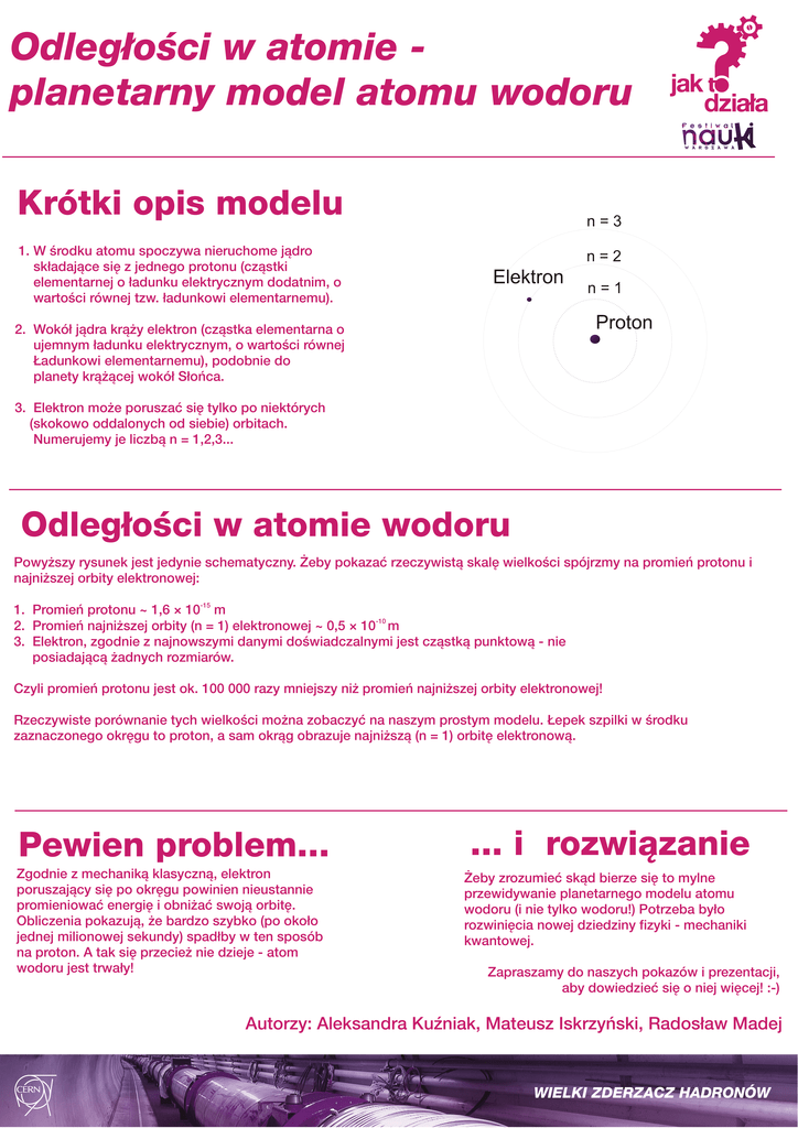 Odległości w atomie planetarny model atomu wodoru Krótki opis modelu 1. W środku atomu spoczywa nieruchome jądro składające się z jednego protonu (cząstki elementarnej o ładunku elektrycznym dodatnim, o wartości równej tzw. ładunkowi elementarnemu). n=3 n=2 Elektron n=1 Proton 2. Wokół jądra krąży elektron (cząstka elementarna o ujemnym ładunku elektrycznym, o wartości równej Ładunkowi elementarnemu), podobnie do planety krążącej wokół Słońca. 3. Elektron może poruszać się tylko po niektórych (skokowo oddalonych od siebie) orbitach. Numerujemy je liczbą n = 1,2,3... Odległości w atomie wodoru Powyższy rysunek jest jedynie schematyczny. Żeby pokazać rzeczywistą skalę wielkości spójrzmy na promień protonu i najniższej orbity elektronowej: -15 1. Promień protonu ~ 1,6 × 10 m -10 2. Promień najniższej orbity (n = 1) elektronowej ~ 0,5 × 10 m 3. Elektron, zgodnie z najnowszymi danymi doświadczalnymi jest cząstką punktową - nie posiadającą żadnych rozmiarów. Czyli promień protonu jest ok. 100 000 razy mniejszy niż promień najniższej orbity elektronowej! Rzeczywiste porównanie tych wielkości można zobaczyć na naszym prostym modelu. Łepek szpilki w środku zaznaczonego okręgu to proton, a sam okrąg obrazuje najniższą (n = 1) orbitę elektronową. Pewien problem... Zgodnie z mechaniką klasyczną, elektron poruszający się po okręgu powinien nieustannie promieniować energię i obniżać swoją orbitę. Obliczenia pokazują, że bardzo szybko (po około jednej milionowej sekundy) spadłby w ten sposób na proton. A tak się przecież nie dzieje - atom wodoru jest trwały! ... i rozwiązanie Żeby zrozumieć skąd bierze się to mylne przewidywanie planetarnego modelu atomu wodoru (i nie tylko wodoru!) Potrzeba było rozwinięcia nowej dziedziny fizyki - mechaniki kwantowej. Zapraszamy do naszych pokazów i prezentacji, aby dowiedzieć się o niej więcej! :-) Autorzy: Aleksandra Kuźniak, Mateusz Iskrzyński, Radosław Madej WIELKI ZDERZACZ HADRONÓW