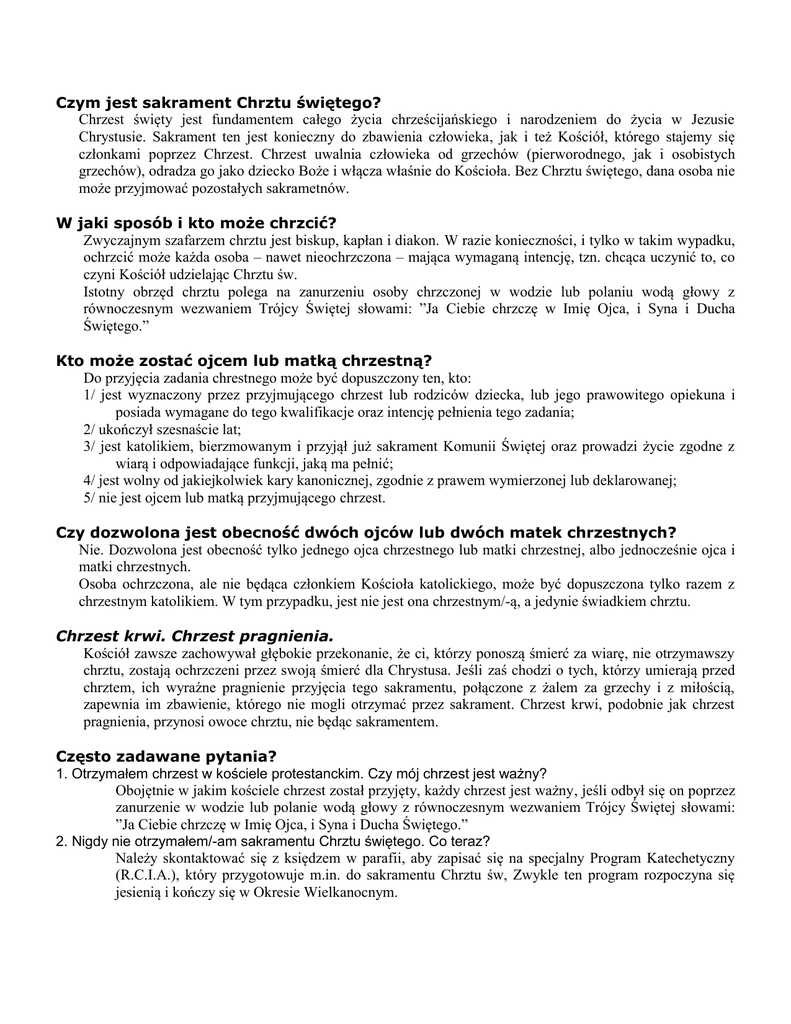 Czym jest sakrament Chrztu świętego? Chrzest święty jest fundamentem całego życia chrześcijańskiego i narodzeniem do życia w Jezusie Chrystusie. Sakrament ten jest konieczny do zbawienia człowieka, jak i też Kościół, którego stajemy się członkami poprzez Chrzest. Chrzest uwalnia człowieka od grzechów (pierworodnego, jak i osobistych grzechów), odradza go jako dziecko Boże i włącza właśnie do Kościoła. Bez Chrztu świętego, dana osoba nie może przyjmować pozostałych sakrametnów. W jaki sposób i kto może chrzcić? Zwyczajnym szafarzem chrztu jest biskup, kapłan i diakon. W razie konieczności, i tylko w takim wypadku, ochrzcić może każda osoba – nawet nieochrzczona – mająca wymaganą intencję, tzn. chcąca uczynić to, co czyni Kościół udzielając Chrztu św. Istotny obrzęd chrztu polega na zanurzeniu osoby chrzczonej w wodzie lub polaniu wodą głowy z równoczesnym wezwaniem Trójcy Świętej słowami: ”Ja Ciebie chrzczę w Imię Ojca, i Syna i Ducha Świętego.” Kto może zostać ojcem lub matką chrzestną? Do przyjęcia zadania chrestnego może być dopuszczony ten, kto: 1/ jest wyznaczony przez przyjmującego chrzest lub rodziców dziecka, lub jego prawowitego opiekuna i posiada wymagane do tego kwalifikacje oraz intencję pełnienia tego zadania; 2/ ukończył szesnaście lat; 3/ jest katolikiem, bierzmowanym i przyjął już sakrament Komunii Świętej oraz prowadzi życie zgodne z wiarą i odpowiadające funkcji, jaką ma pełnić; 4/ jest wolny od jakiejkolwiek kary kanonicznej, zgodnie z prawem wymierzonej lub deklarowanej; 5/ nie jest ojcem lub matką przyjmującego chrzest. Czy dozwolona jest obecność dwóch ojców lub dwóch matek chrzestnych? Nie. Dozwolona jest obecność tylko jednego ojca chrzestnego lub matki chrzestnej, albo jednocześnie ojca i matki chrzestnych. Osoba ochrzczona, ale nie będąca członkiem Kościoła katolickiego, może być dopuszczona tylko razem z chrzestnym katolikiem. W tym przypadku, jest nie jest ona chrzestnym/-ą, a jedynie świadkiem chrztu. Chrzest krwi. Chrzest pragnienia. Kościół zawsze zachowywał głębokie przekonanie, że ci, którzy ponoszą śmierć za wiarę, nie otrzymawszy chrztu, zostają ochrzczeni przez swoją śmierć dla Chrystusa. Jeśli zaś chodzi o tych, którzy umierają przed chrztem, ich wyraźne pragnienie przyjęcia tego sakramentu, połączone z żalem za grzechy i z miłością, zapewnia im zbawienie, którego nie mogli otrzymać przez sakrament. Chrzest krwi, podobnie jak chrzest pragnienia, przynosi owoce chrztu, nie będąc sakramentem. Często zadawane pytania? 1. Otrzymałem chrzest w kościele protestanckim. Czy mój chrzest jest ważny? Obojętnie w jakim kościele chrzest został przyjęty, każdy chrzest jest ważny, jeśli odbył się on poprzez zanurzenie w wodzie lub polanie wodą głowy z równoczesnym wezwaniem Trójcy Świętej słowami: ”Ja Ciebie chrzczę w Imię Ojca, i Syna i Ducha Świętego.” 2. Nigdy nie otrzymałem/-am sakramentu Chrztu świętego. Co teraz? Należy skontaktować się z księdzem w parafii, aby zapisać się na specjalny Program Katechetyczny (R.C.I.A.), który przygotowuje m.in. do sakramentu Chrztu św, Zwykle ten program rozpoczyna się jesienią i kończy się w Okresie Wielkanocnym.